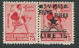 1945 - Occupazione straniera di territori italiani - Occupazione jugoslava di Fiume - Francobolli d’Italia del 1944-45 (Monumenti distrutti) sovrastampati - 16l. su 75c. rosa carminio - Coppia orrizontale di cui uno senza soprastampa (Sass. 19d)