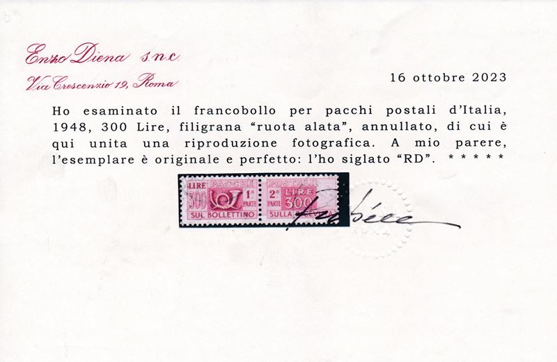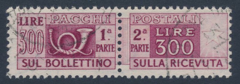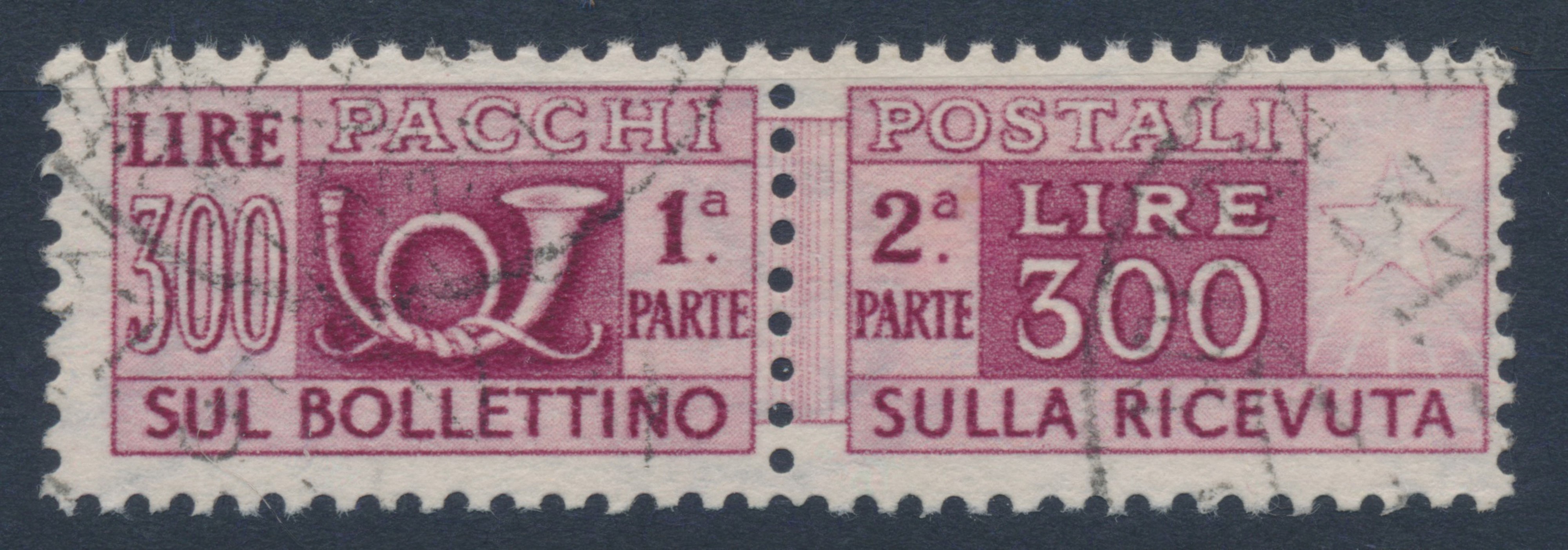 1948 – Repubblica italiana – Pacchi postali 300 lire lilla bruno, filigrana ruota, usato (Sass. 79).