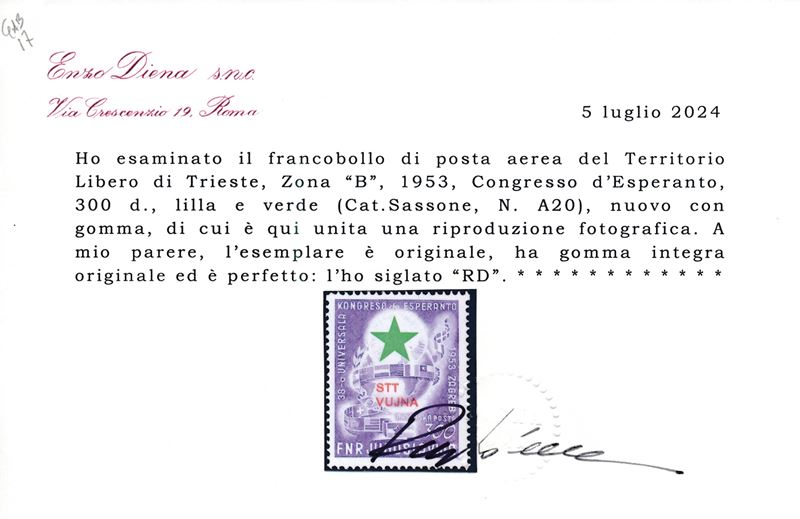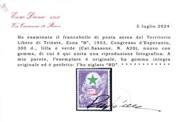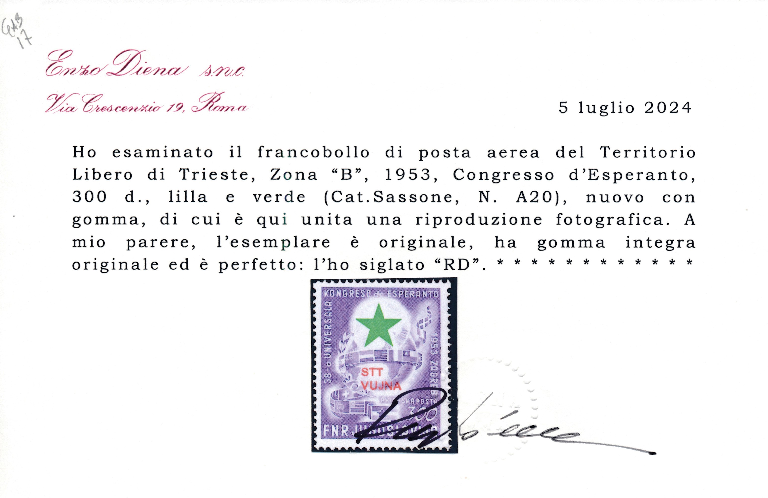 1953 - Territorio libero di Trieste – Zona B – Posta Aerea – “Congresso esperanto”, 300 d. violetto e verde (Sass. A20).
