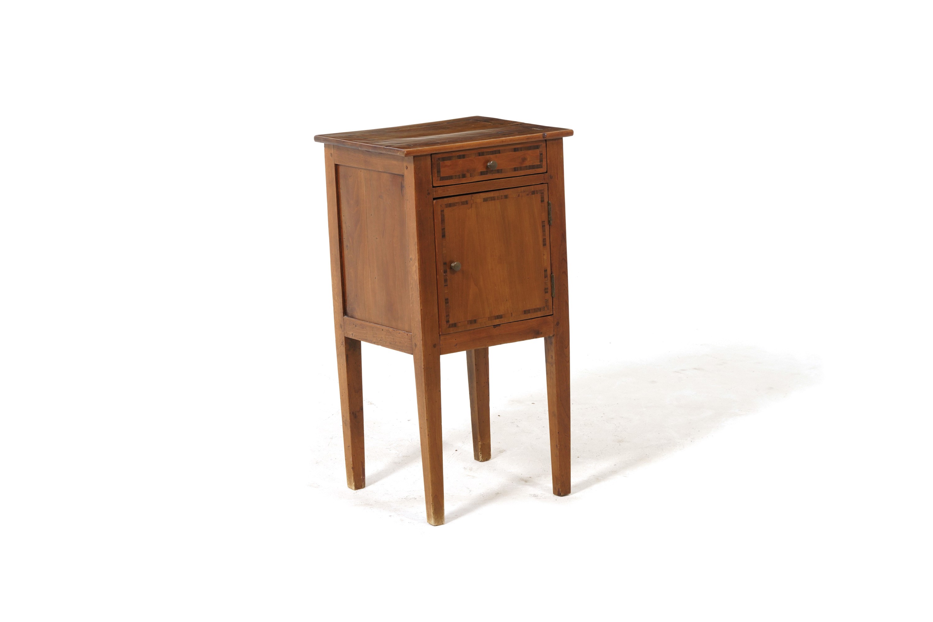 Comodino ad un'anta ed un cassetto in legno lastronato e intarsiato. XIX secolo
