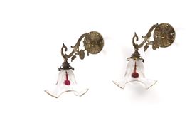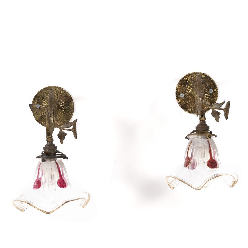 Coppia di appliques Liberty in bronzo dorato e diffusore in vetro. XX secolo