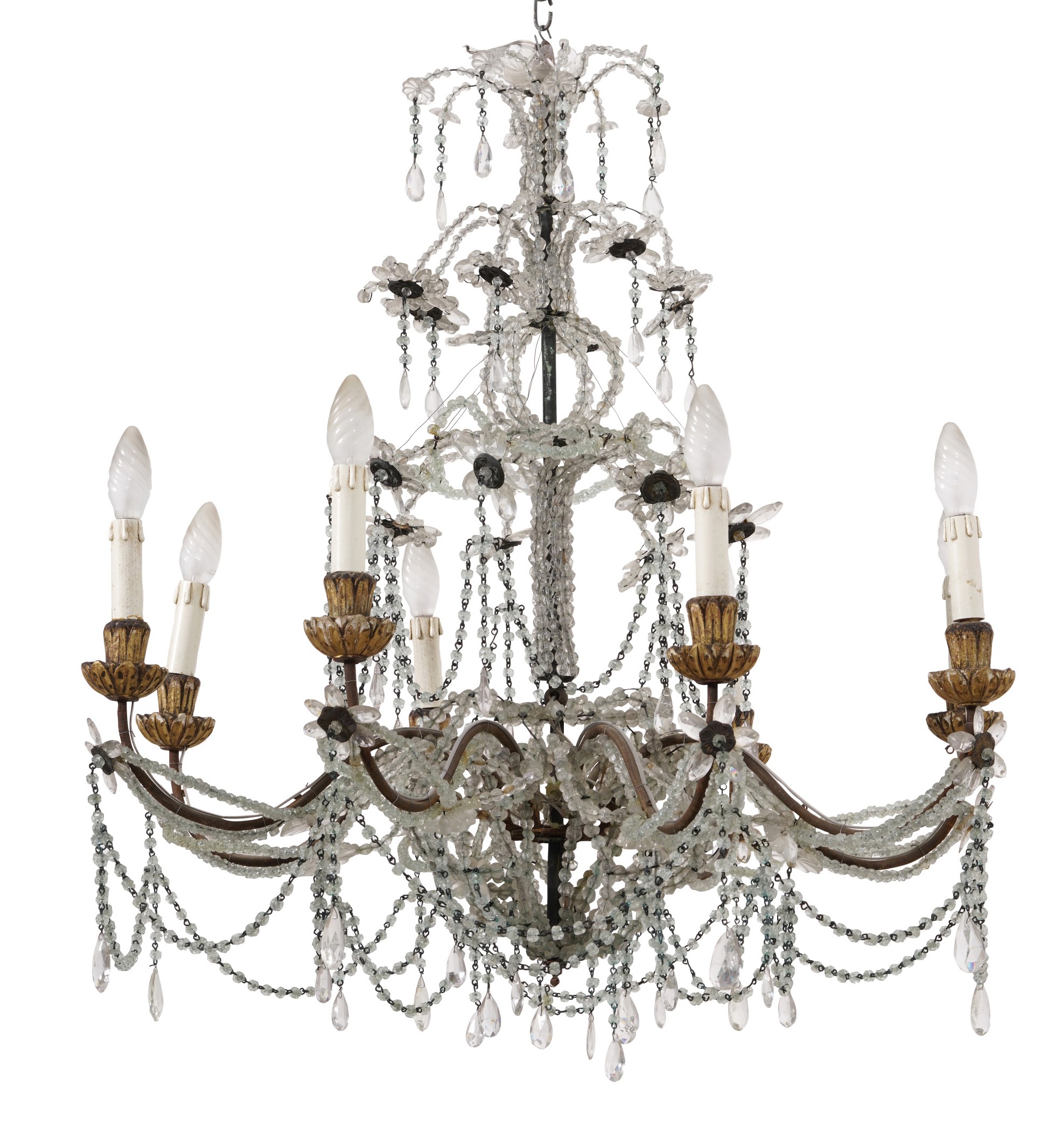 Lampadario a otto luci in metallo e cristalli. XIX secolo