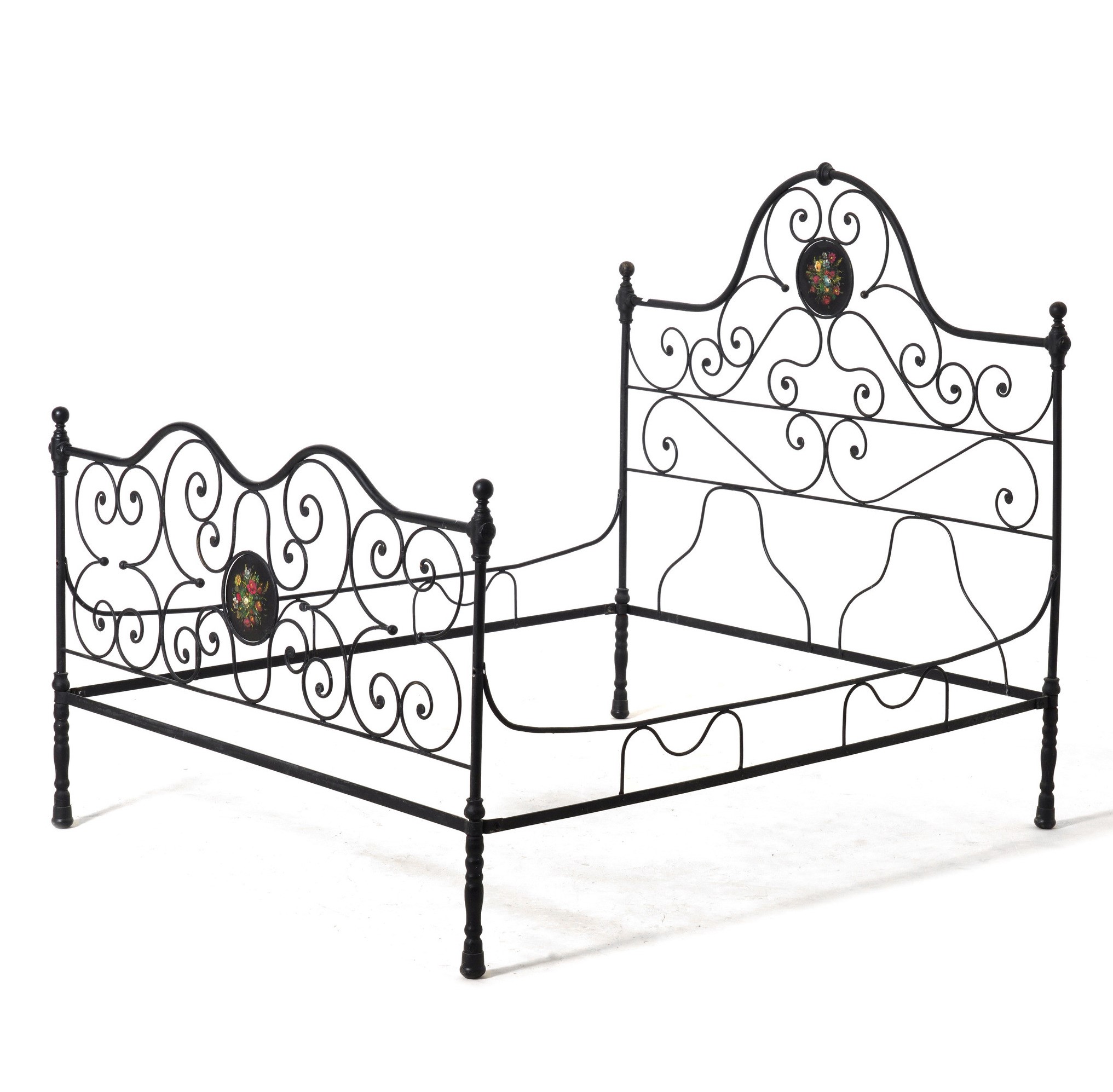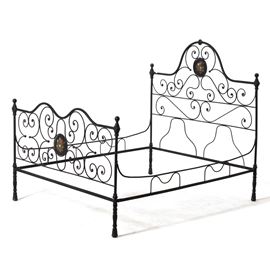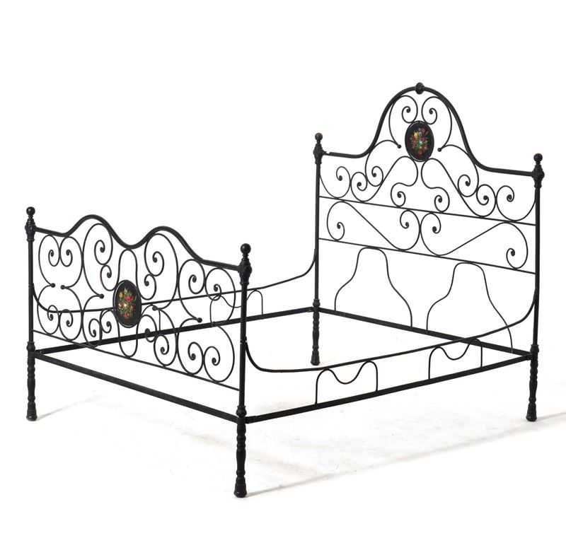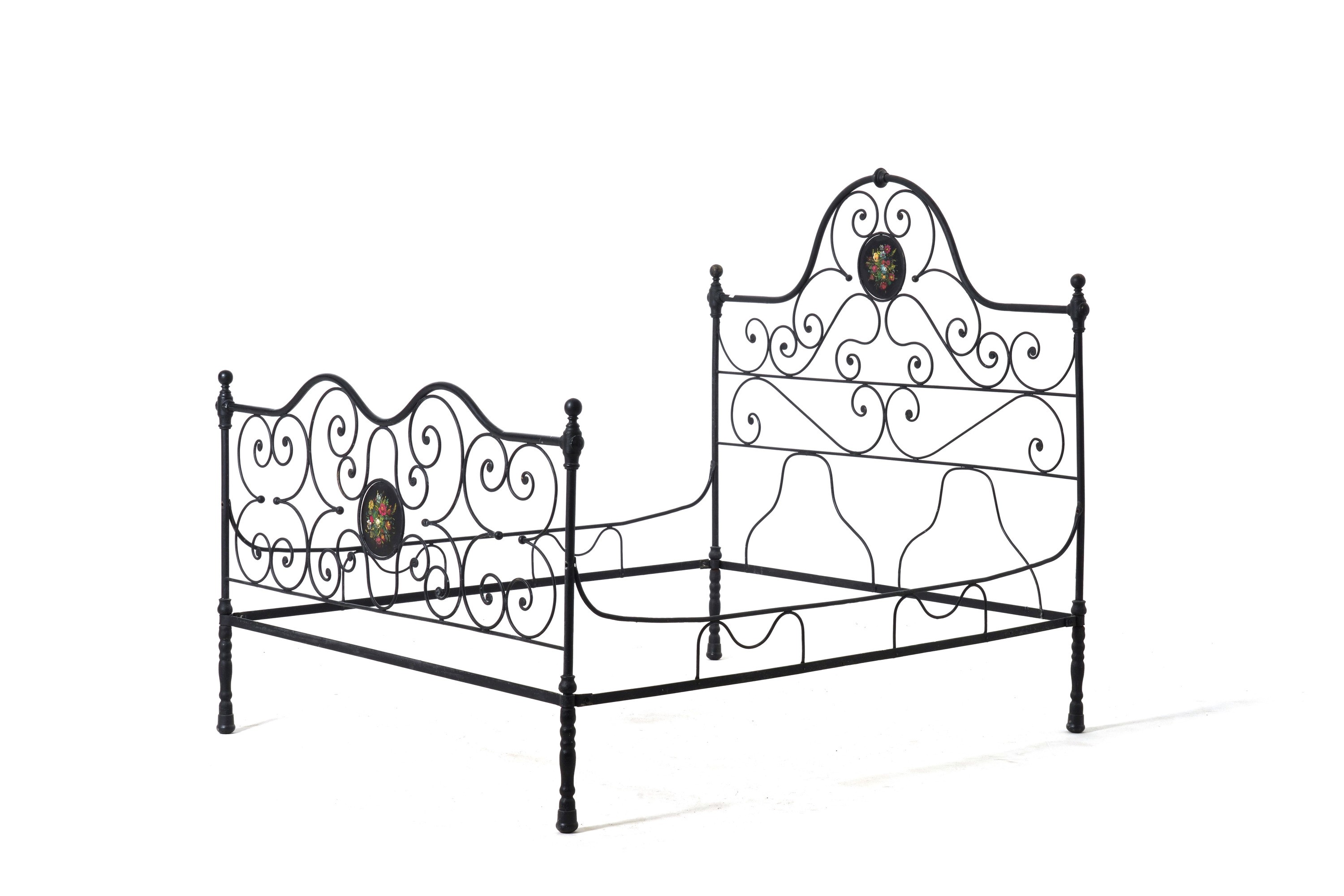 Lavorato a riccioli e volute, nella testiera e nella pediera medaglioni dipinti a bouquet di fiori