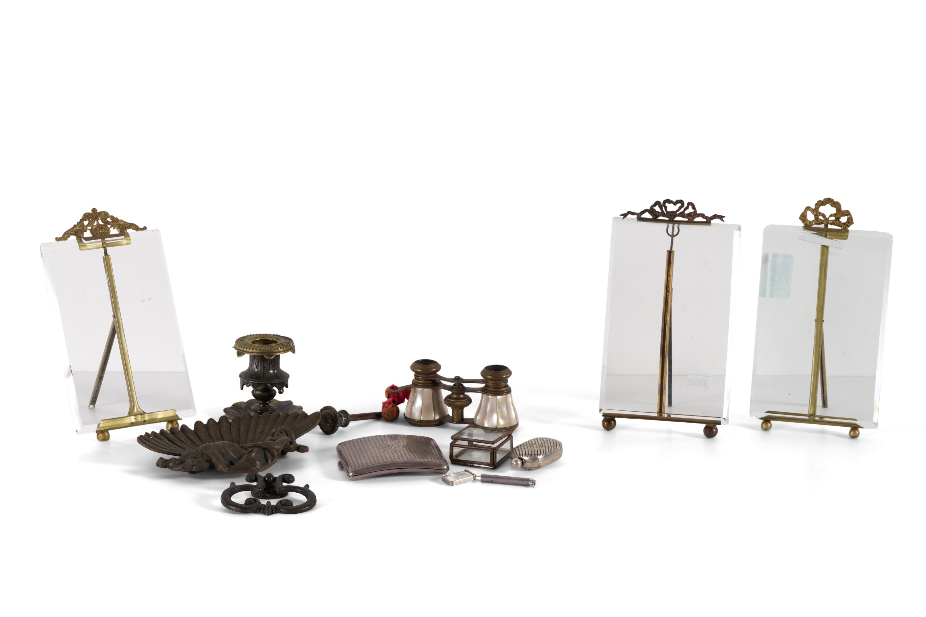 Tra cui un binocolo con decorazioni in madreperla, un portasigarette, una lente e tre cornici portafoto