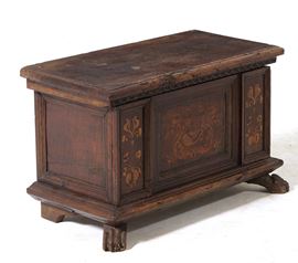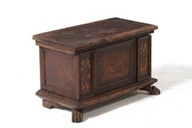 Piccola cassapanca in legno intarsiato. Mantova, XVI secolo