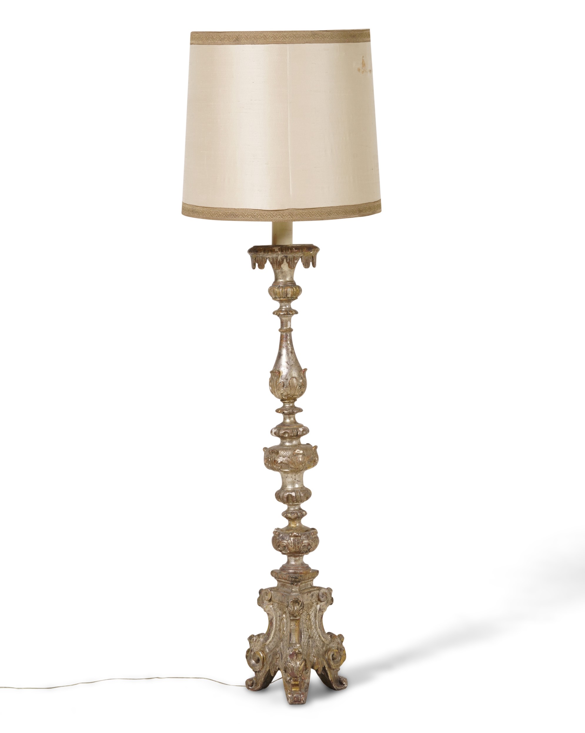 Torciera tornita in legno intagliato e argentato. XVIII secolo