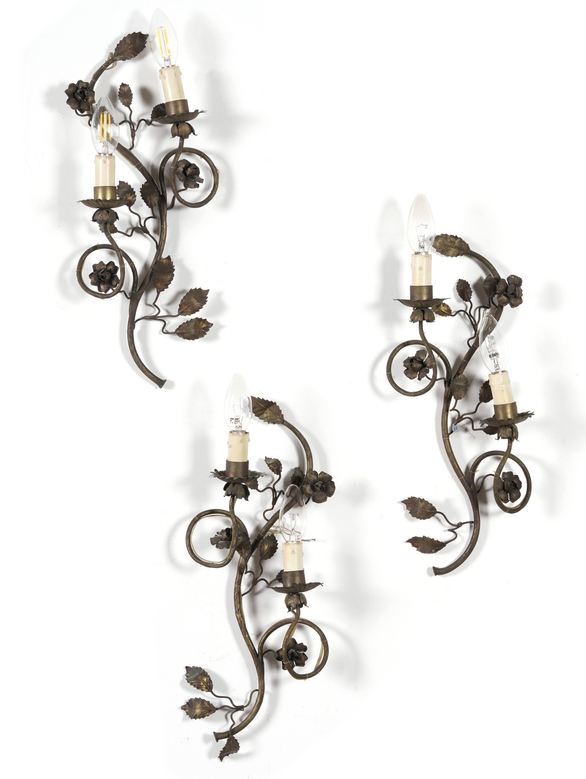 Tre appliques a due luci in metallo. XX secolo