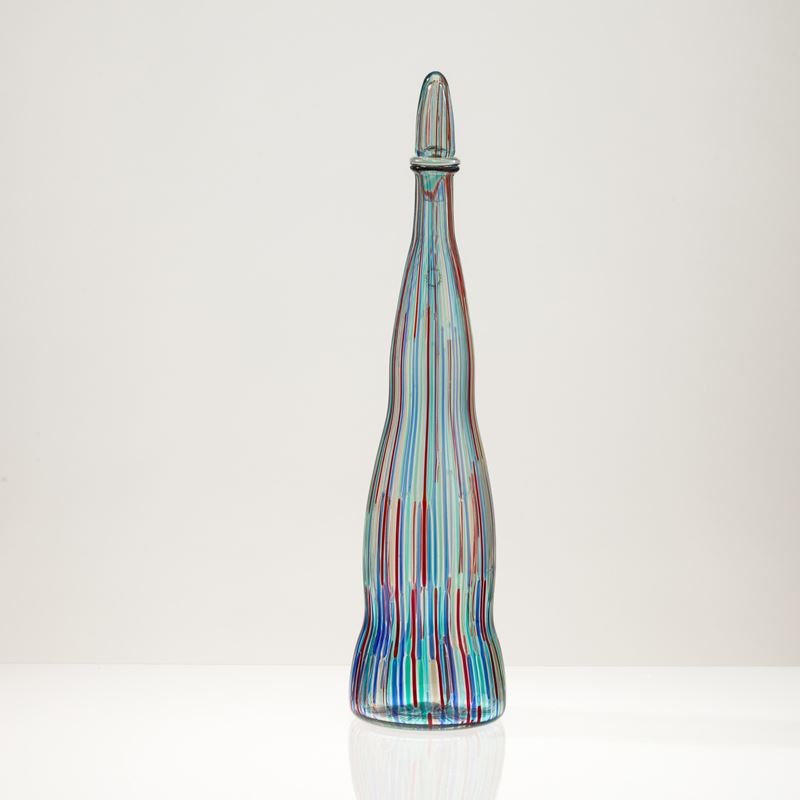 Bottiglia Amboise in vetro soffiato con decoro di canne verde mela, ciclamino e adriatico.