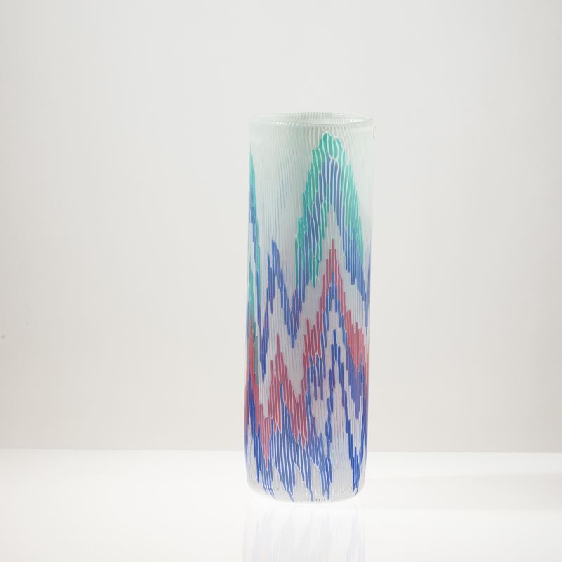 Vaso serie Fiamme di forma troncoconica a sezione ovale in vetro soffiato con decoro di mosaico di canne policrome.