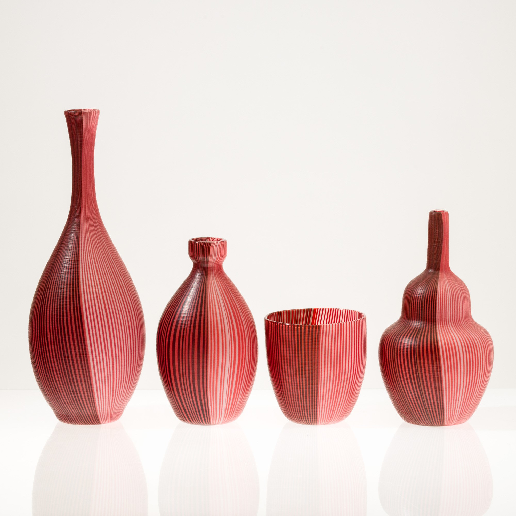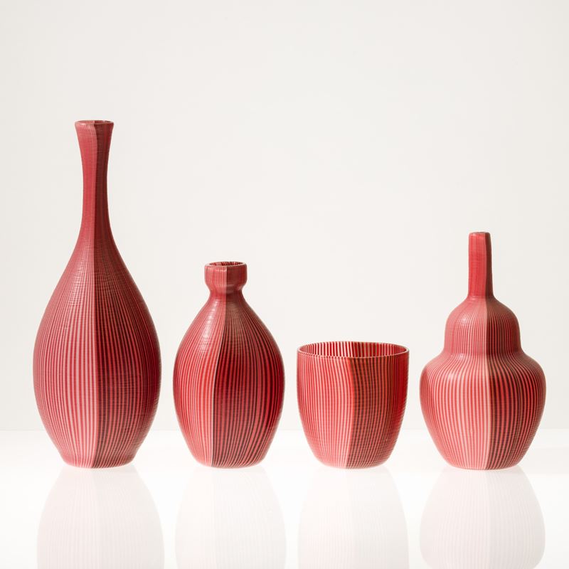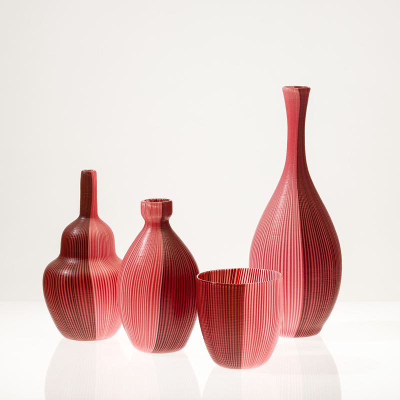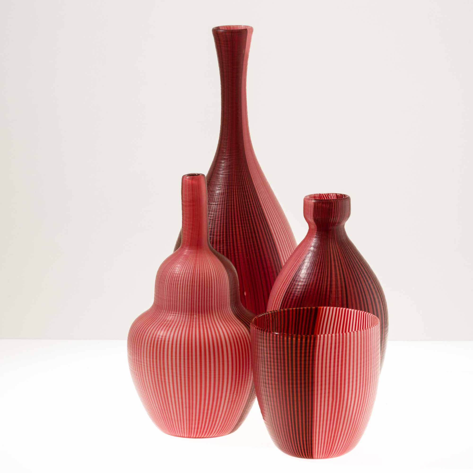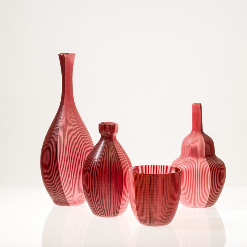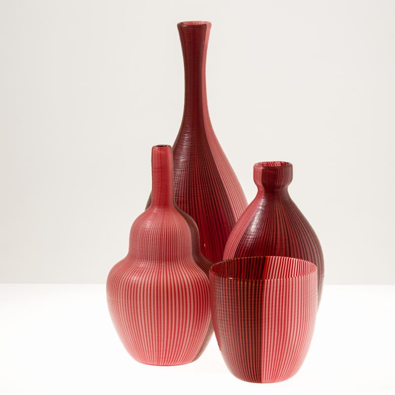 Collezione di quattro vasi serie Tessuti in vetro soffiato con decoro di canne bicolori con superficie interamente battuta alla mola.
