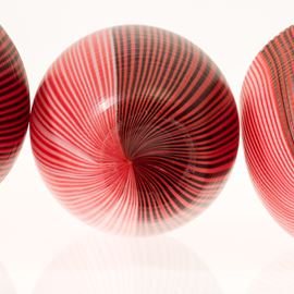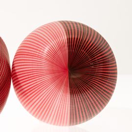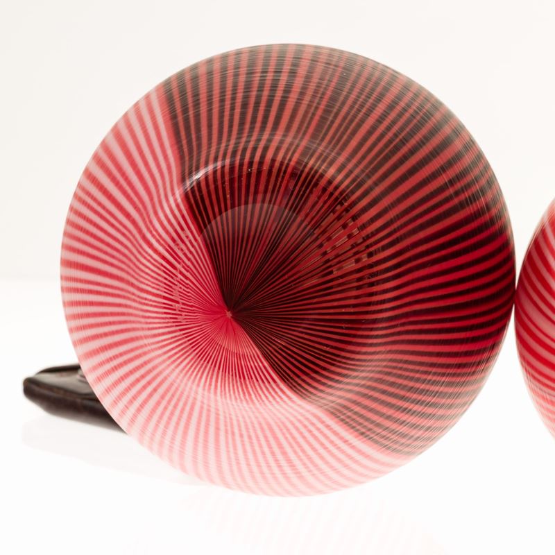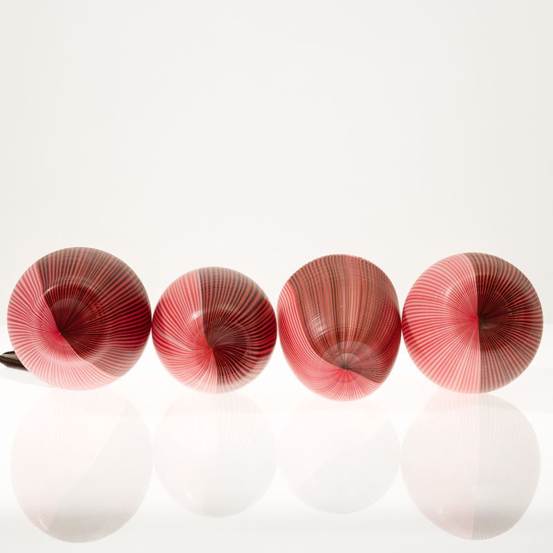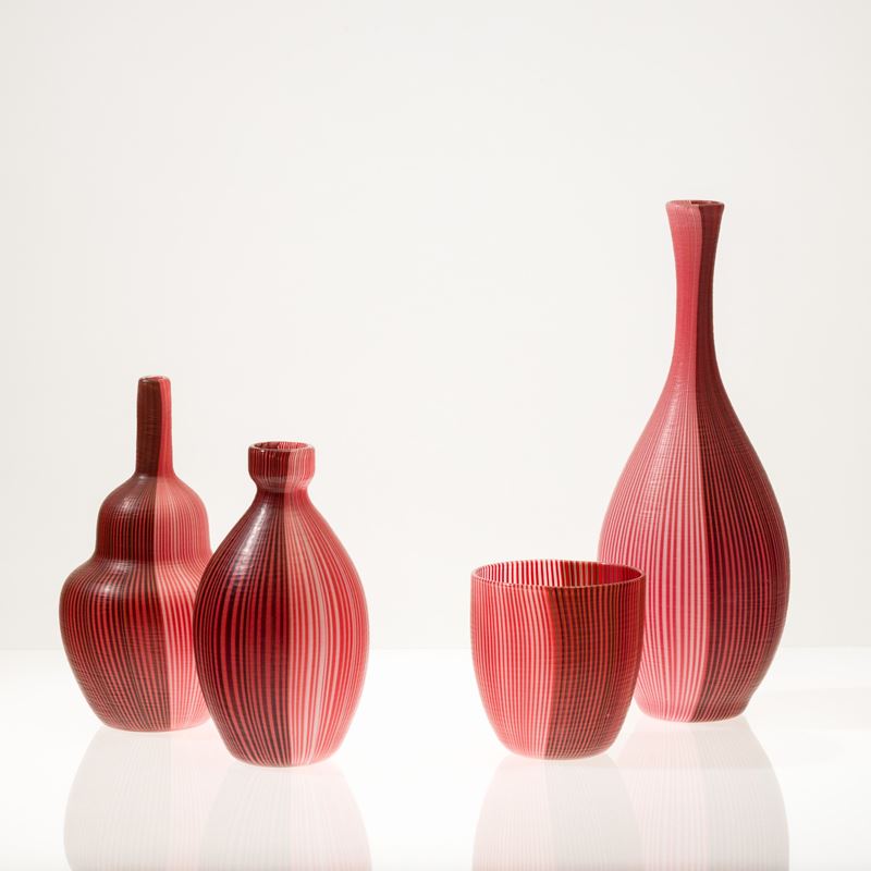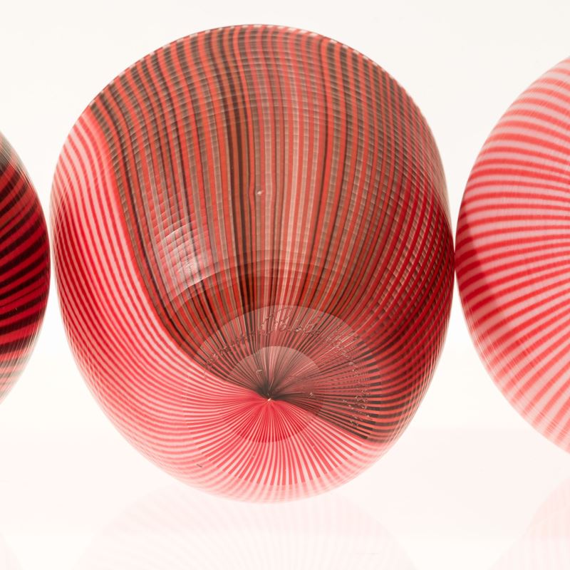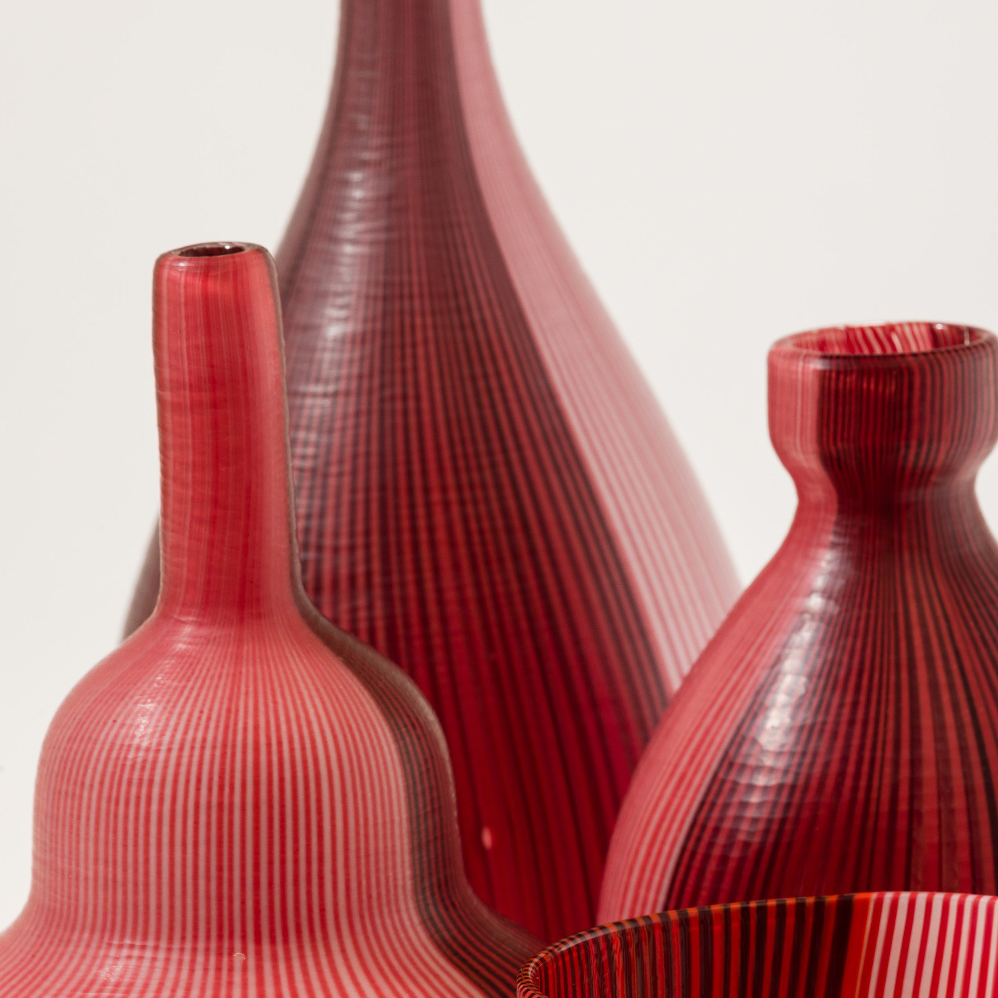 Collezione di quattro vasi serie Tessuti in vetro soffiato con decoro di canne bicolori con superficie interamente battuta alla mola.
