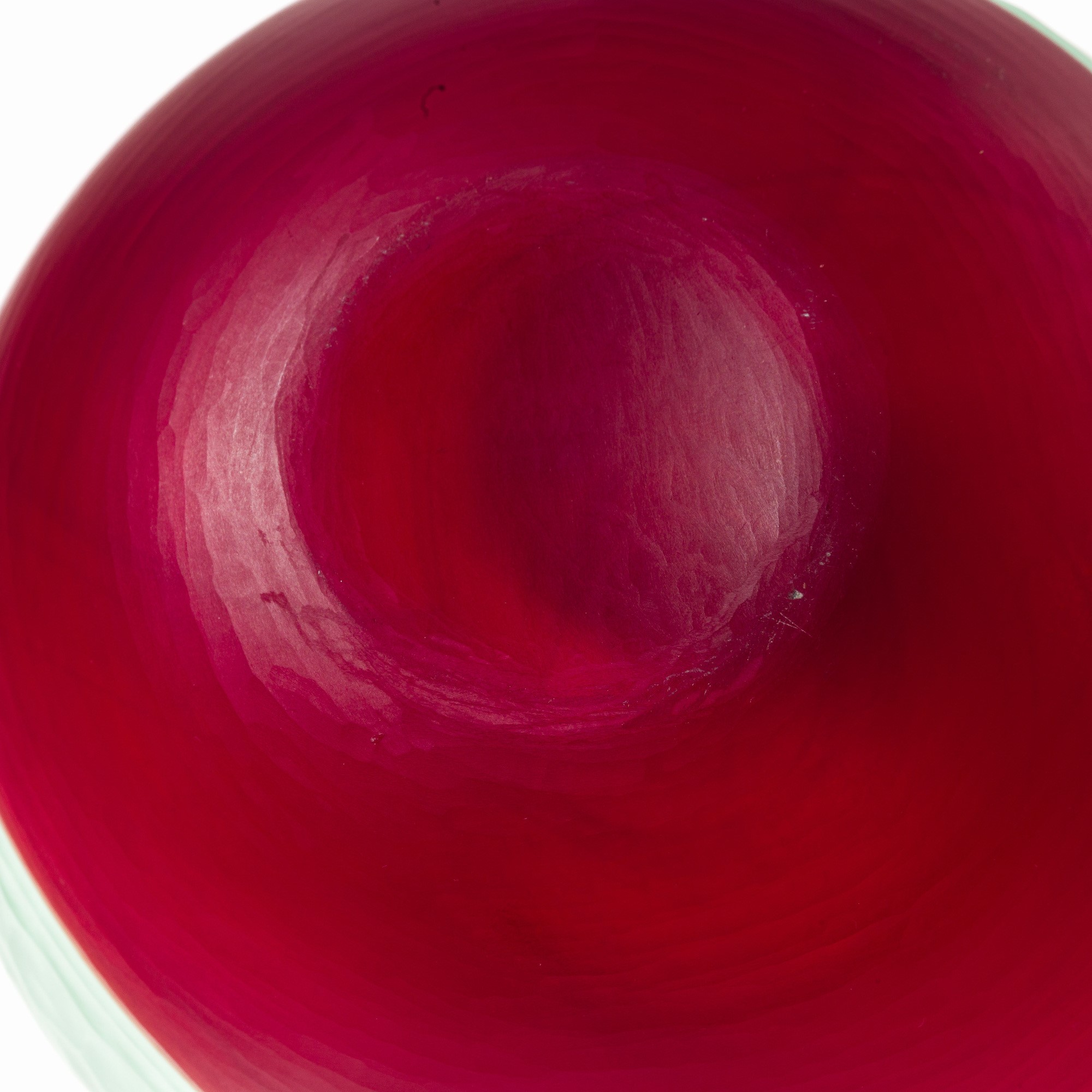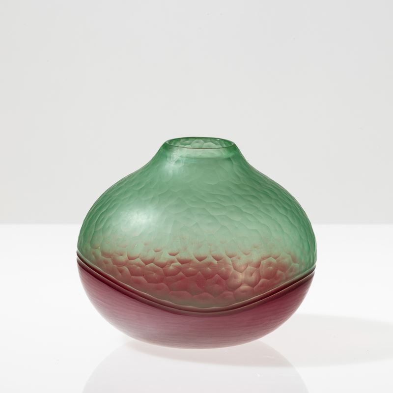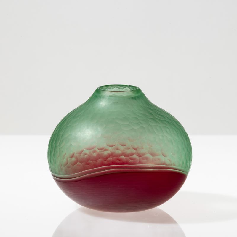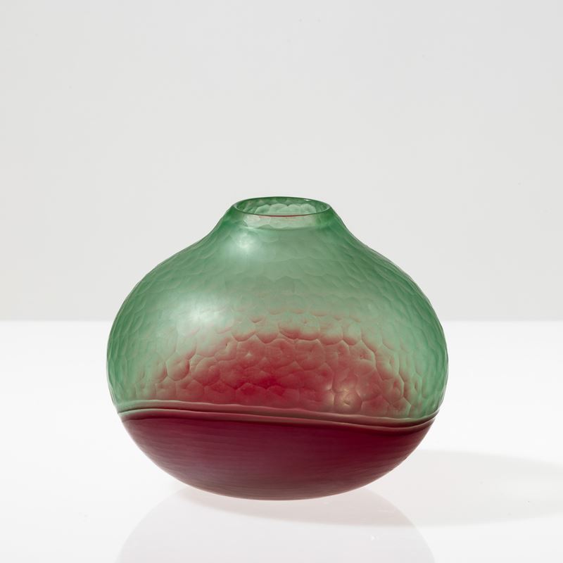 Vaso serie Battuto Bicolore in vetro soffiato verdognolo e rosso.