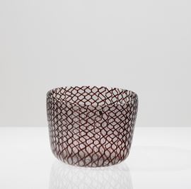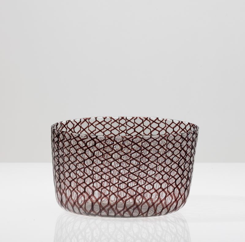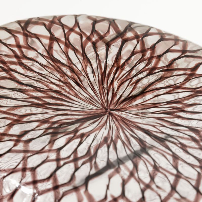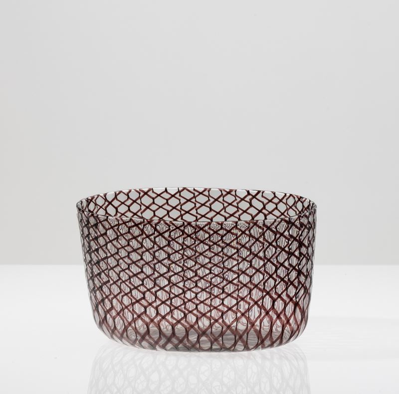 Coppa ovale in vetro soffiato zanfirico con decoro di canne ametista.