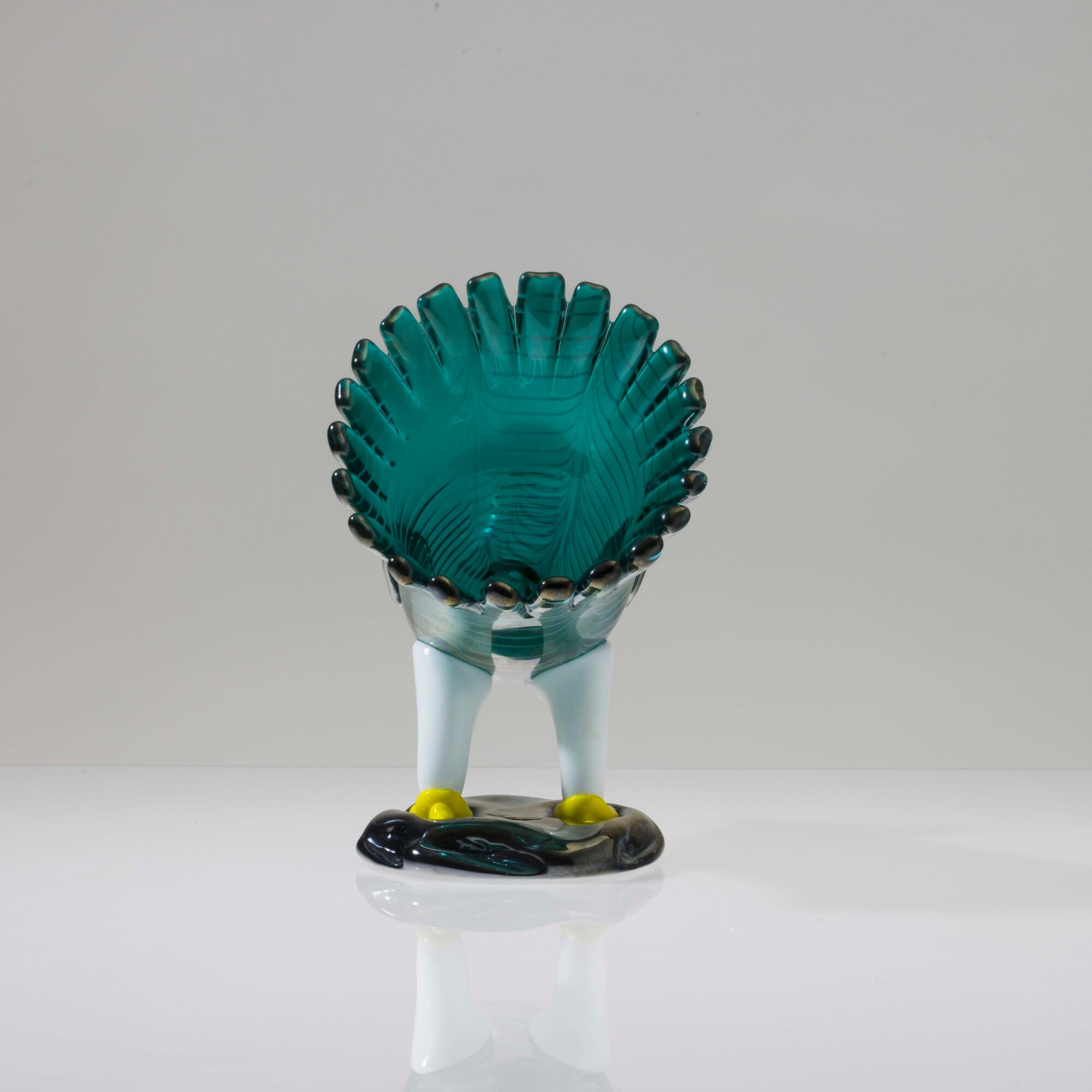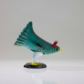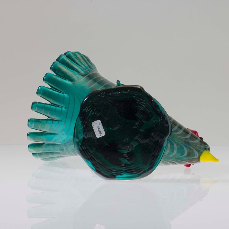 Soprammobile in forma di gallina in verde iridato con decoro di canne lattimo. Basamento a disco in vetro iridescente.