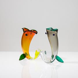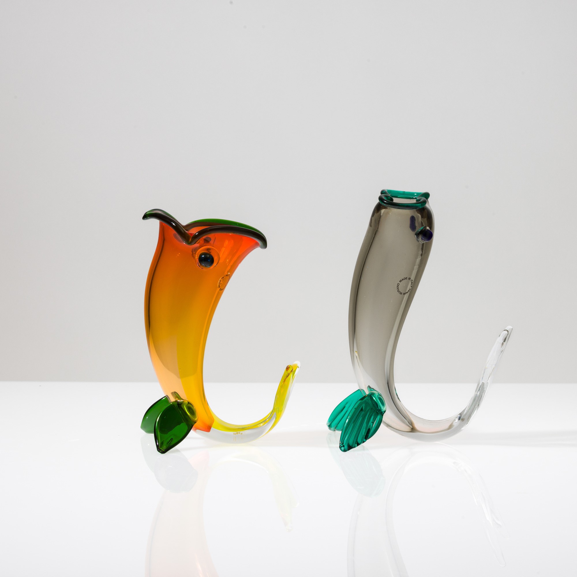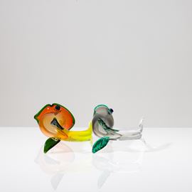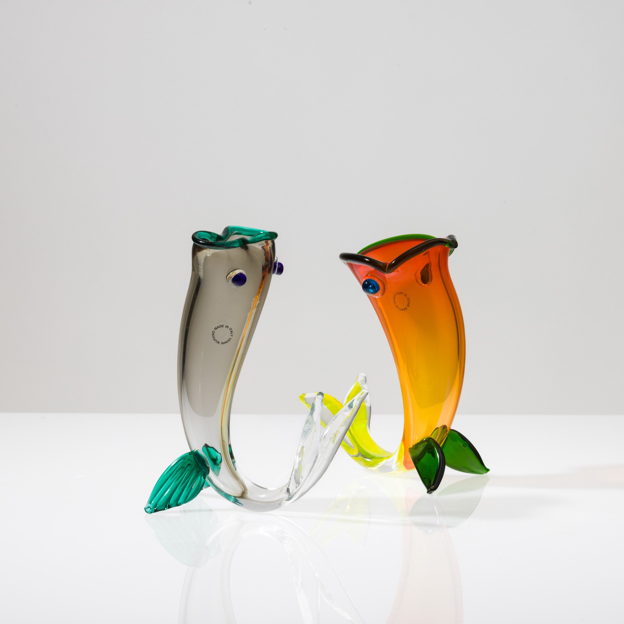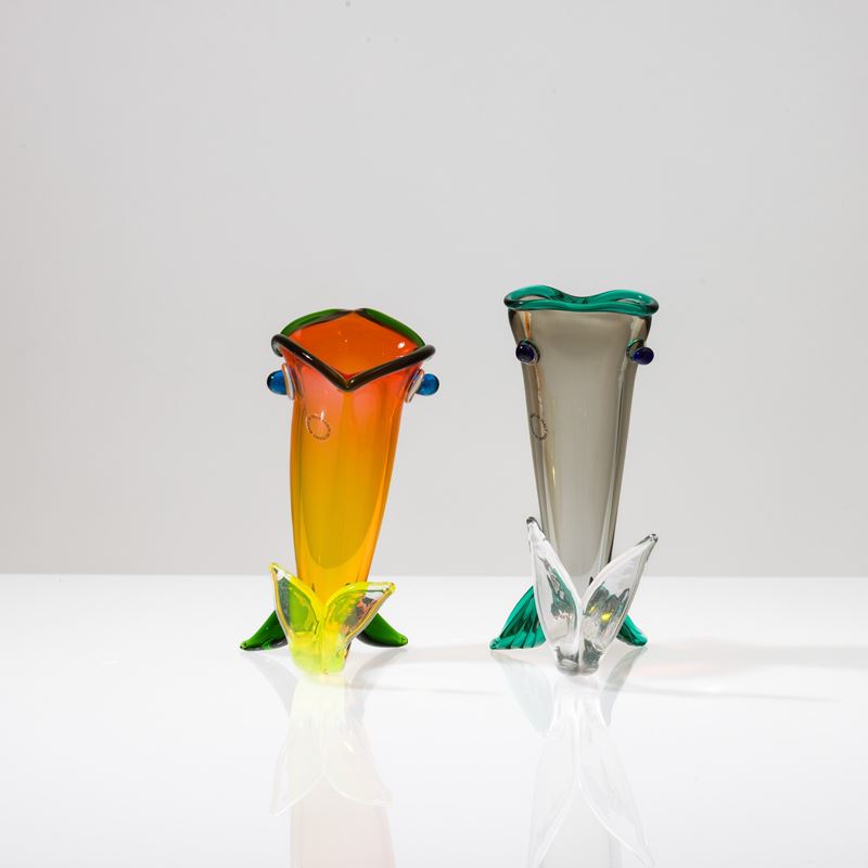 Lotto di due soprammobili in forma di pesce in vetro soffiato multicolore. Firma a punta Venini 95 Fulvio Bianconi e Venini 98 Fulvio Bianconi e vecchie etichette.