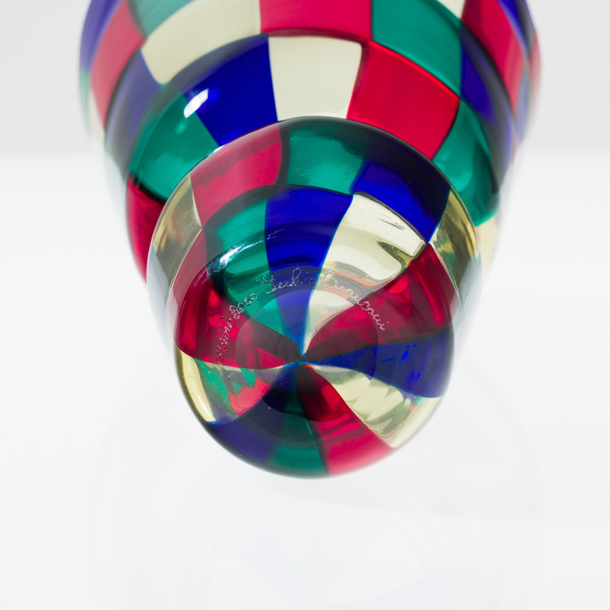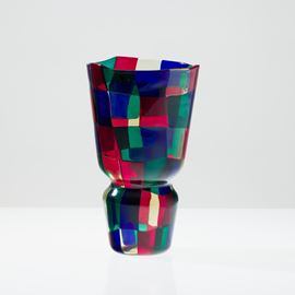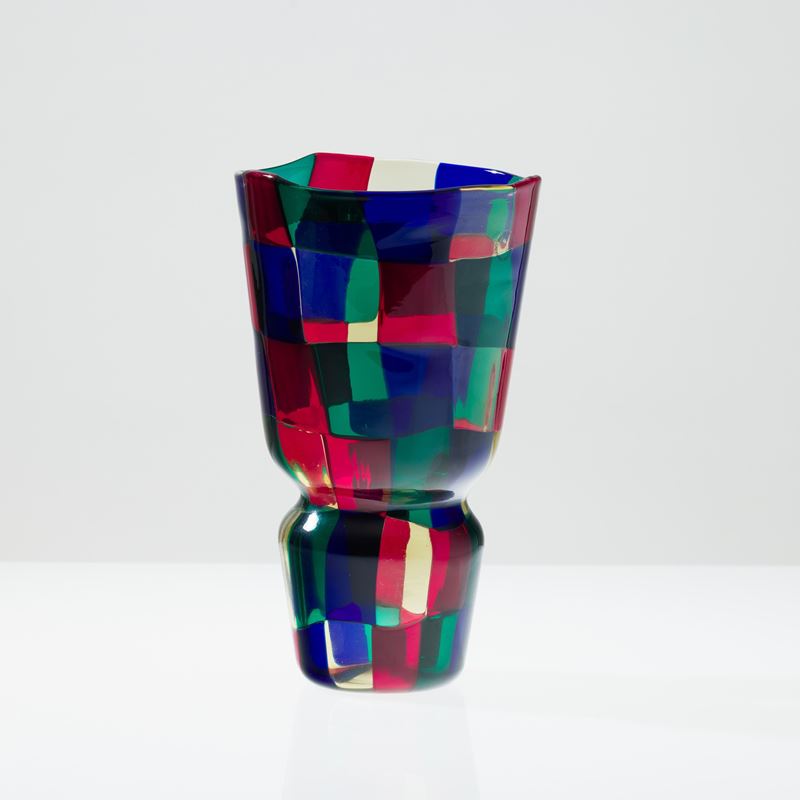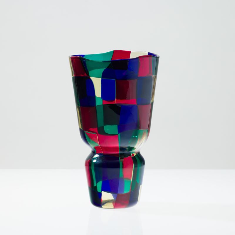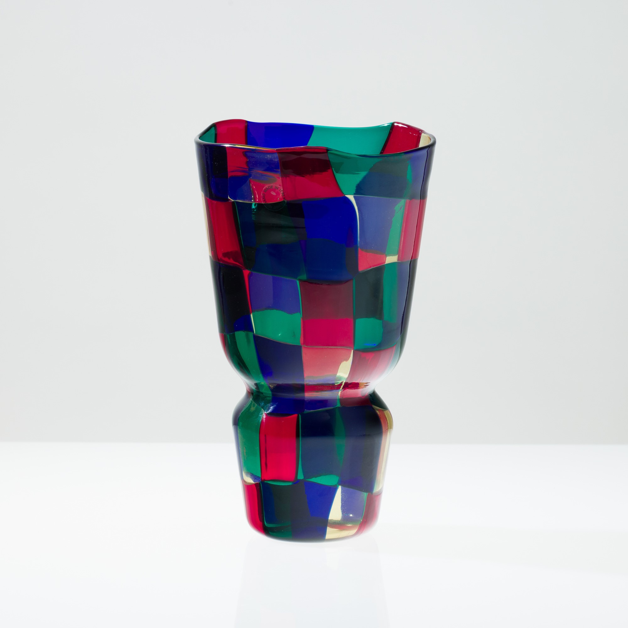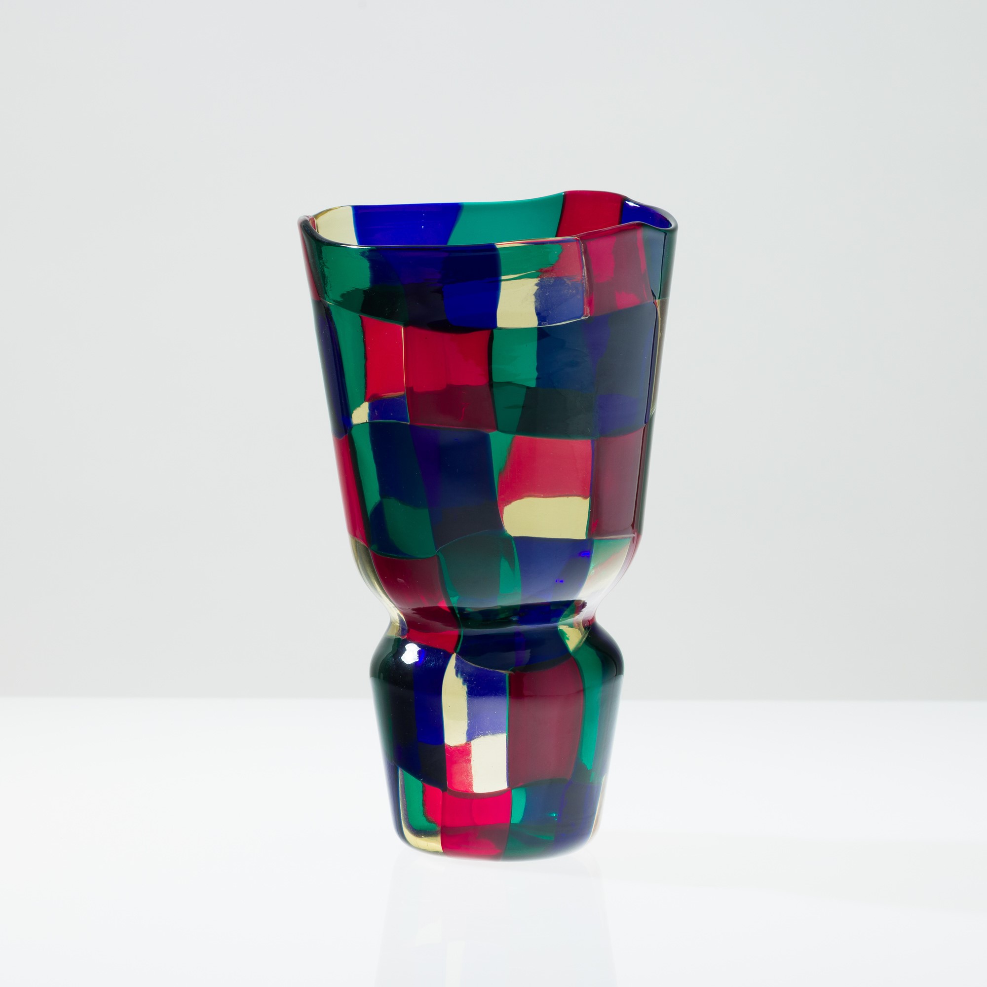 Vaso troncoconico con strozzatura serie Pezzati in vetro soffiato con decoro di tessere multicolori nella variante Parigi.