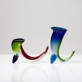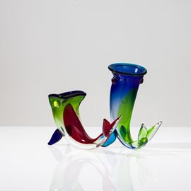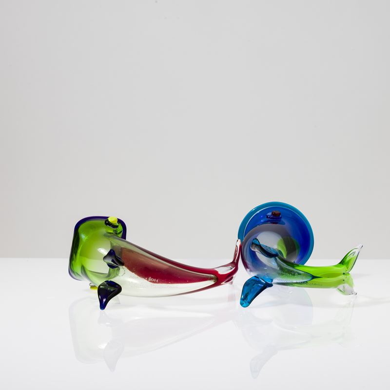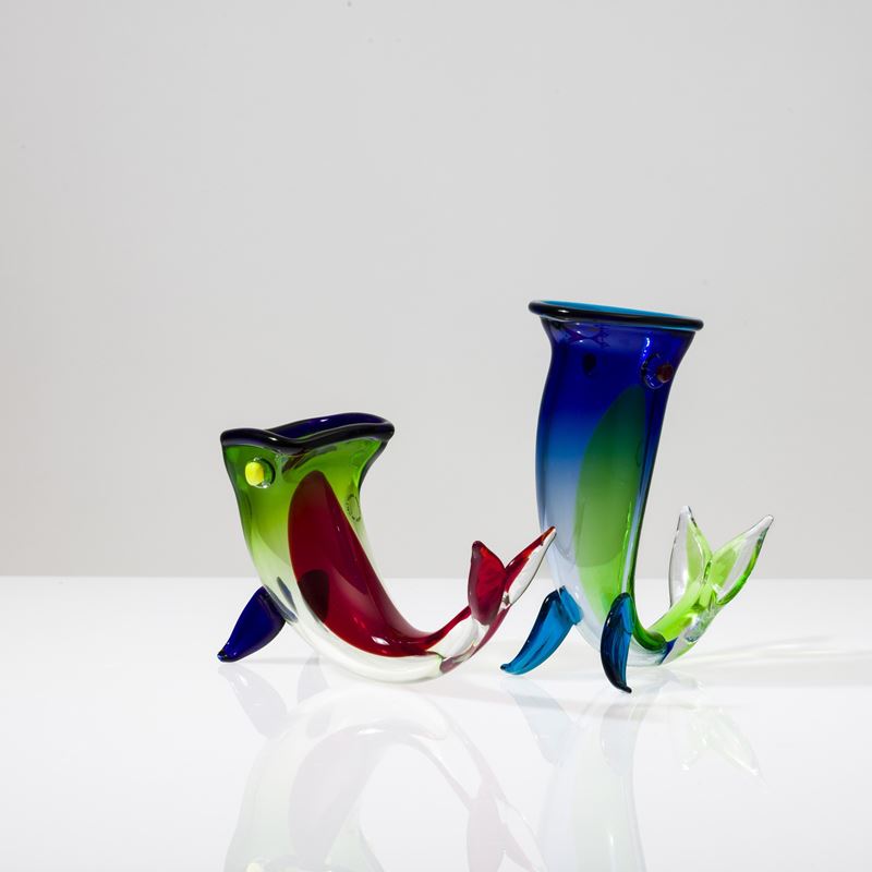 Lotto di due soprammobili in forma di pesce in vetro soffiato multicolore.