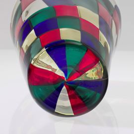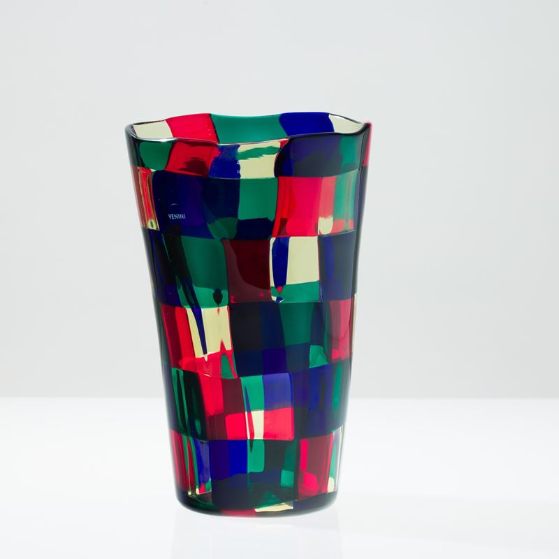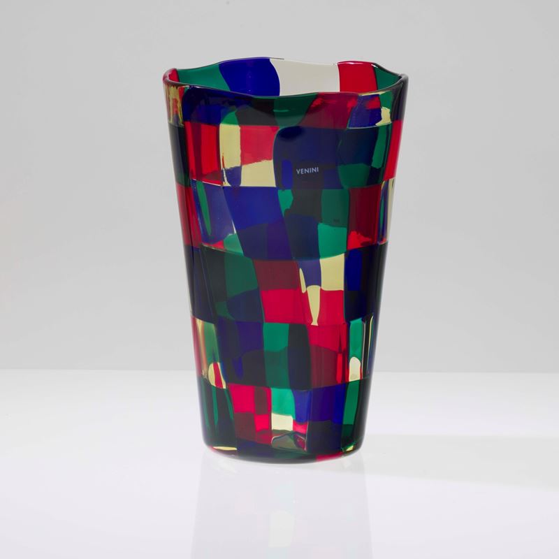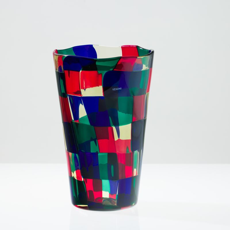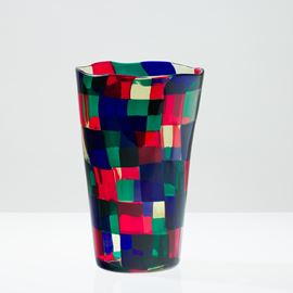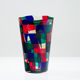 Vaso troncoconico serie Pezzati in vetro soffiato con decoro di tessere multicolori nella variante Parigi.