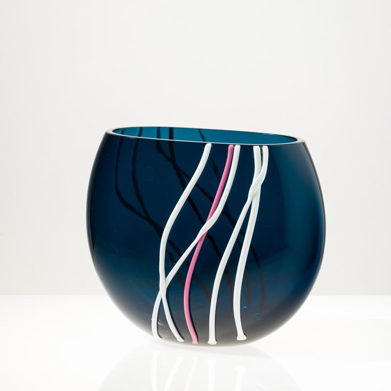 Vaso a sezione ovale in vetro soffiato con decoro di canne policrome applicate.