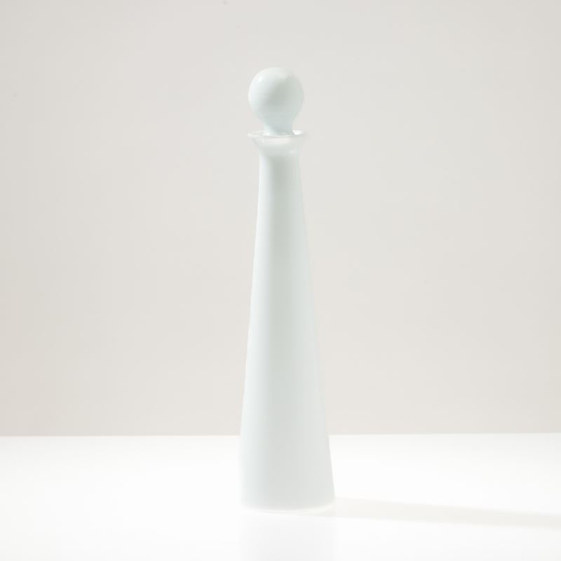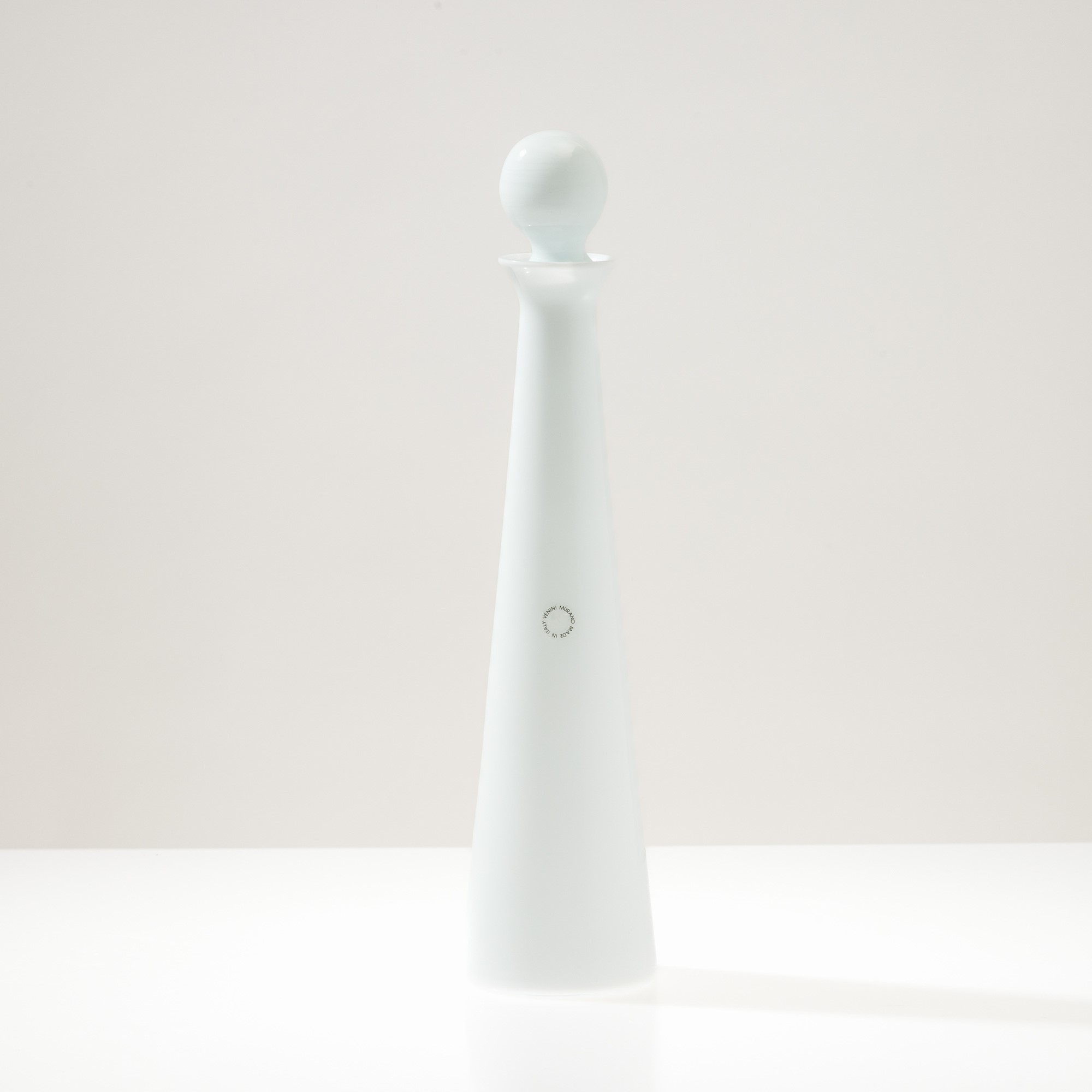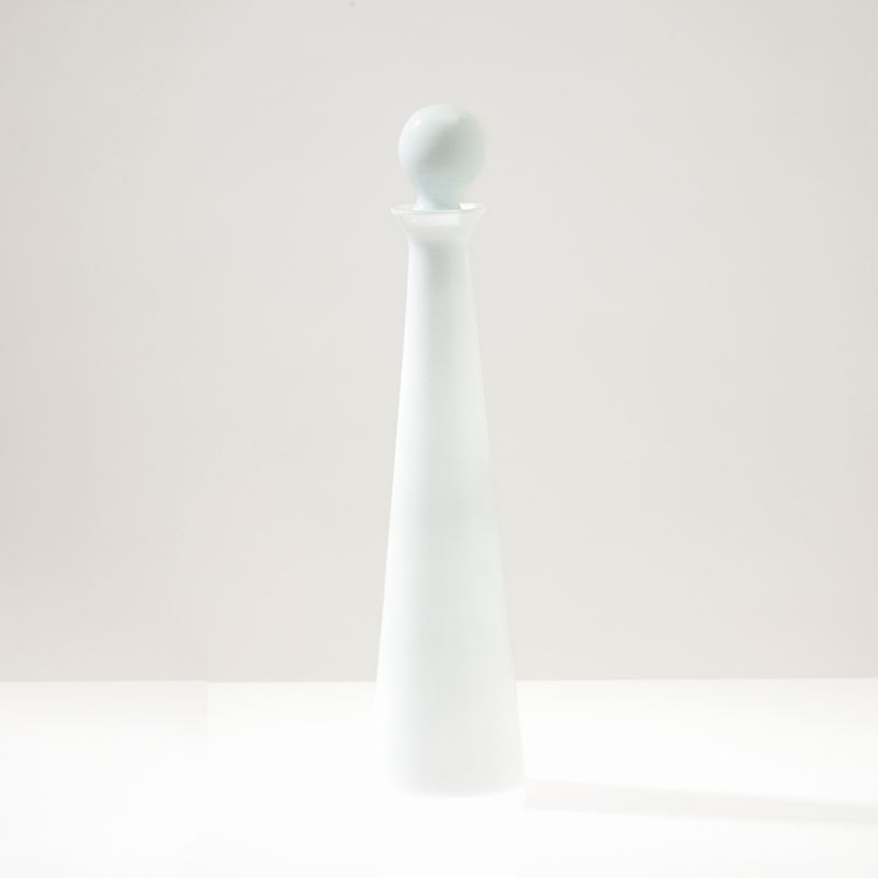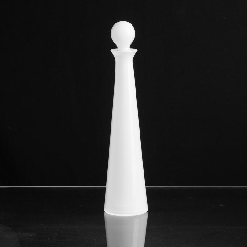 Bottiglia conica Elisir con tappo sferico in vetro soffiato lattimo.