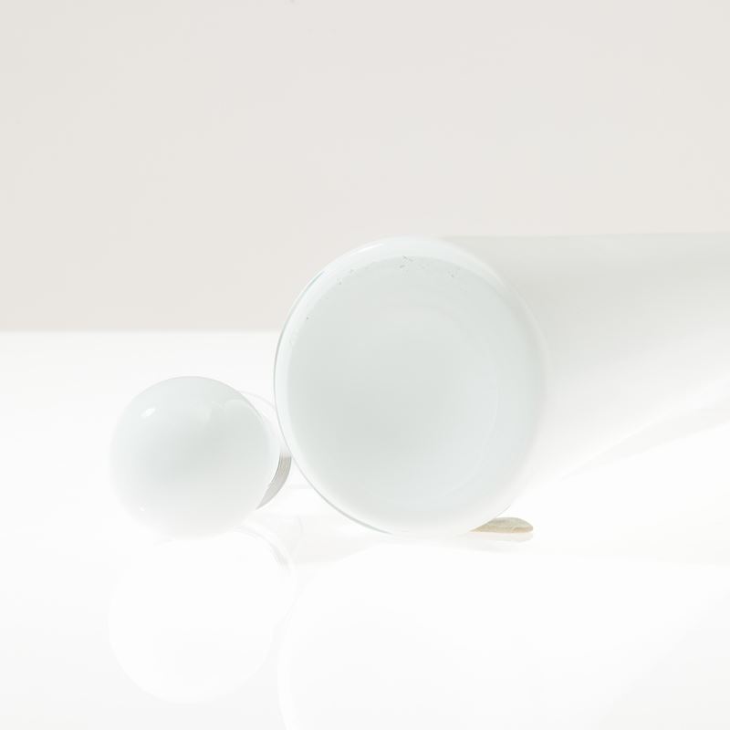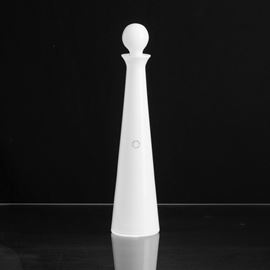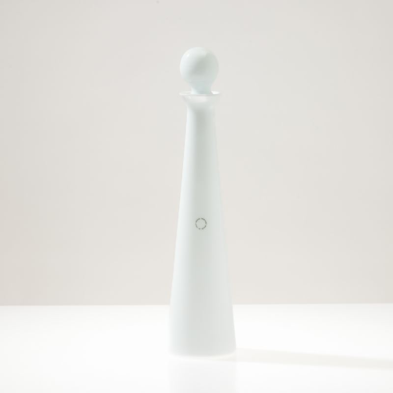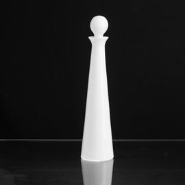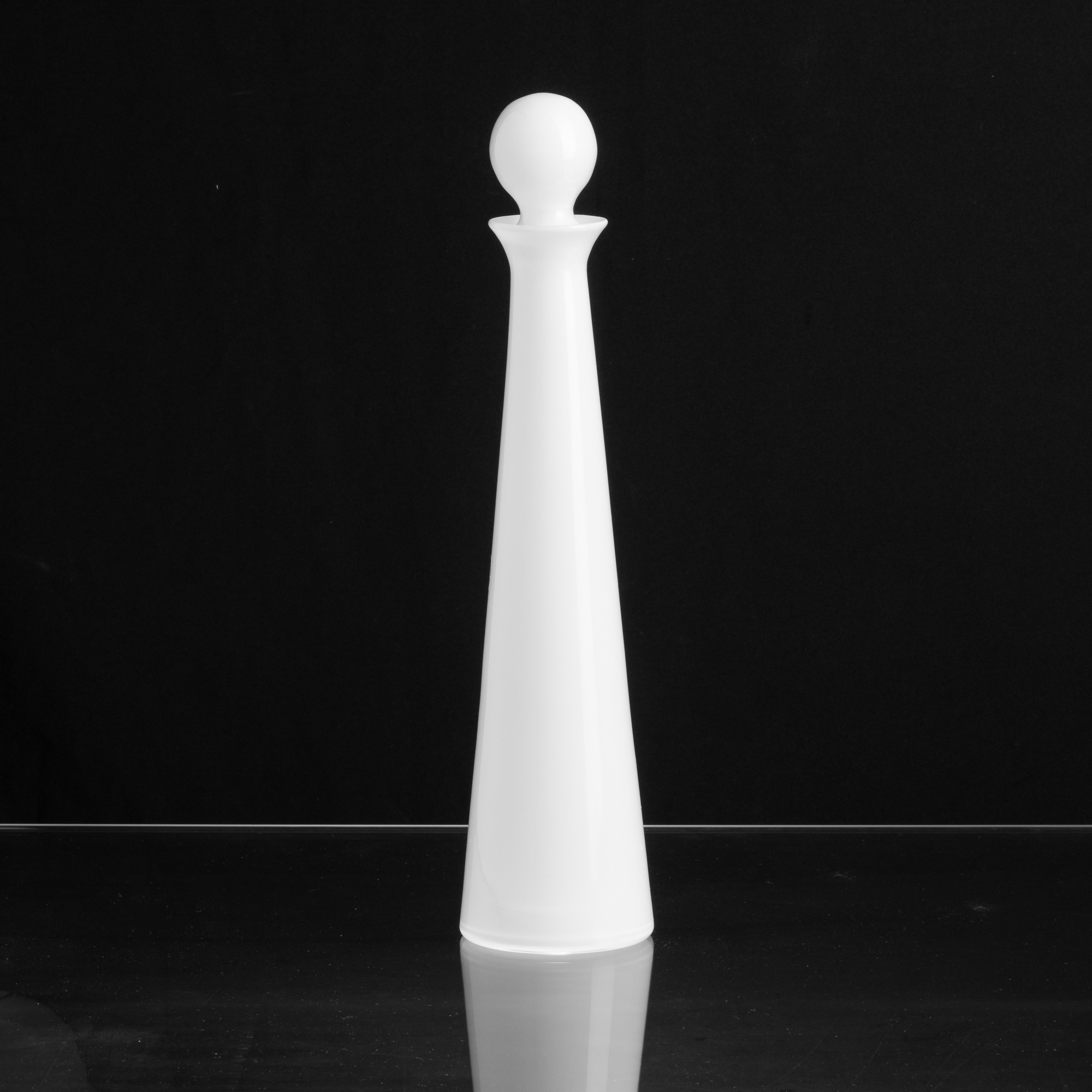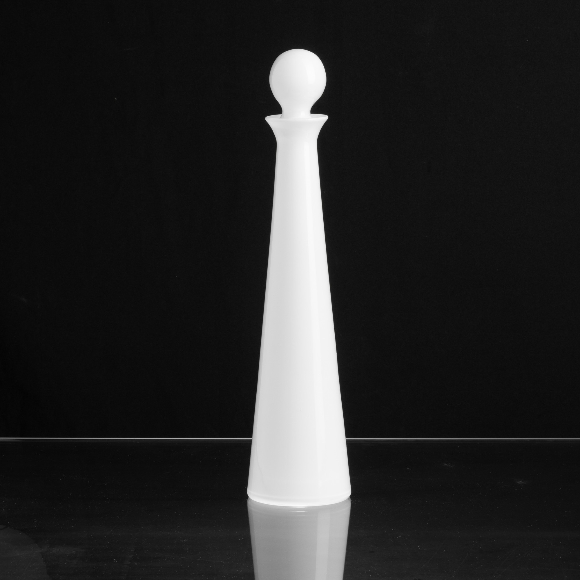 Bottiglia conica Elisir con tappo sferico in vetro soffiato lattimo.
