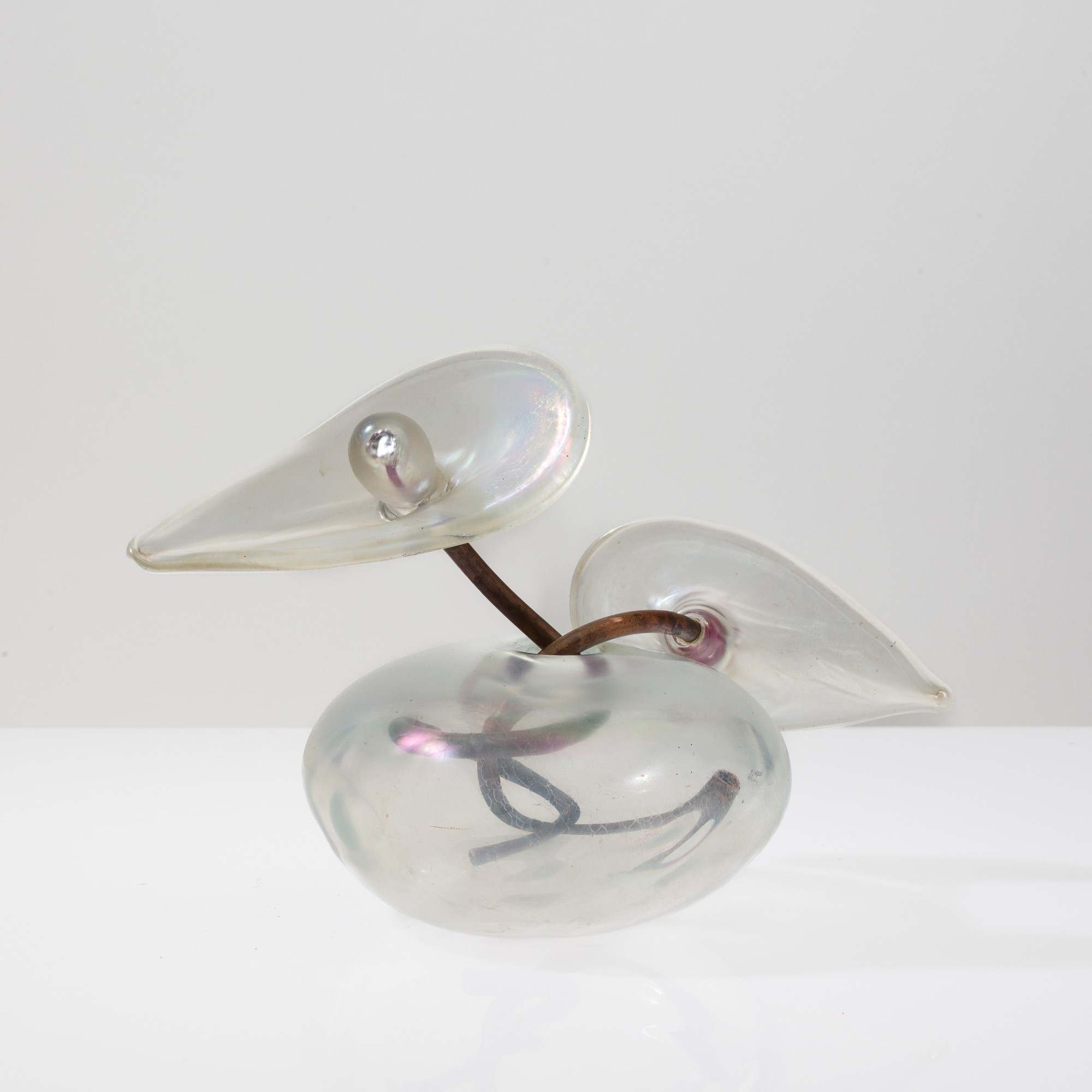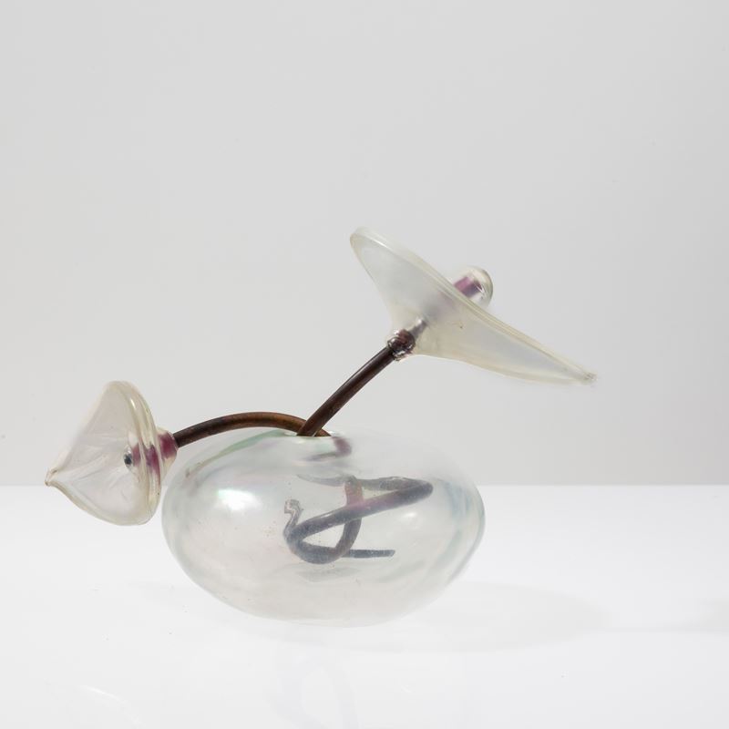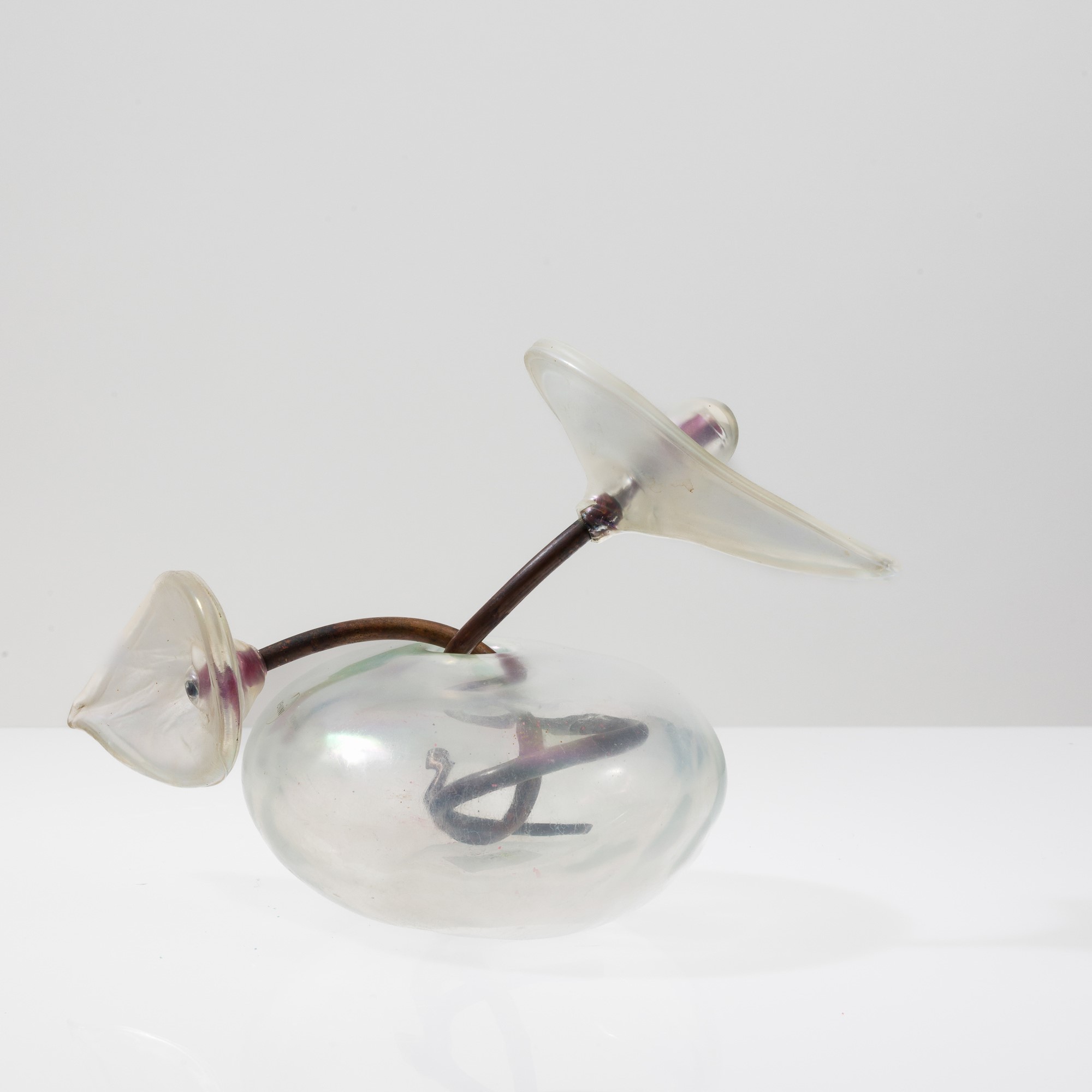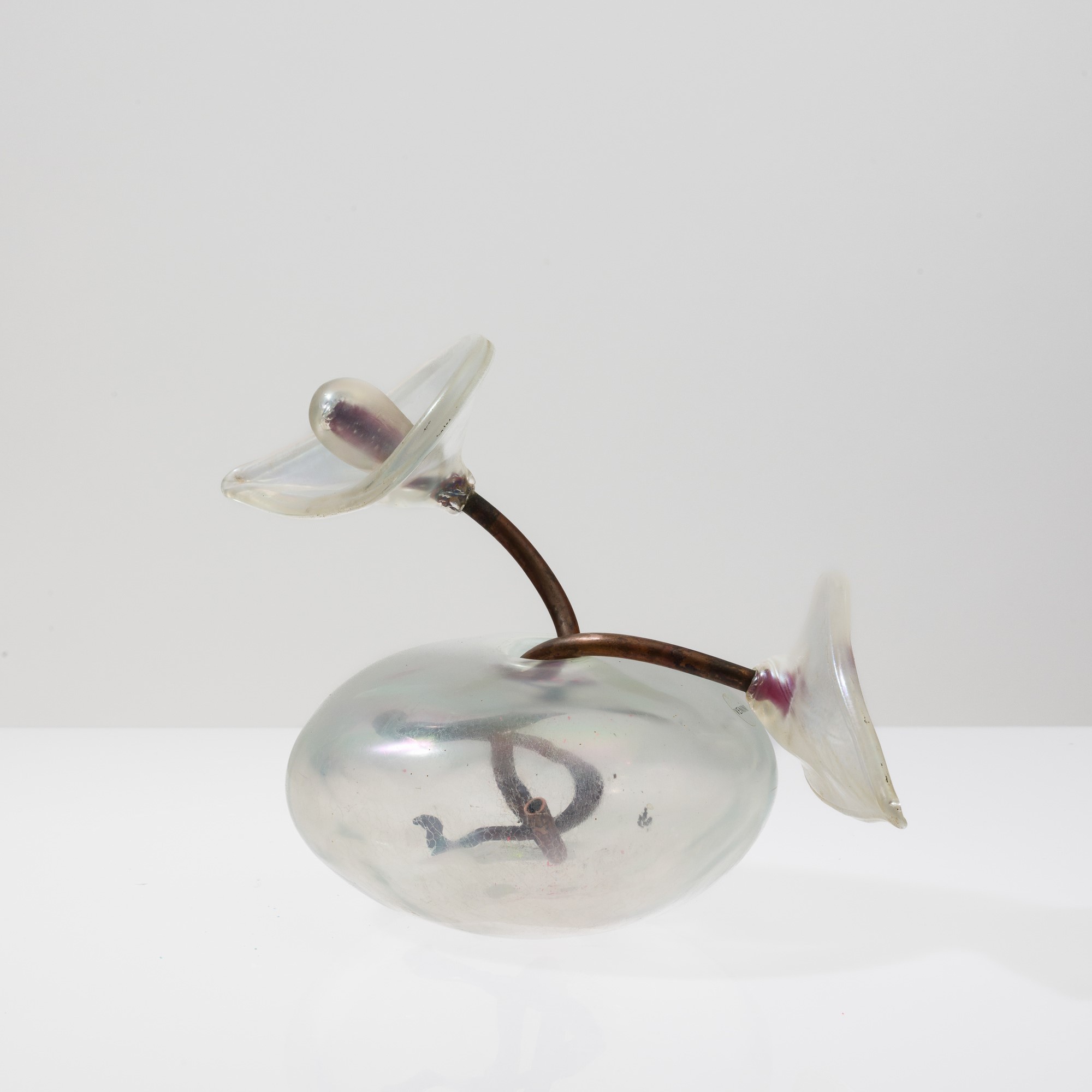 Vaso serie Fuochi Iridati in vetro pesante iridato con coppia di fiori su steli tubolari in rame.