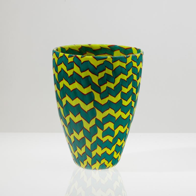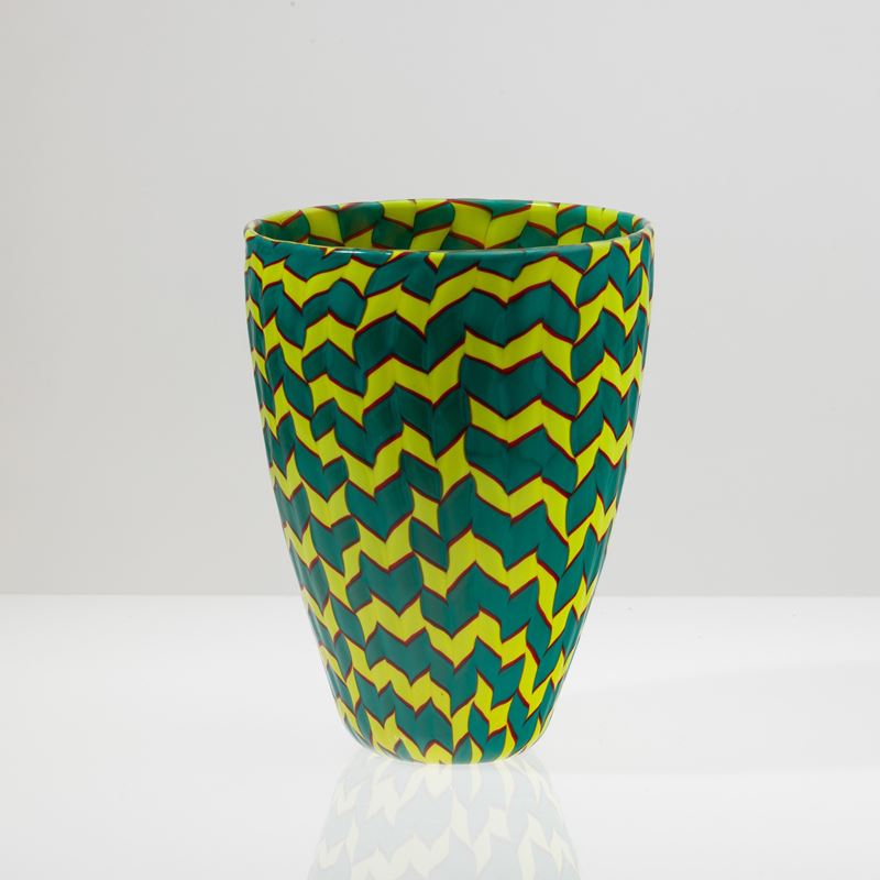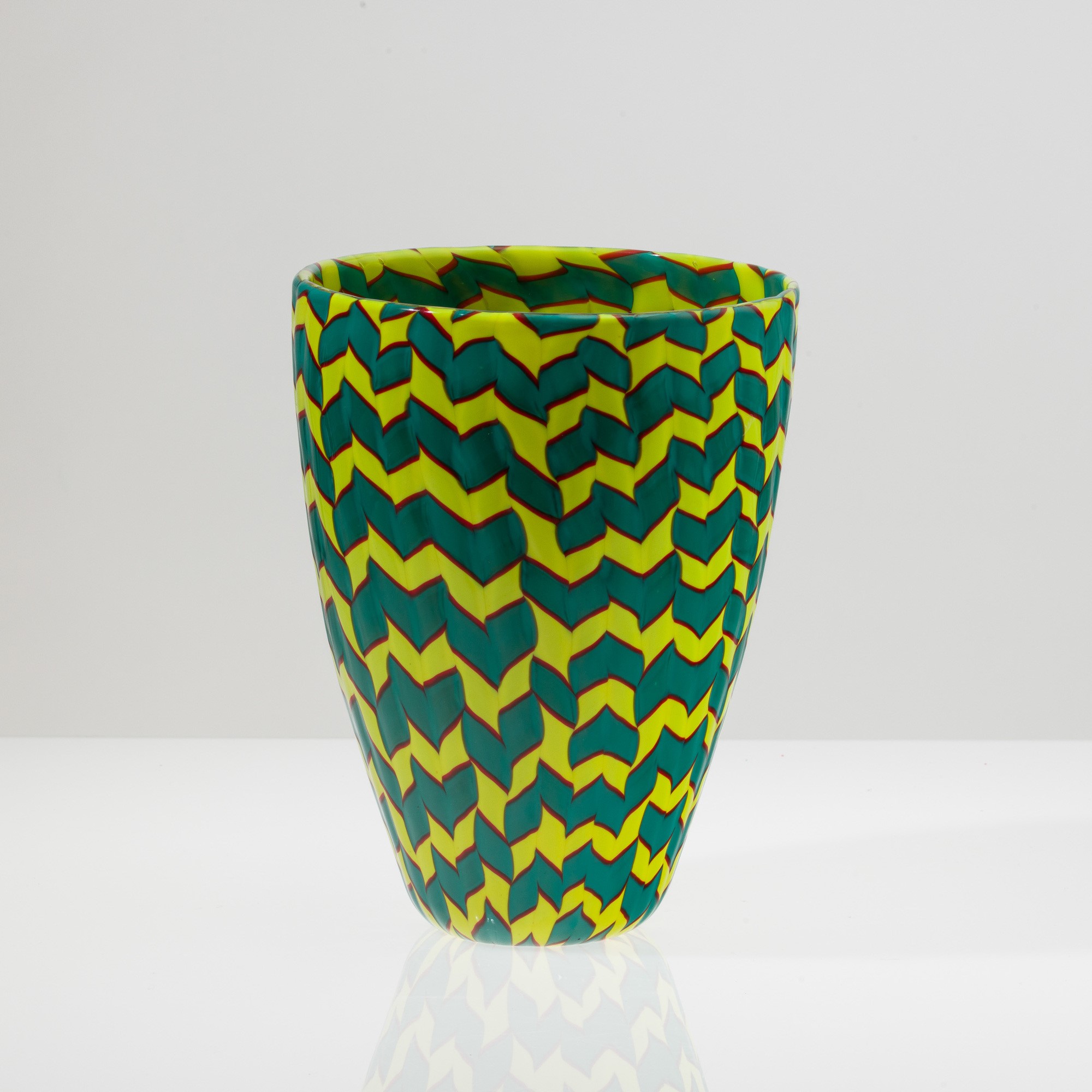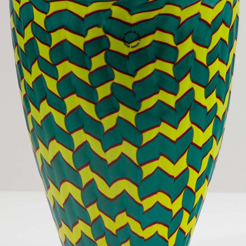 Vaso serie Calabash in vetro soffiato con decoro di canne zolfo, turchese e rosso antico.