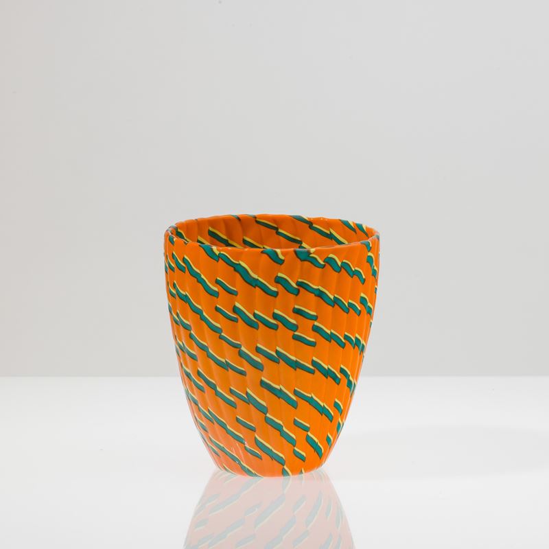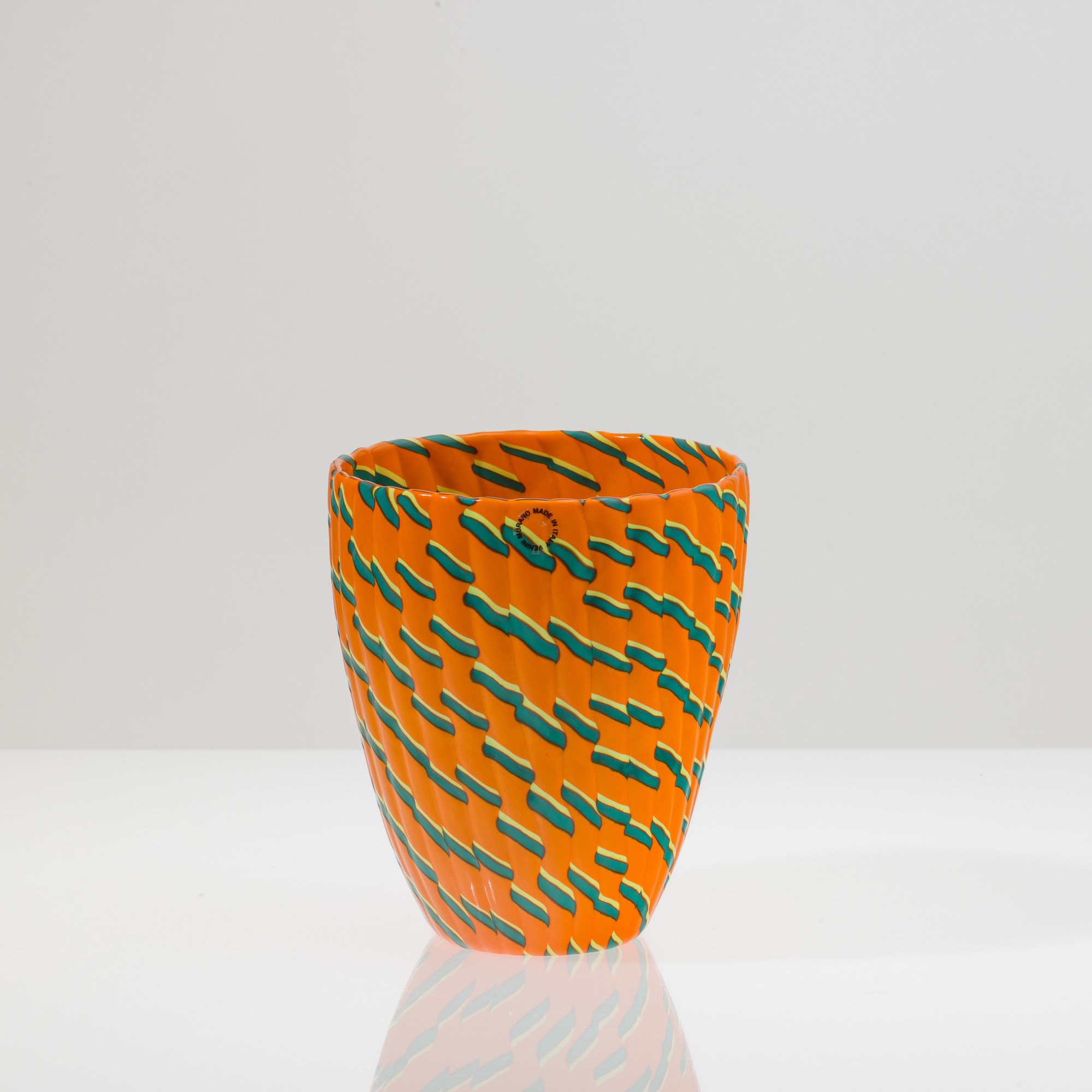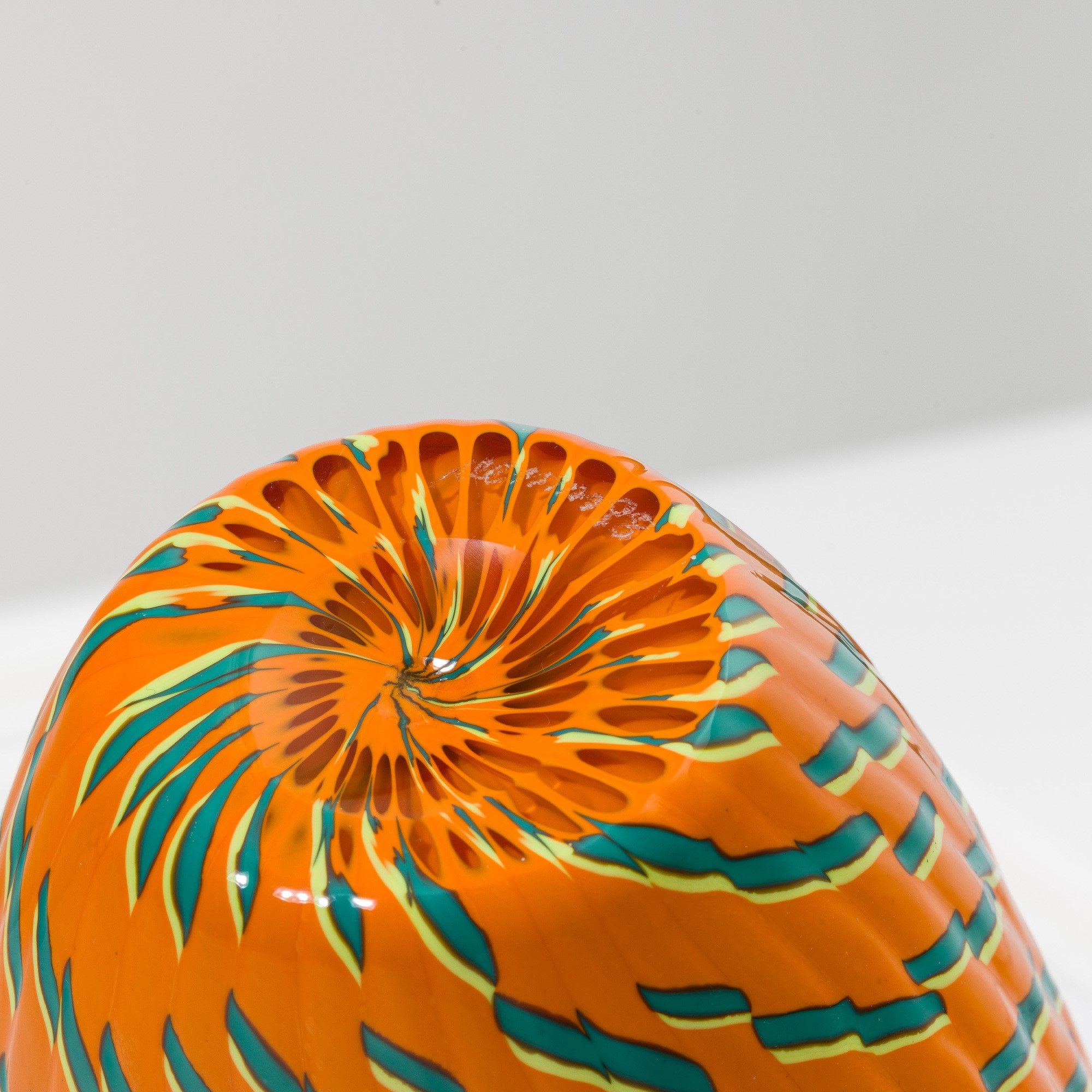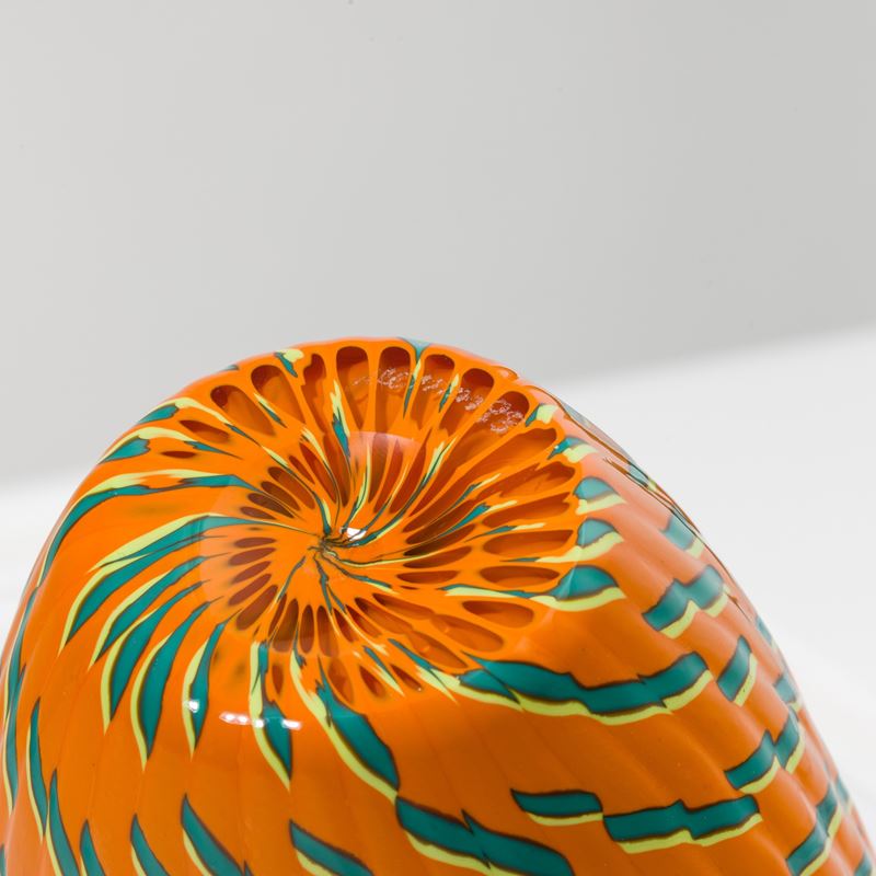 Vaso troncoconico serie Calabash in vetro soffiato arancio opalino con decoro di canne turchese e zolfo.