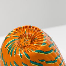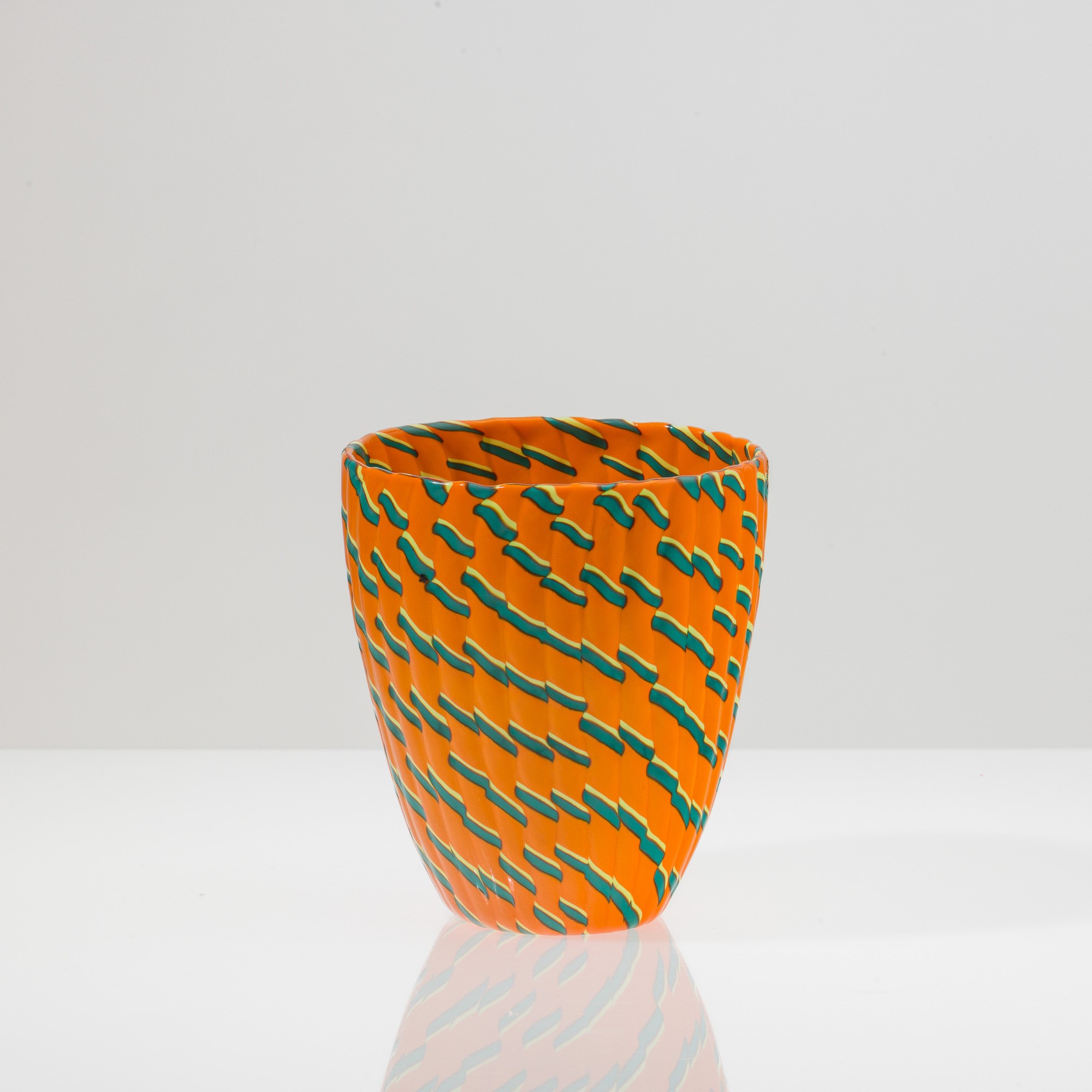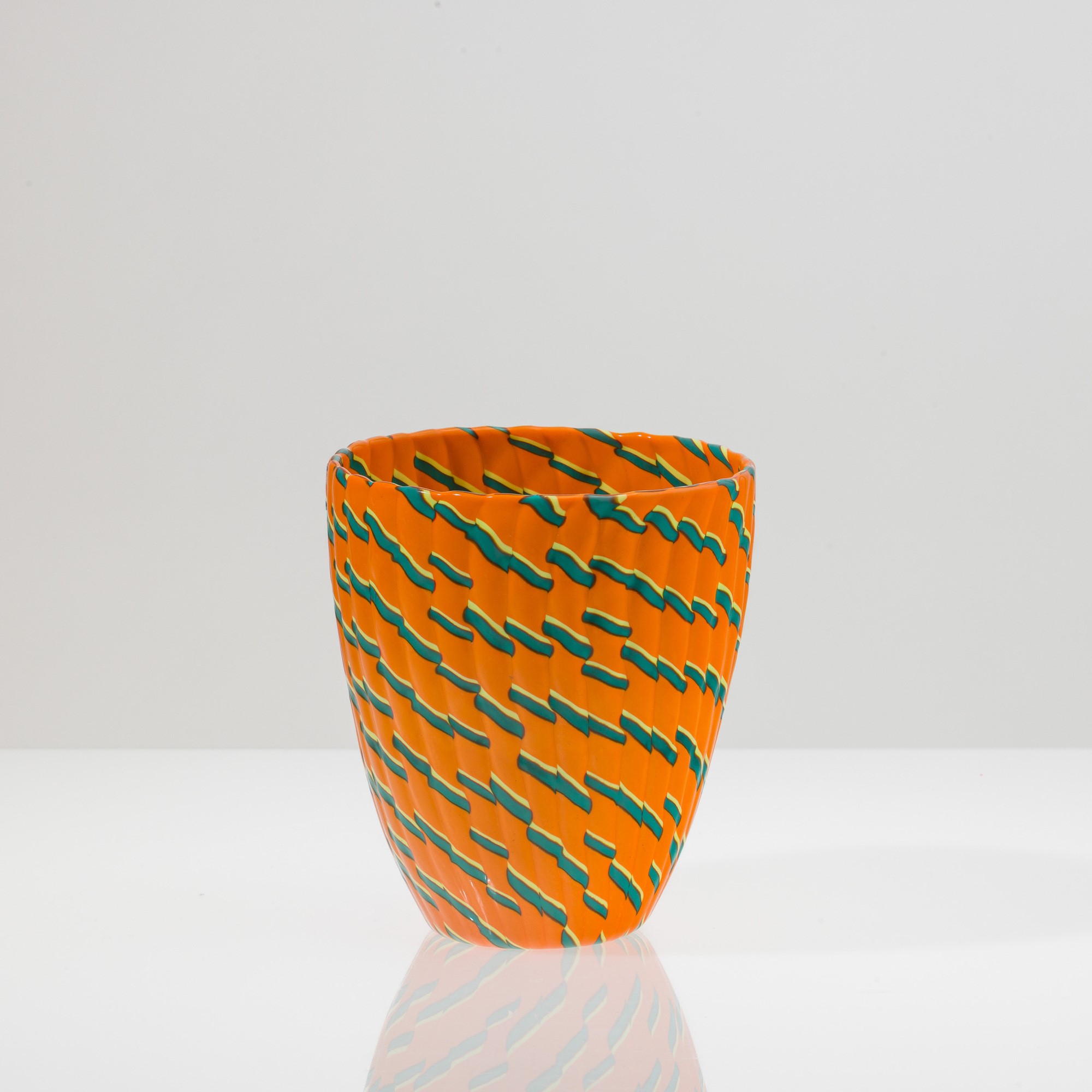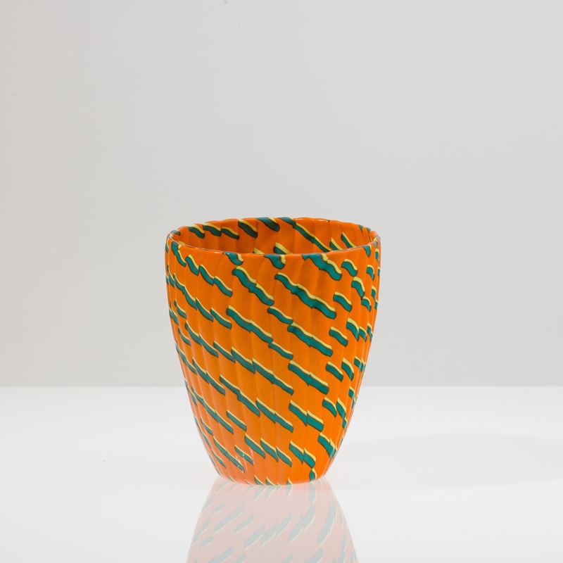 Vaso troncoconico serie Calabash in vetro soffiato arancio opalino con decoro di canne turchese e zolfo.