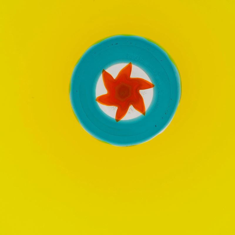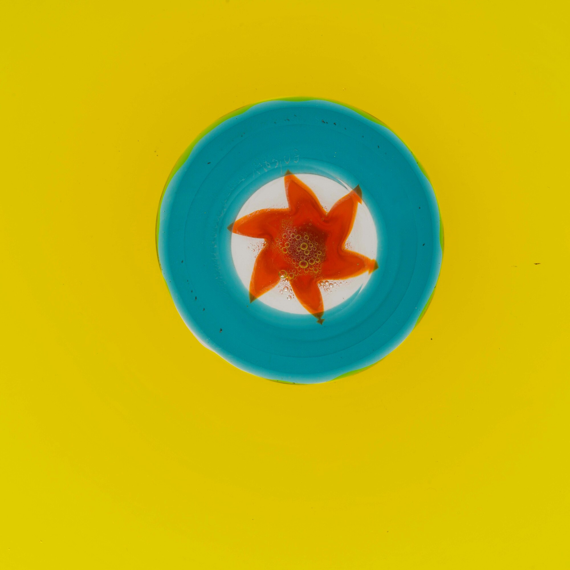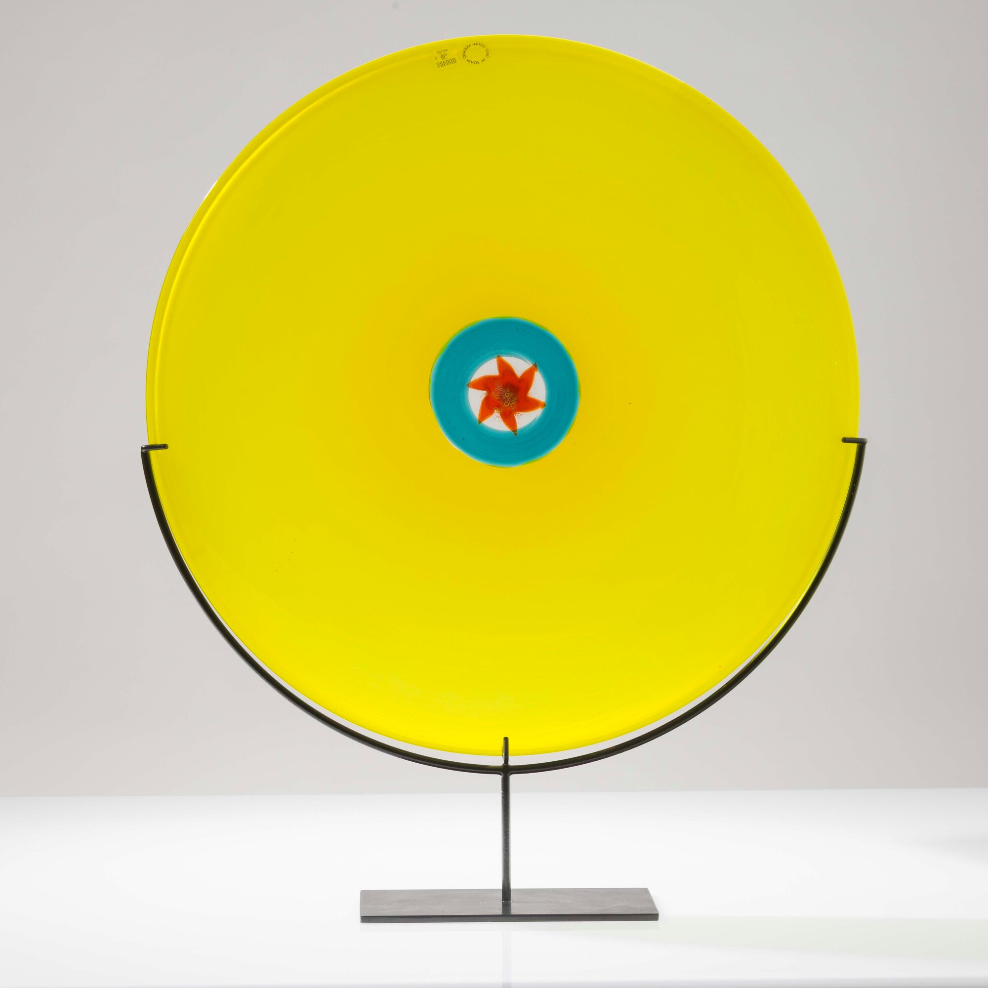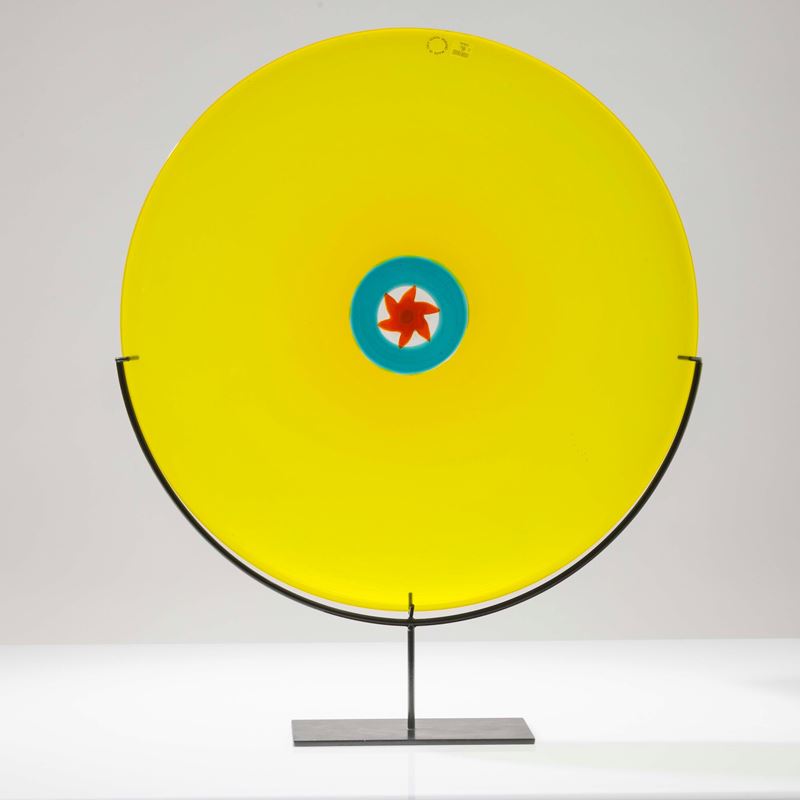 Piatto Sole dalla serie Pianeti in vetro soffiato giallo zolfo a incalmo con decoro di murrina adriatico e arancio opalino centrale.