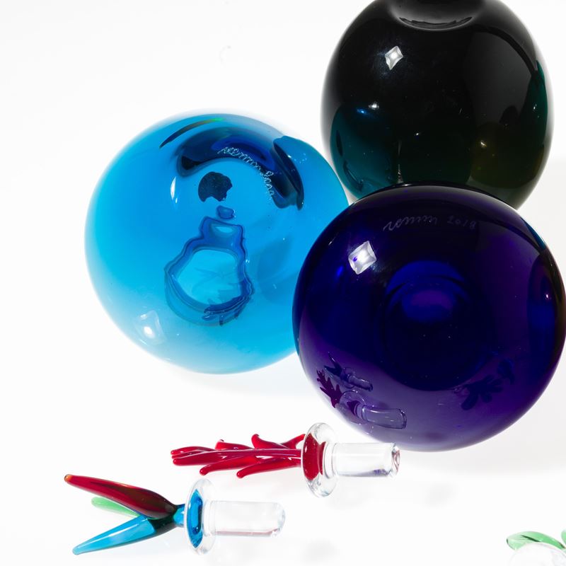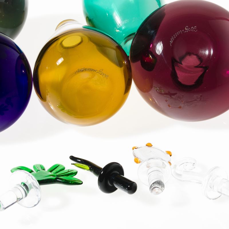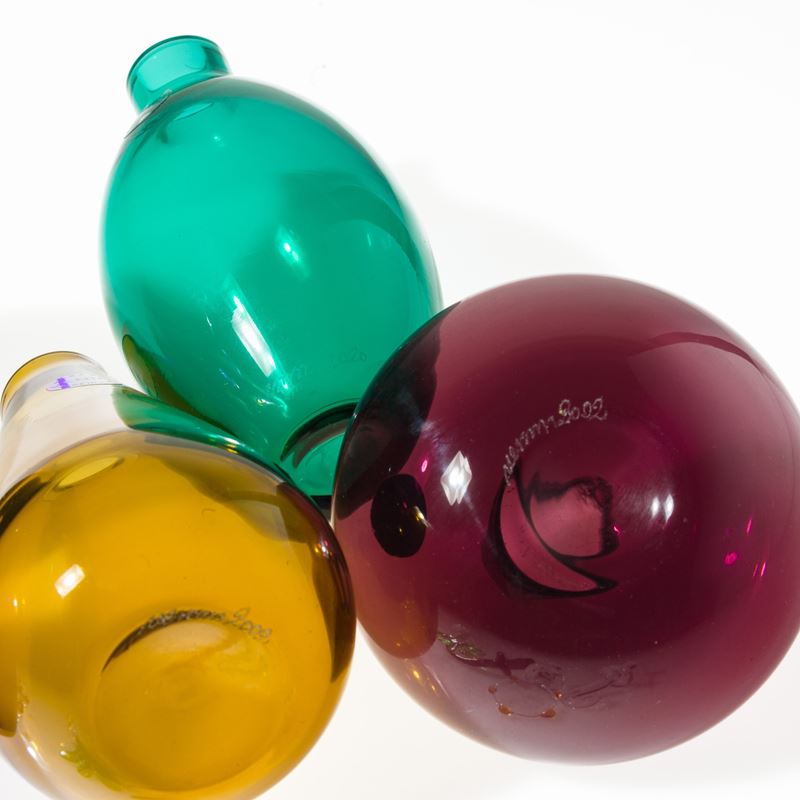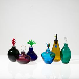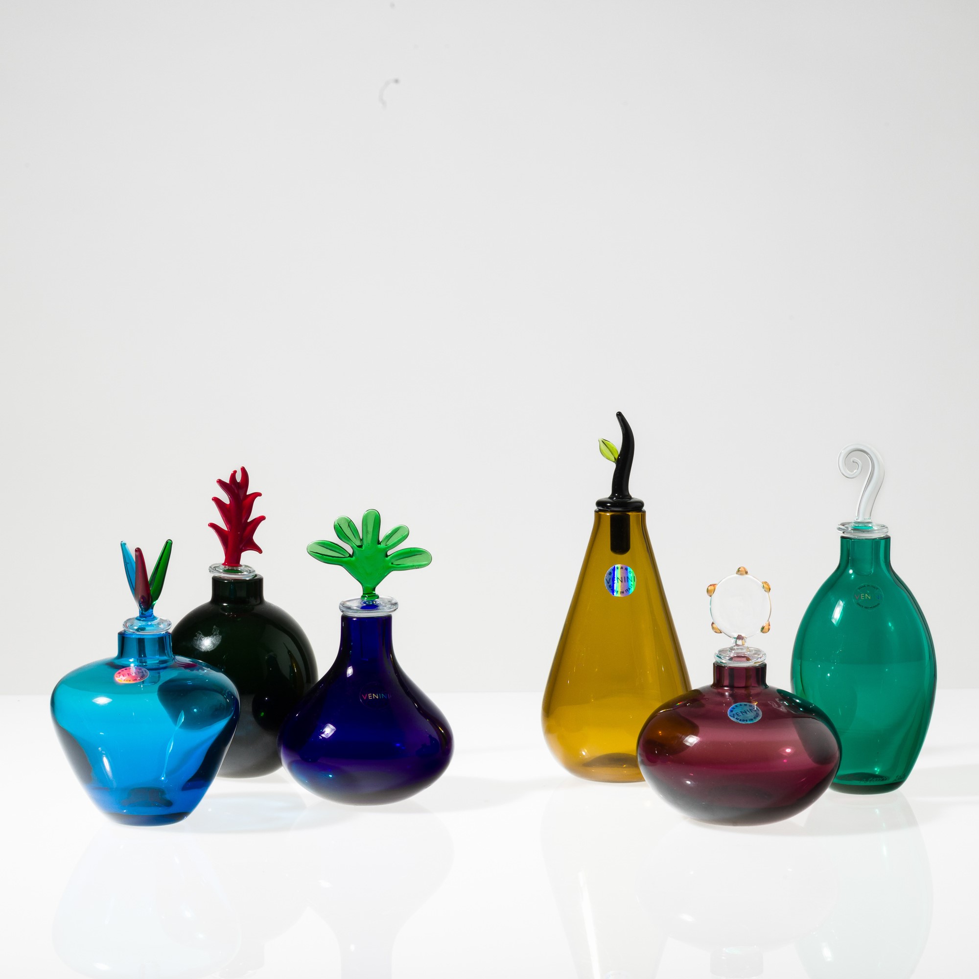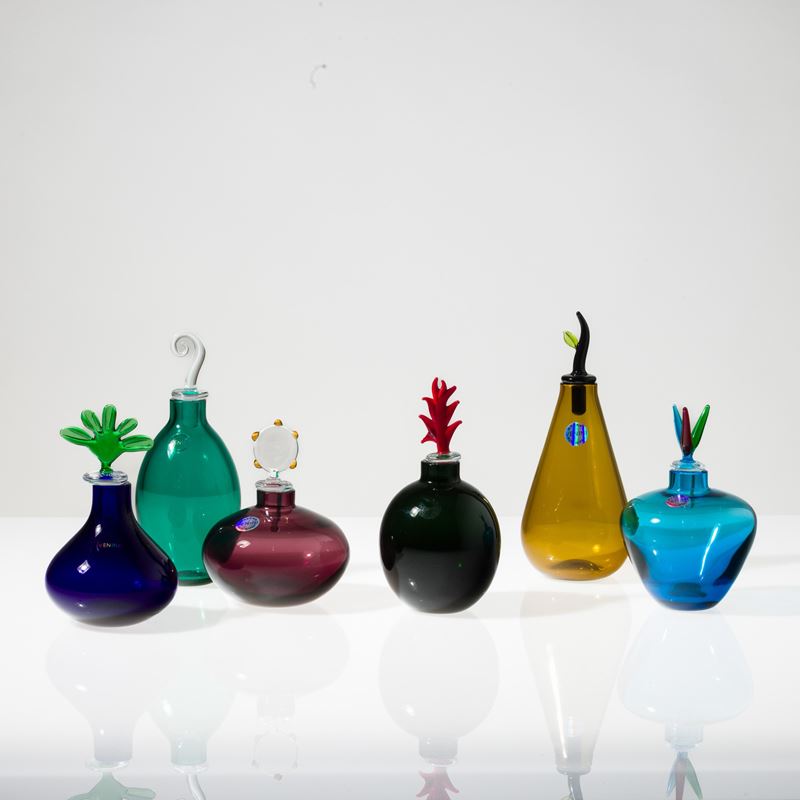 Collezione di sei bottiglie serie Monofiore in vetro soffiato policromo con tappi di forme diverse.
