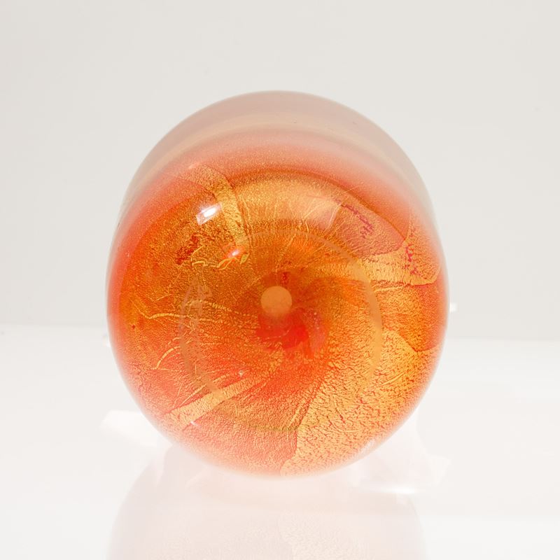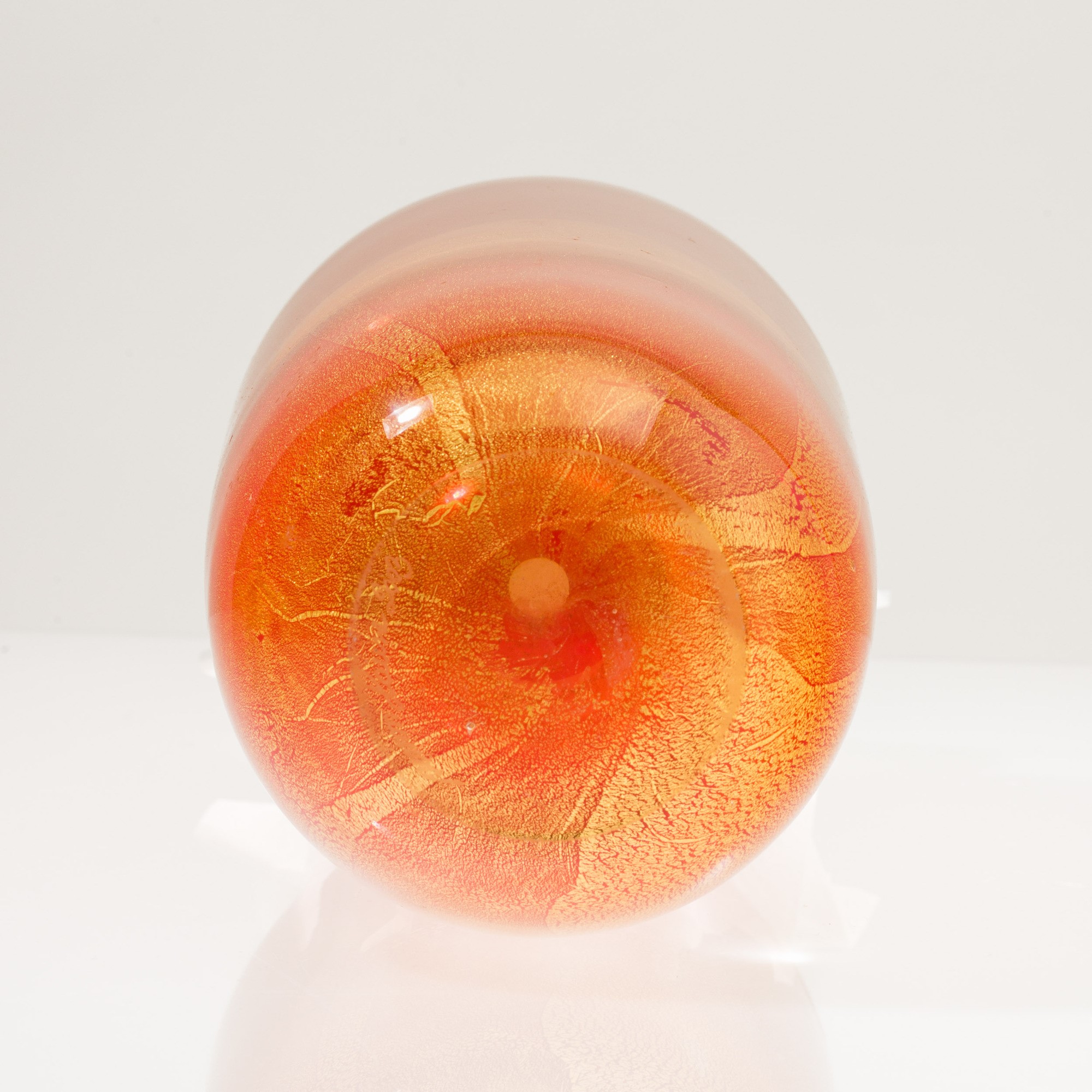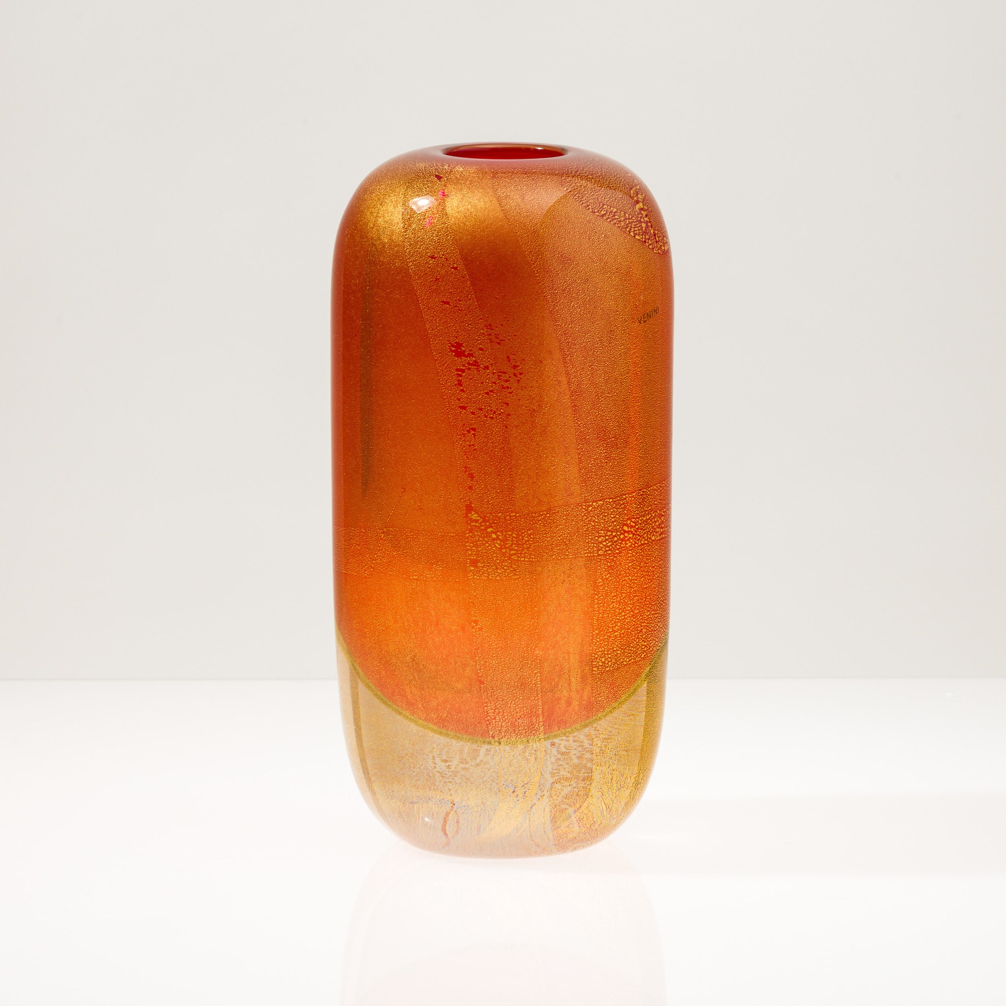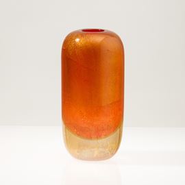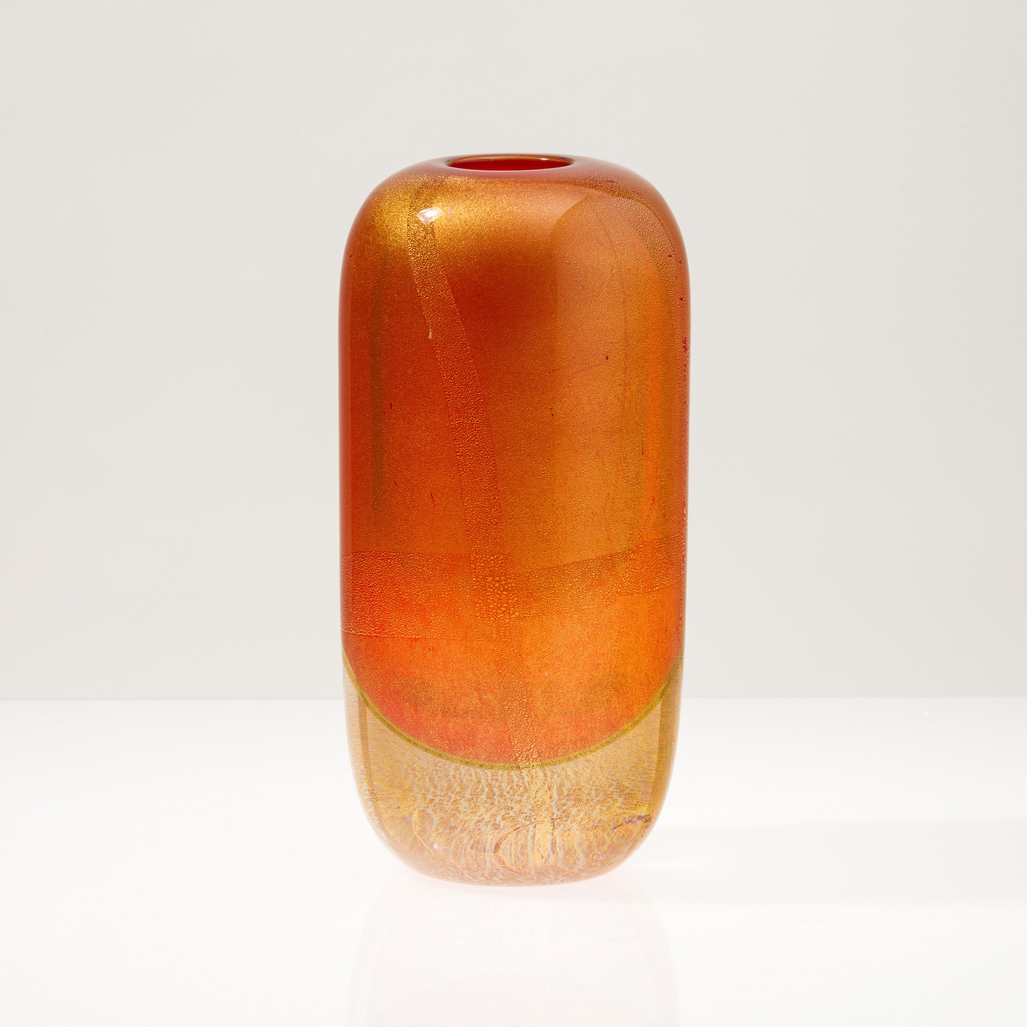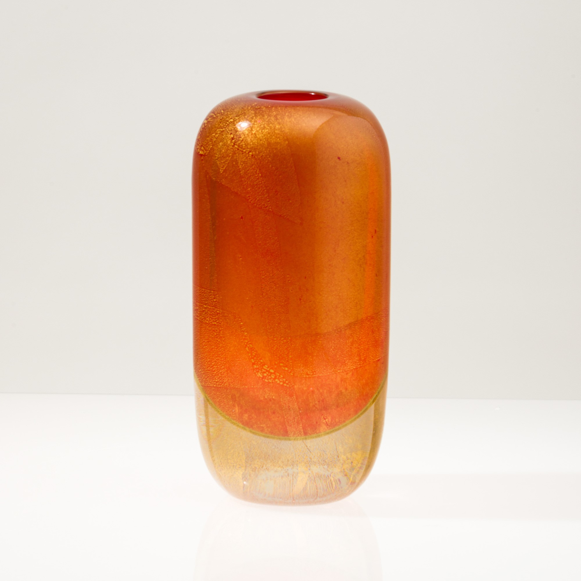 Vaso Sommersi Oro in forma di pillola in vetro sommerso arancione con decoro in foglia oro.