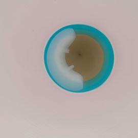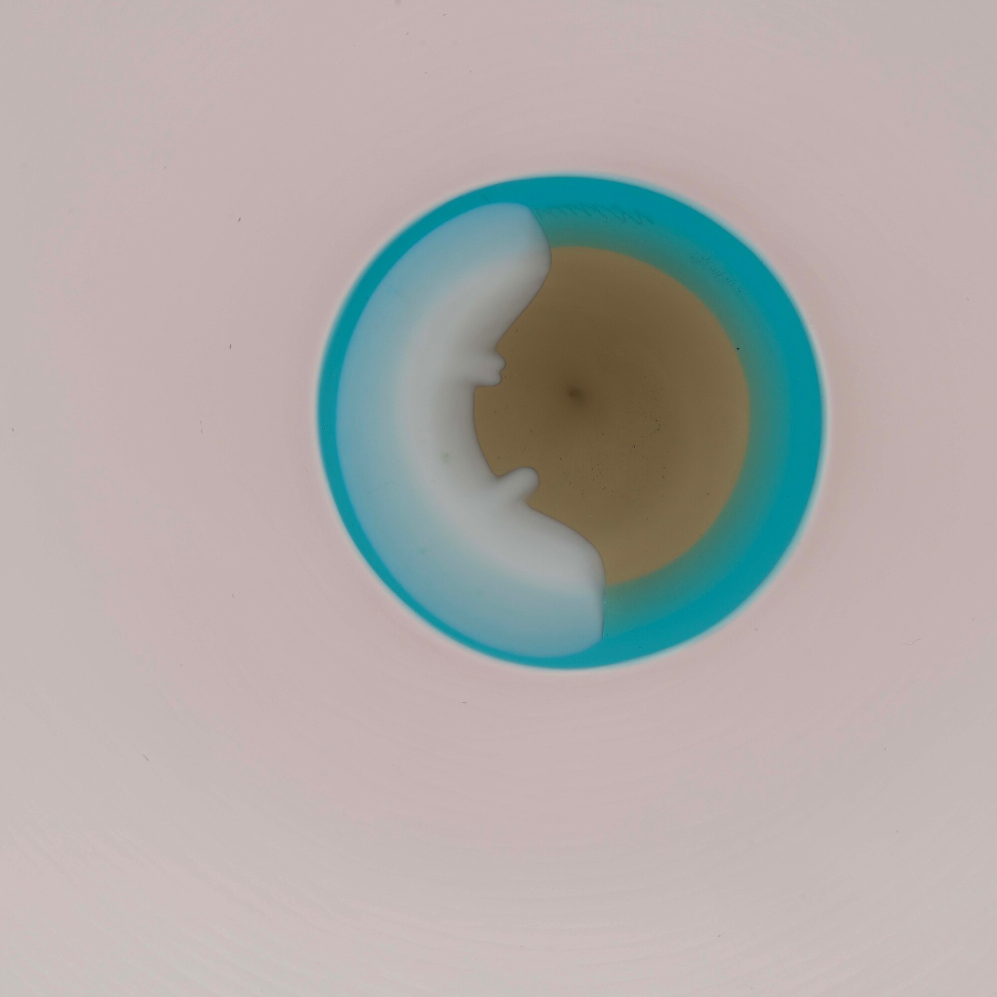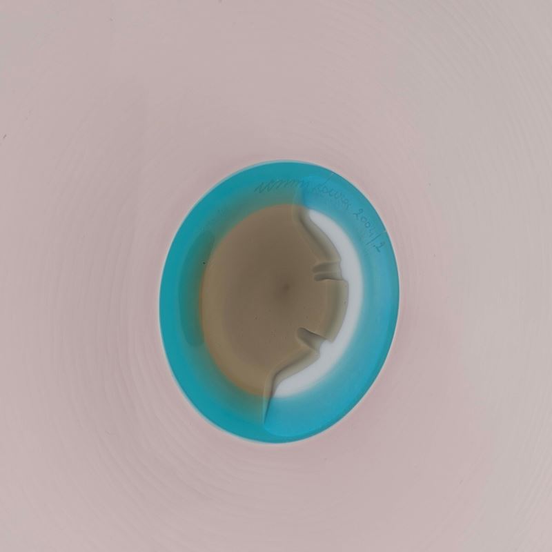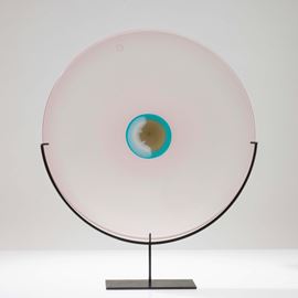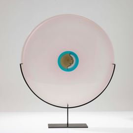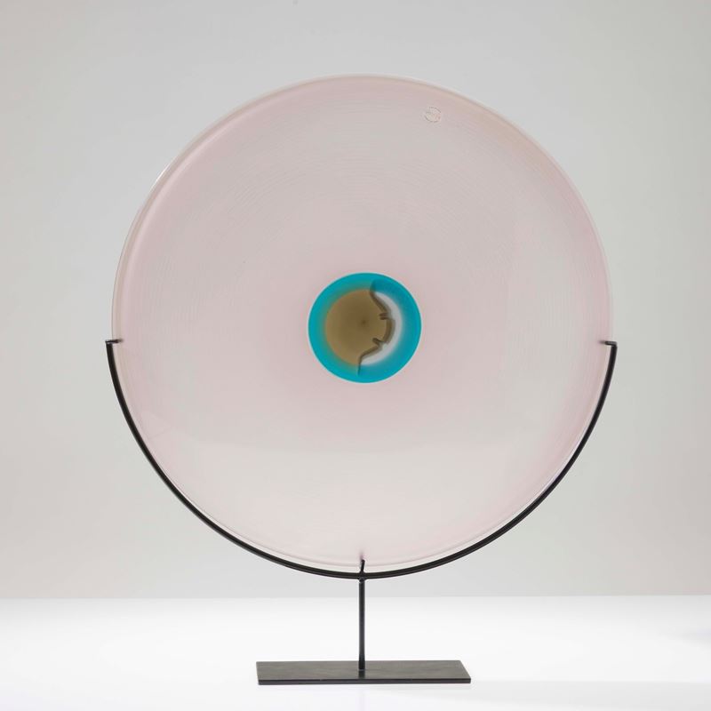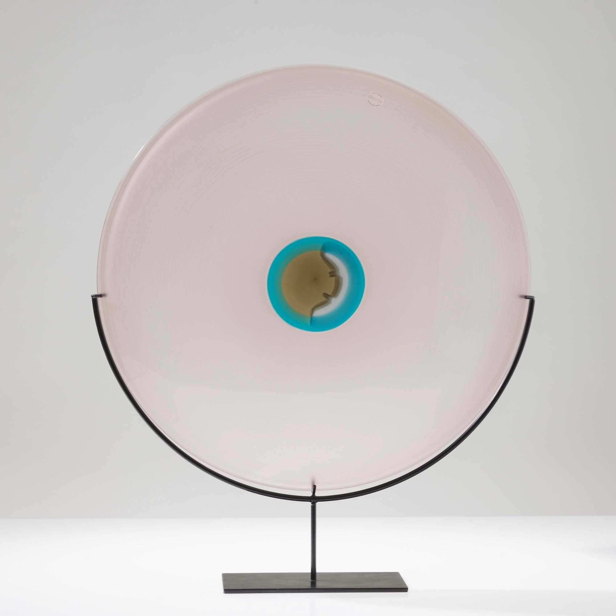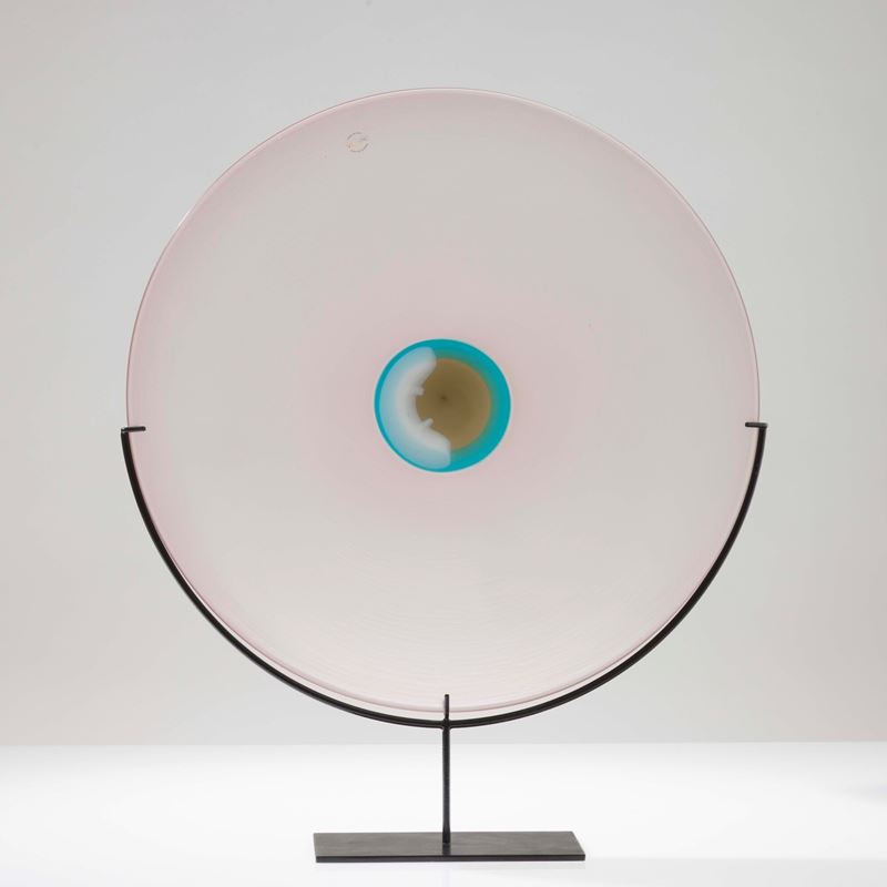 Piatto Luna dalla serie Pianeti in vetro soffiato ametista a incalmo con decoro di murrina adriatico e lattimo centrale.