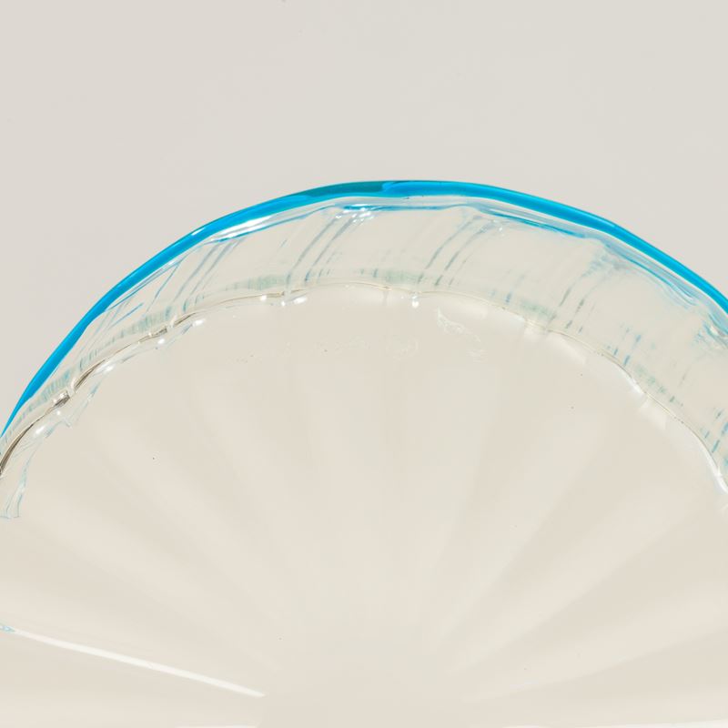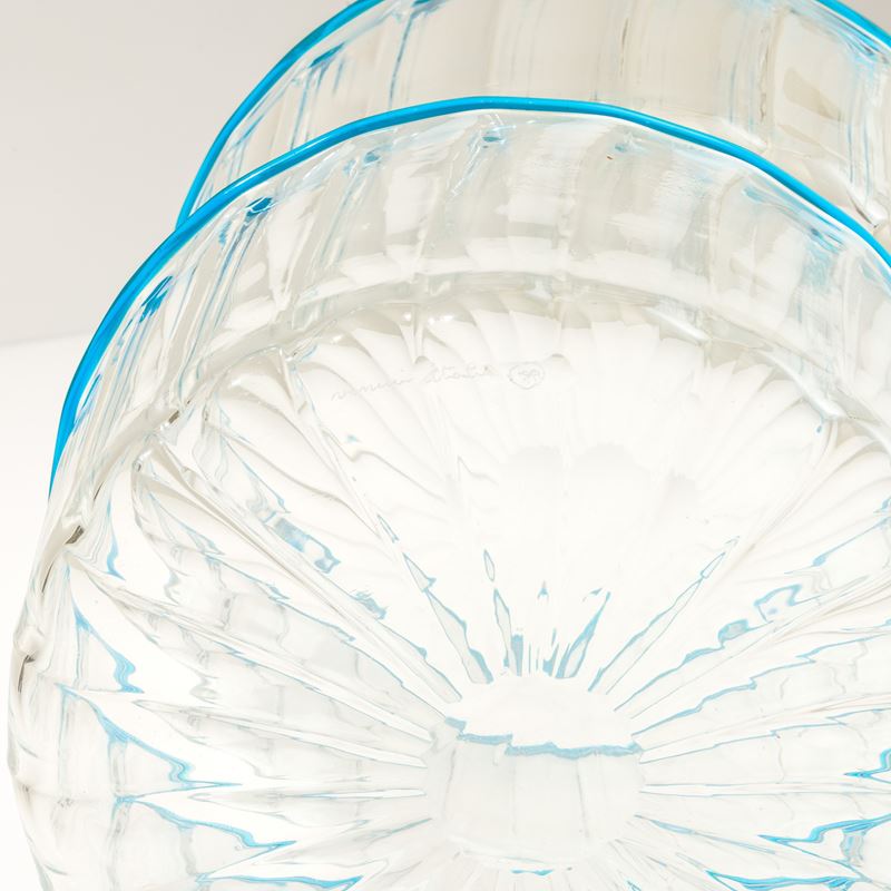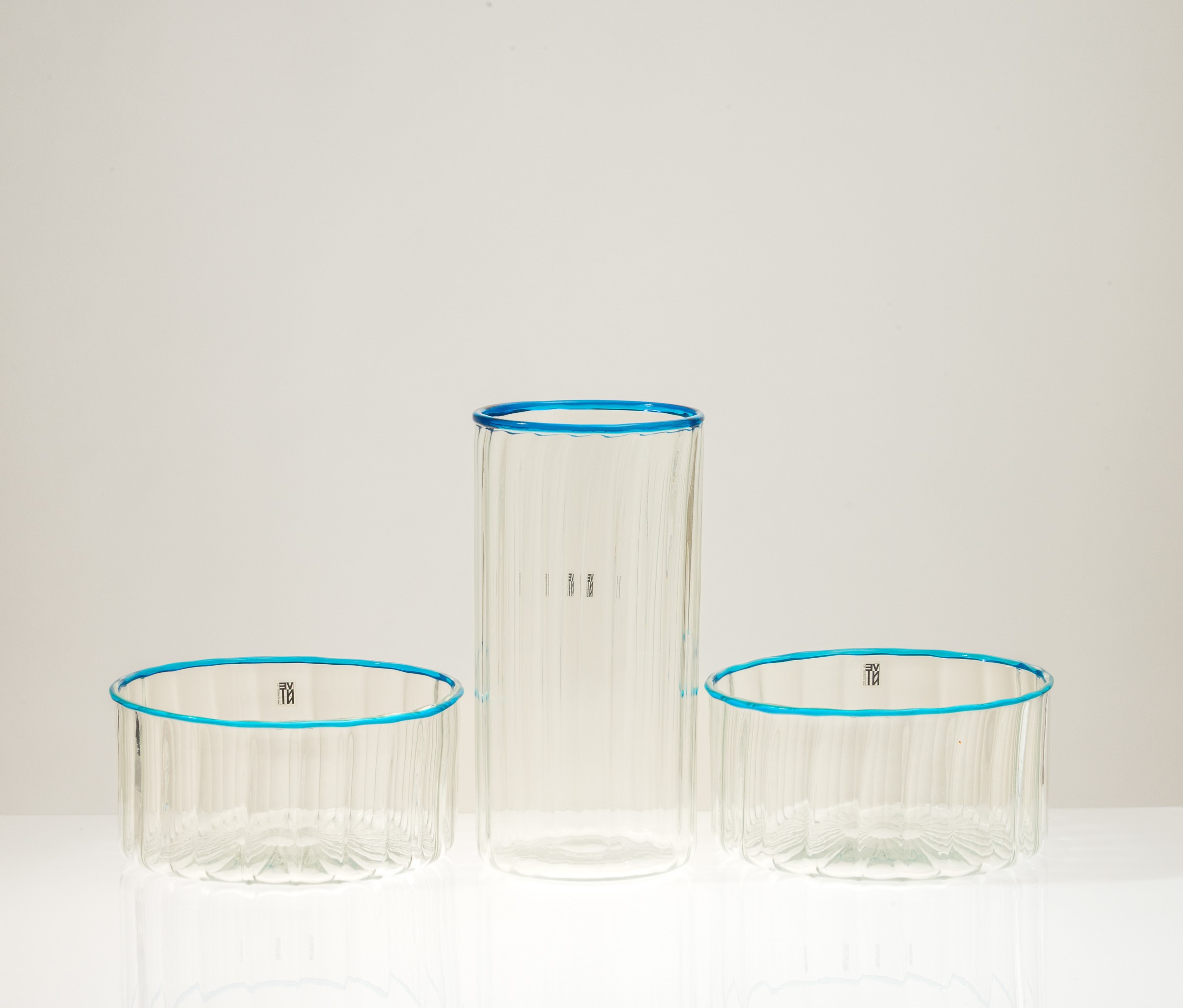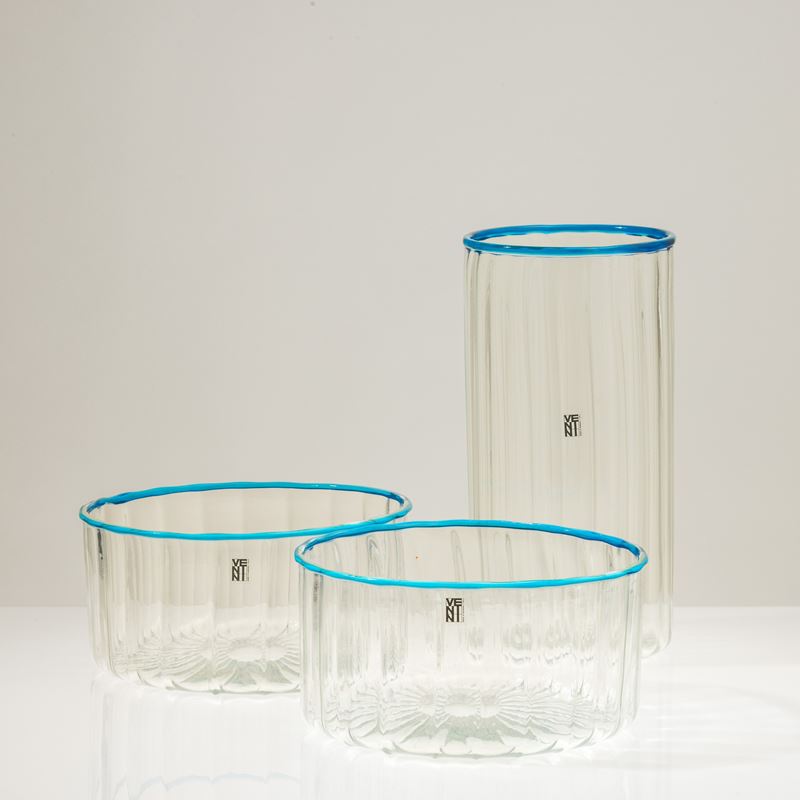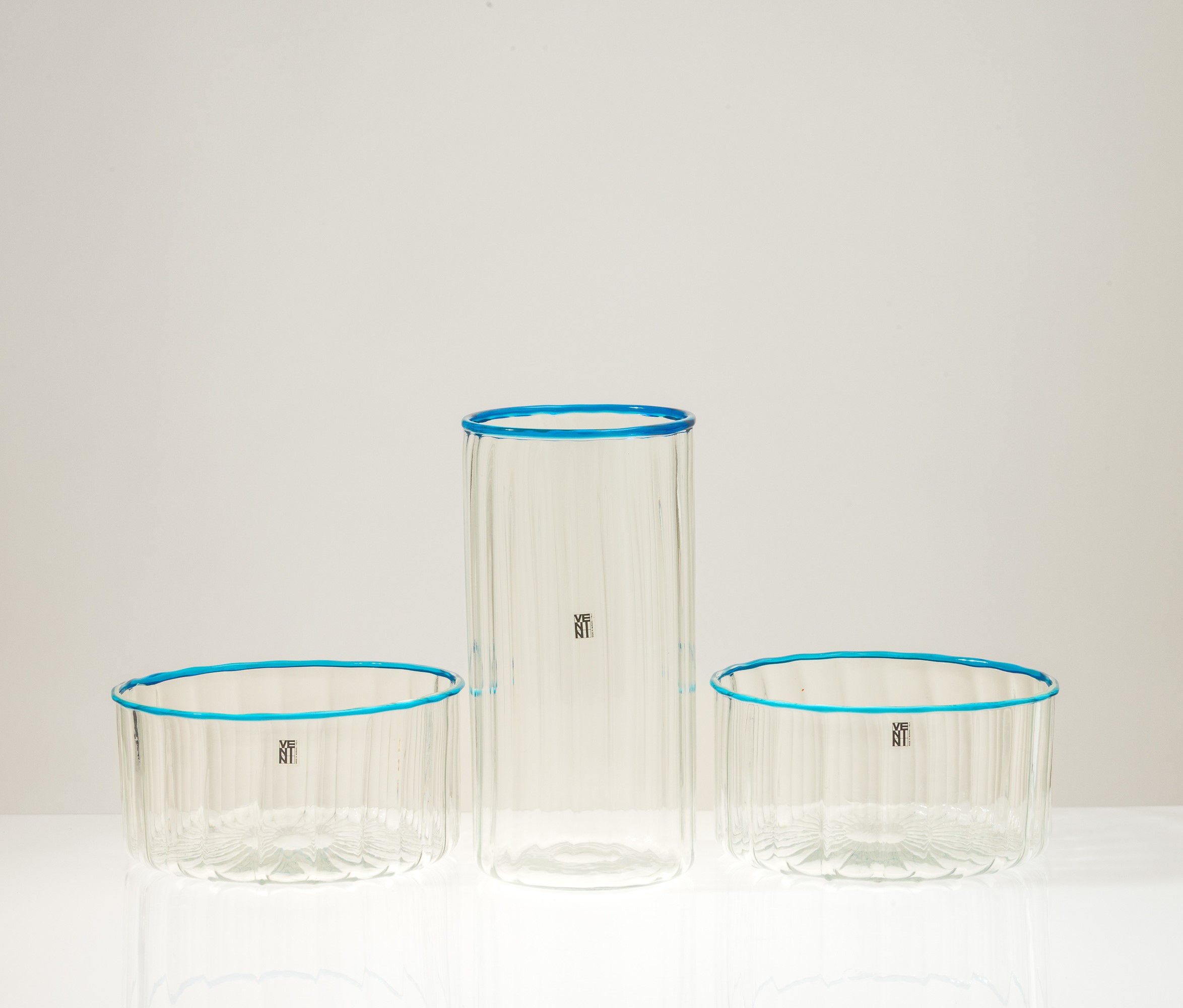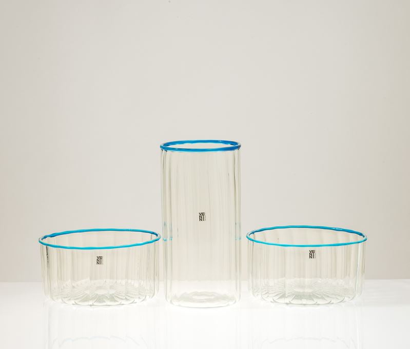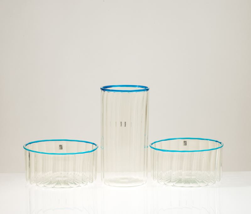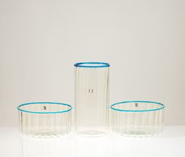 Due coppe e un vaso in vetro soffiato a leggere costolature con cordolo colore acquamarina applicato.