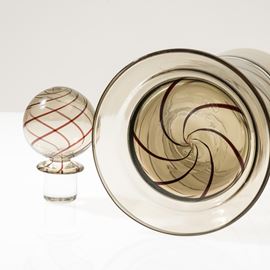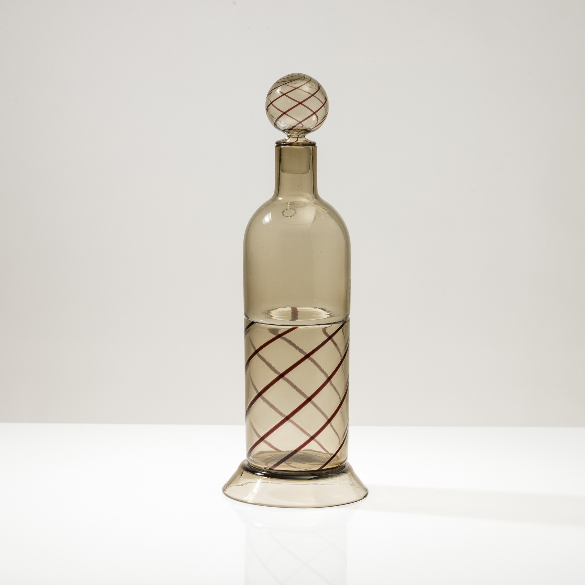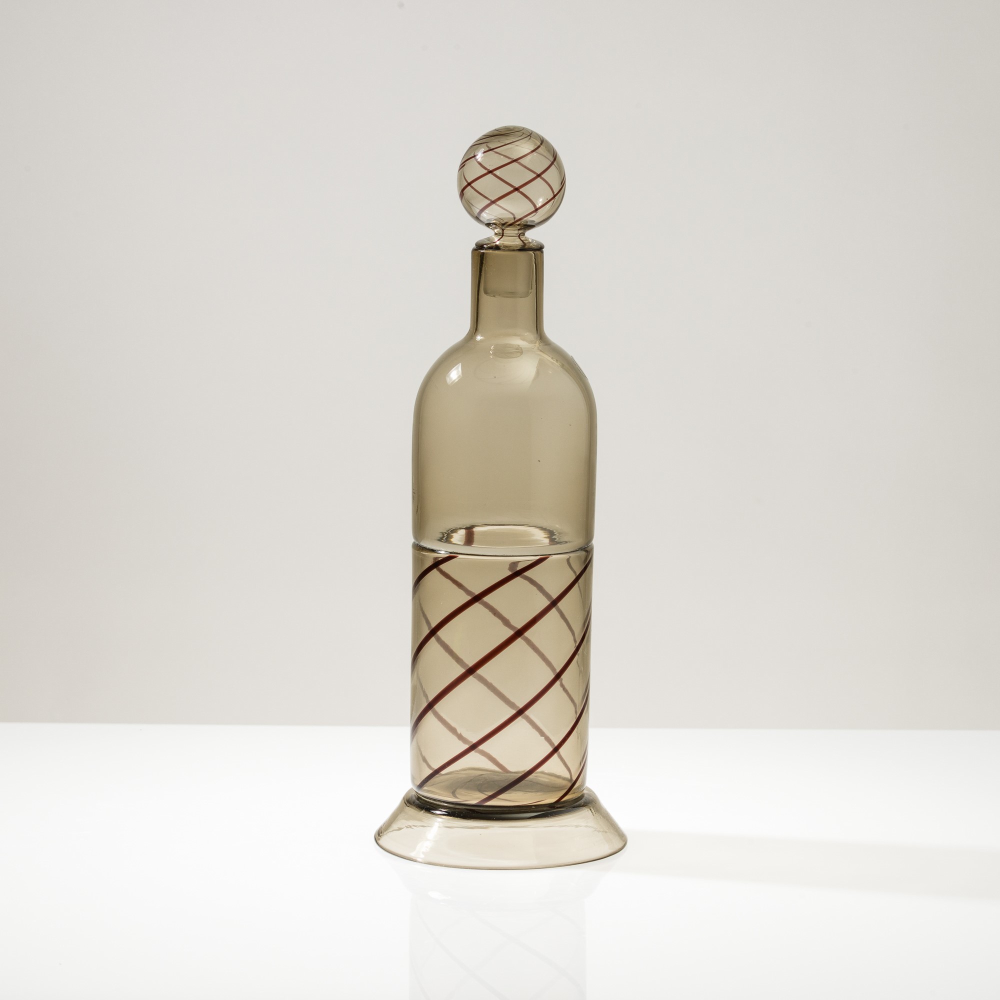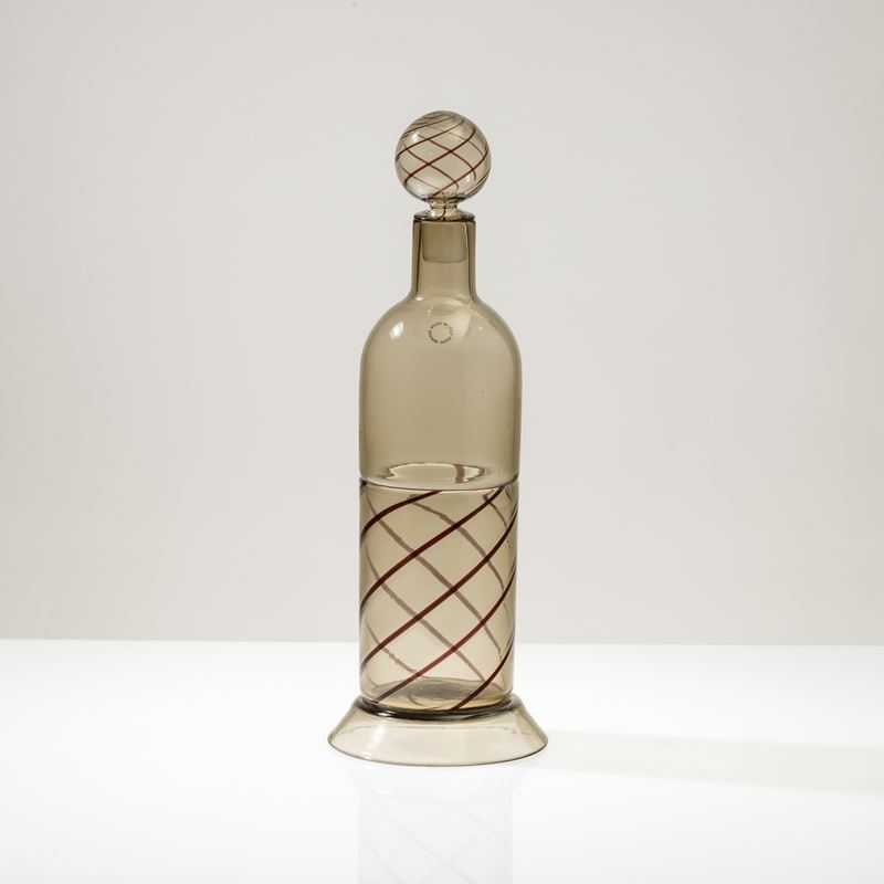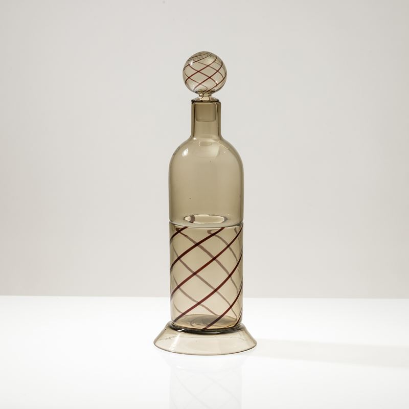 Bottiglia Uppsala in vetro soffiato a incalmo con decoro di canne a spirale. Tappo sferico.