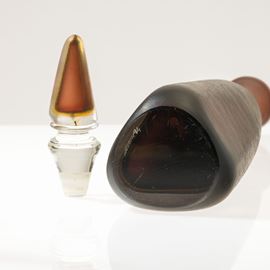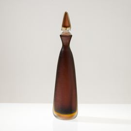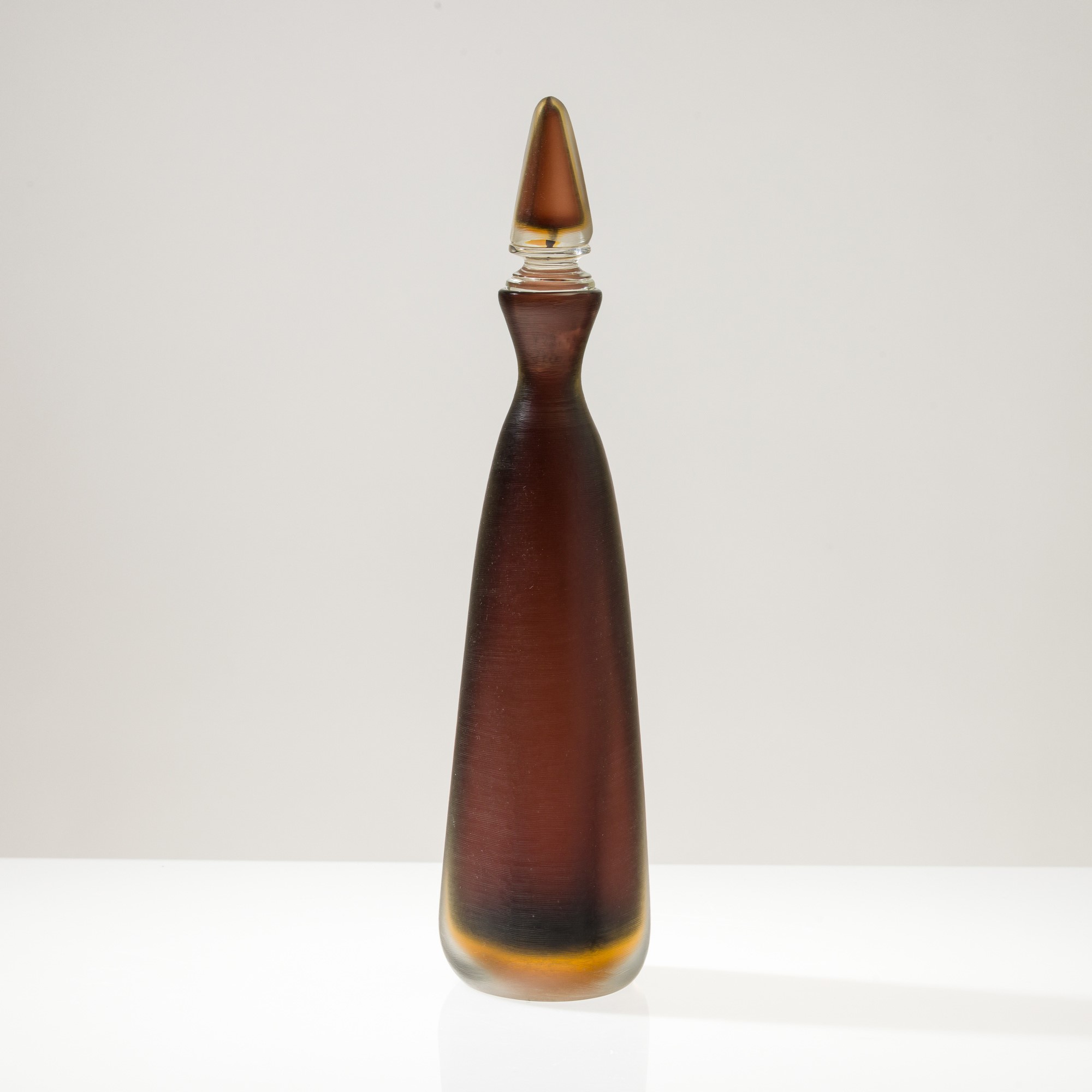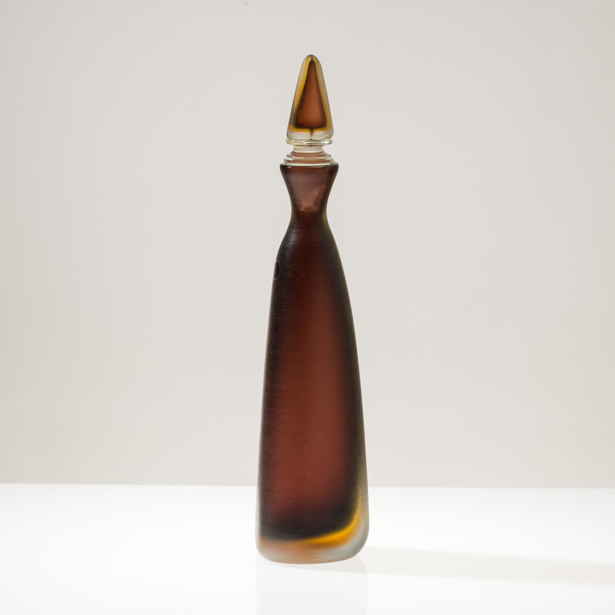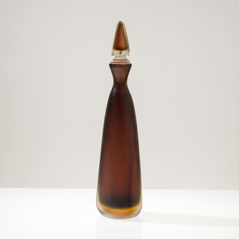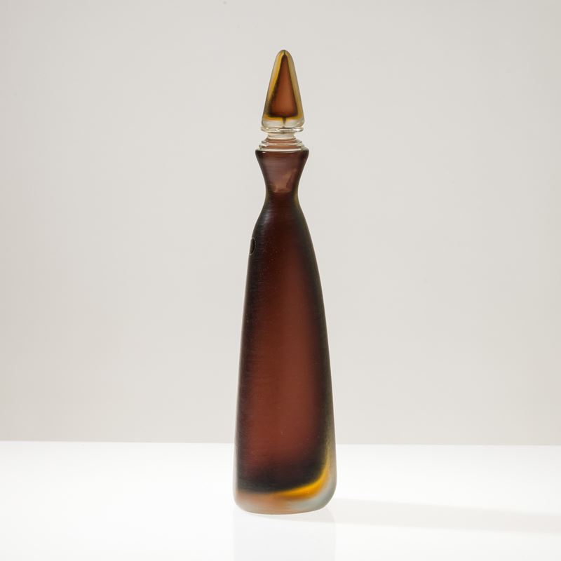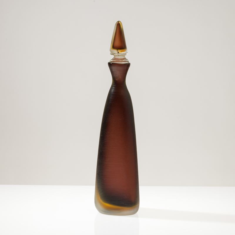 Bottiglia serie Incisi a sezione triangolare in vetro sommerso a due colori con superficie interamente lavorata alla mola.