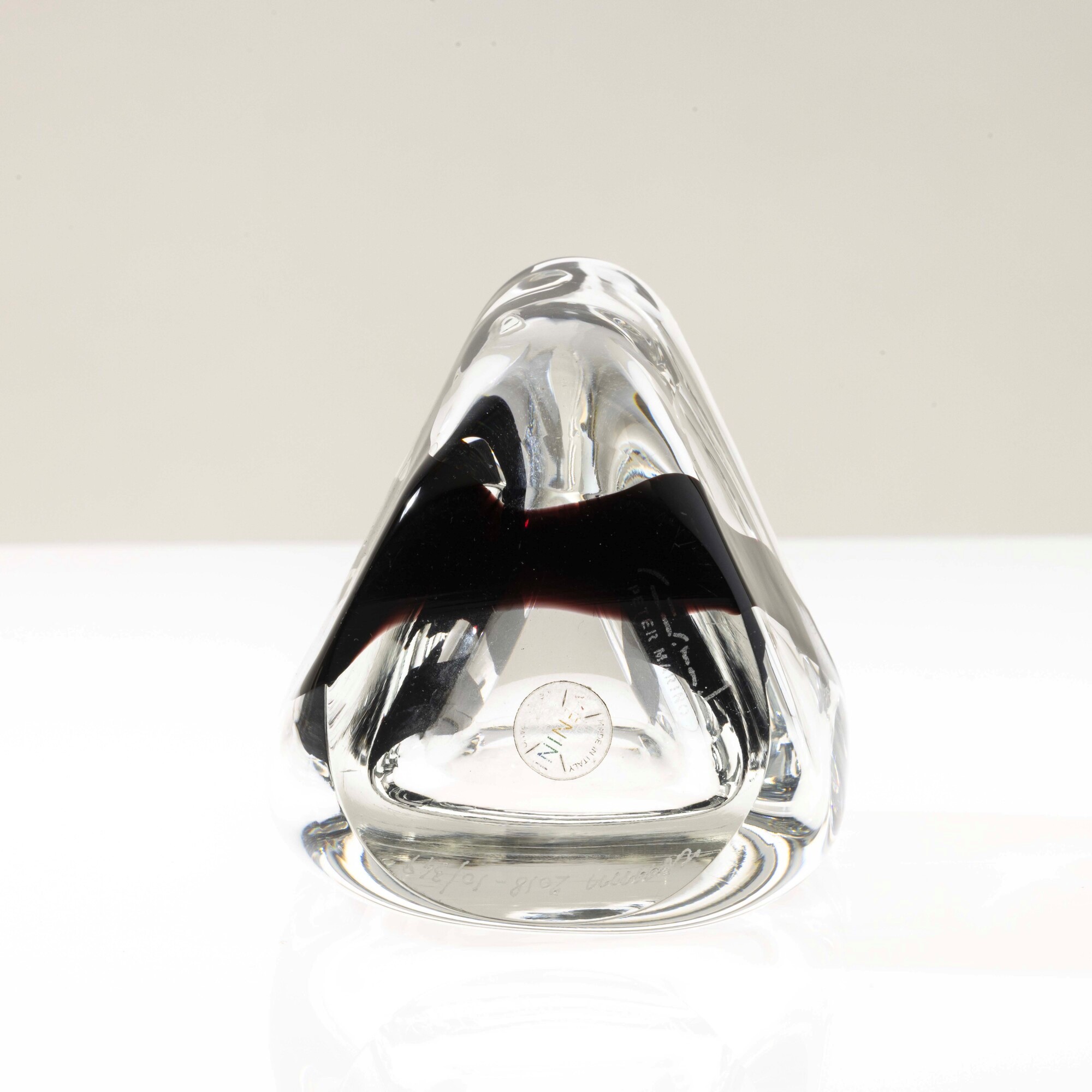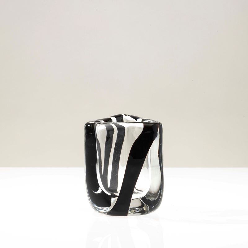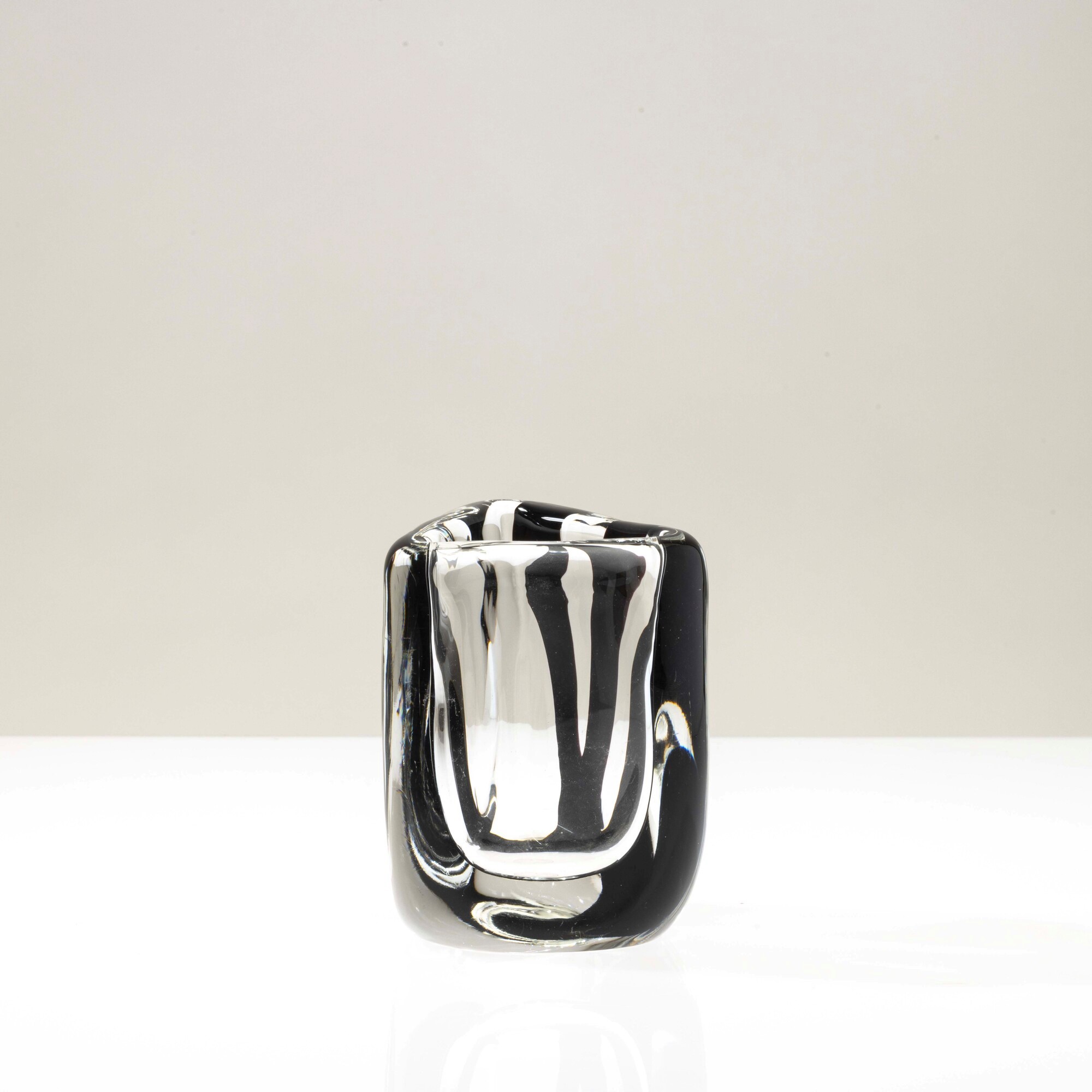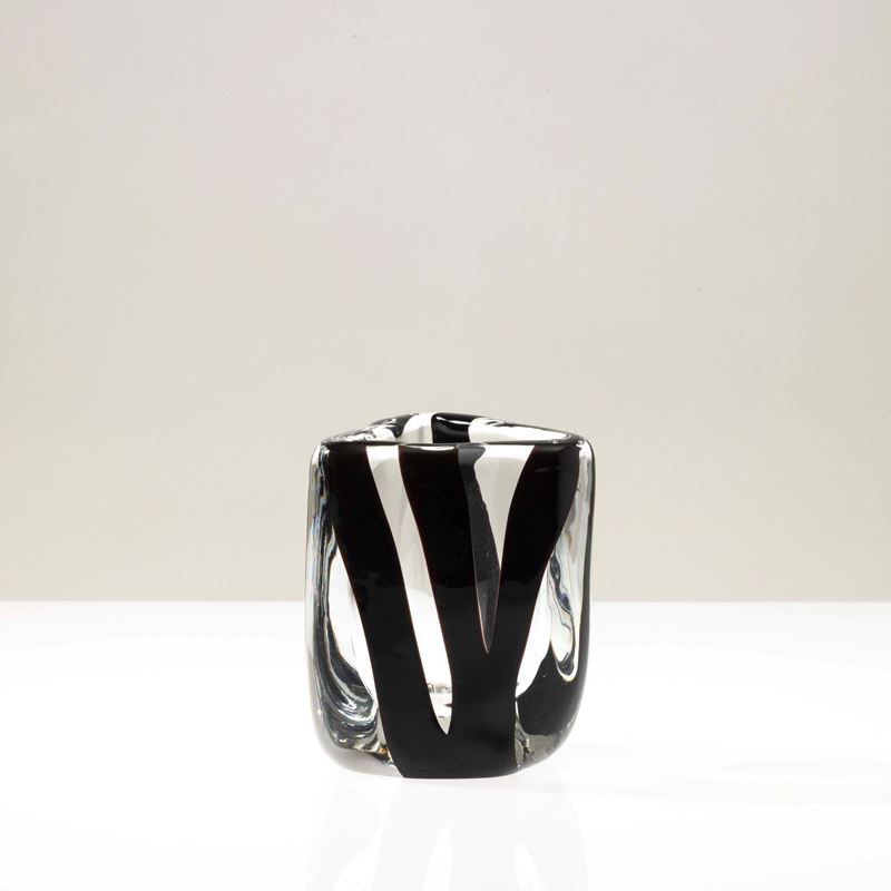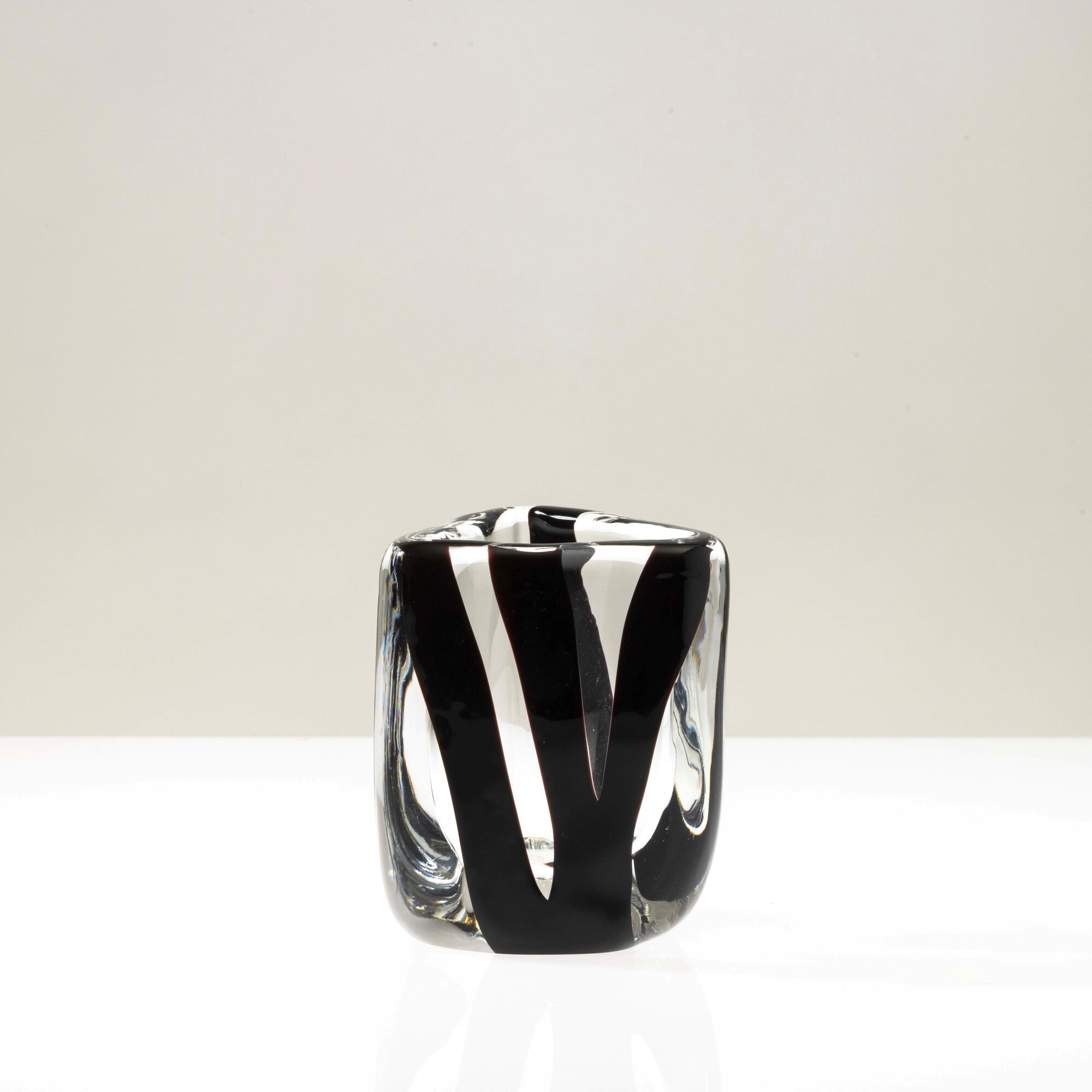Piccolo vaso serie Black Belt a prisma triangolare in vetro pesante cristallo con decoro di fasce in pasta vitrea nera.