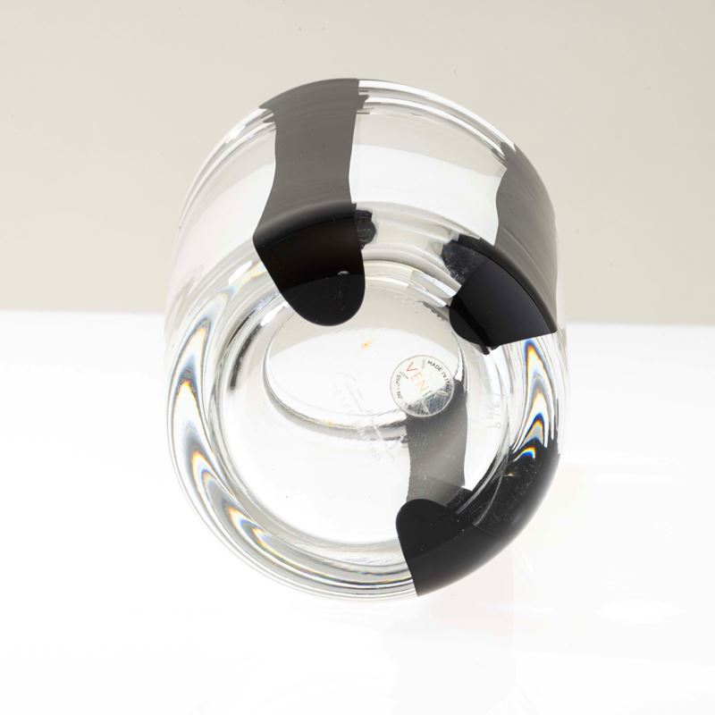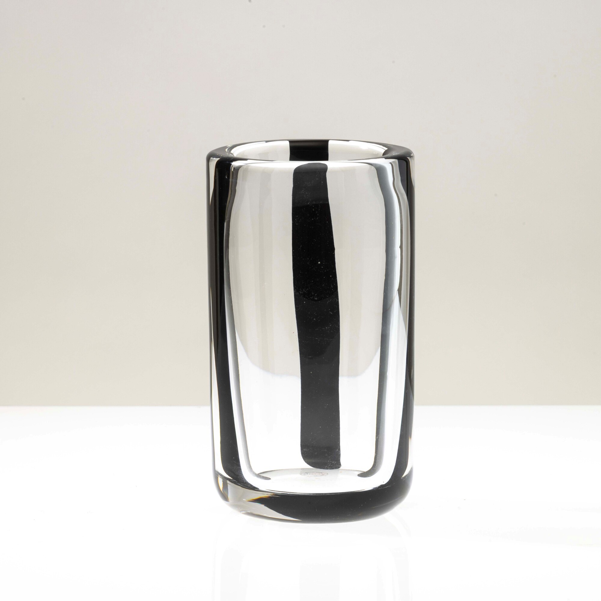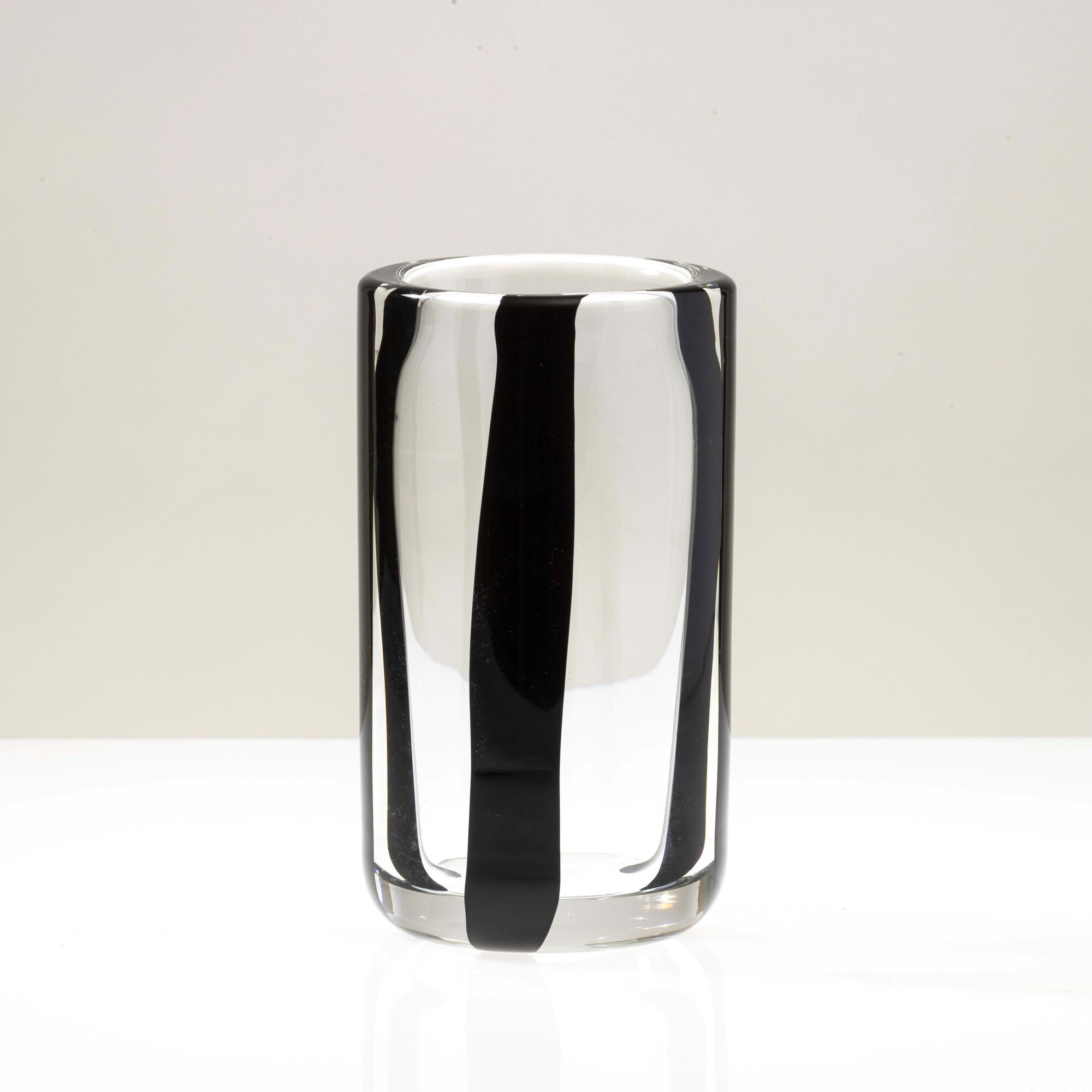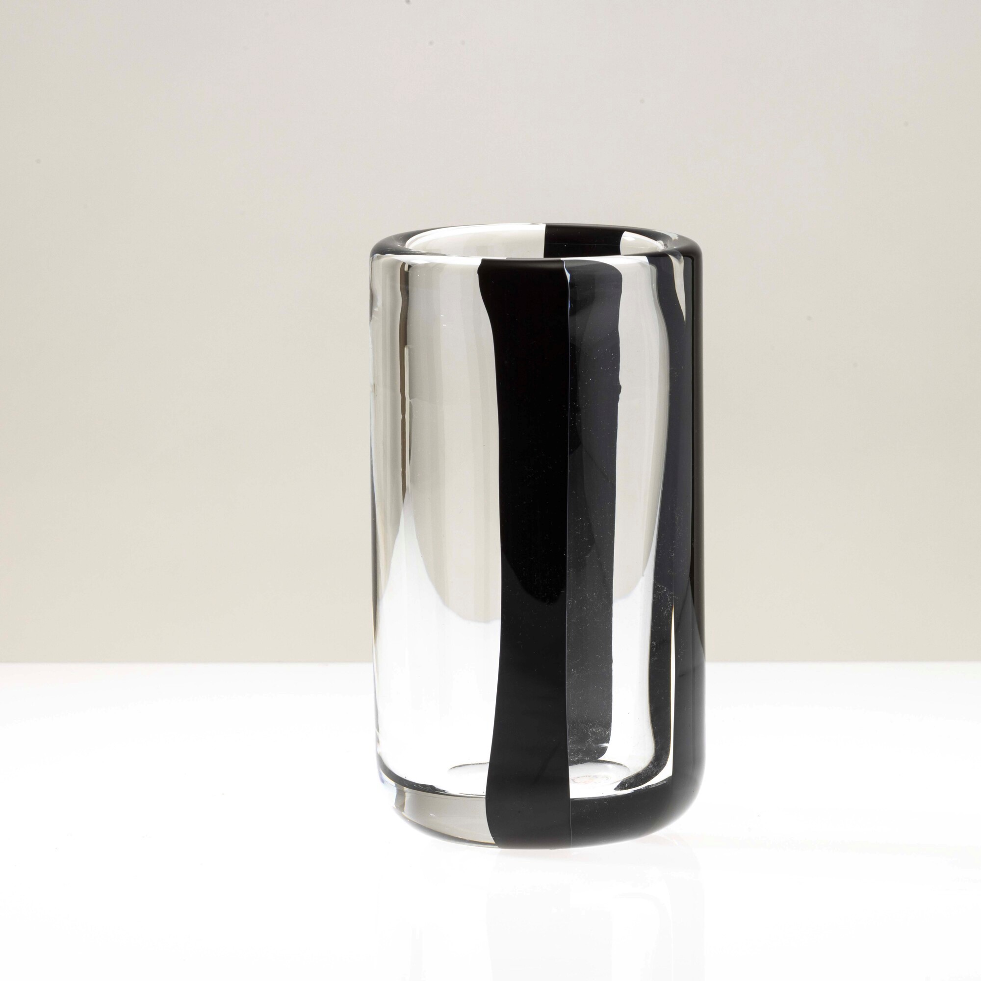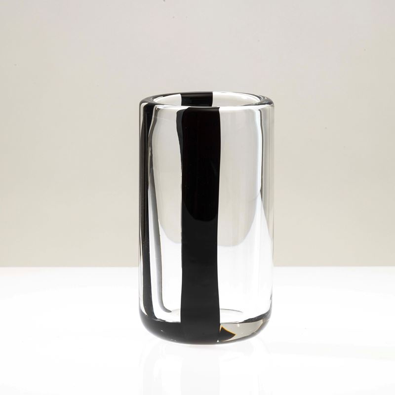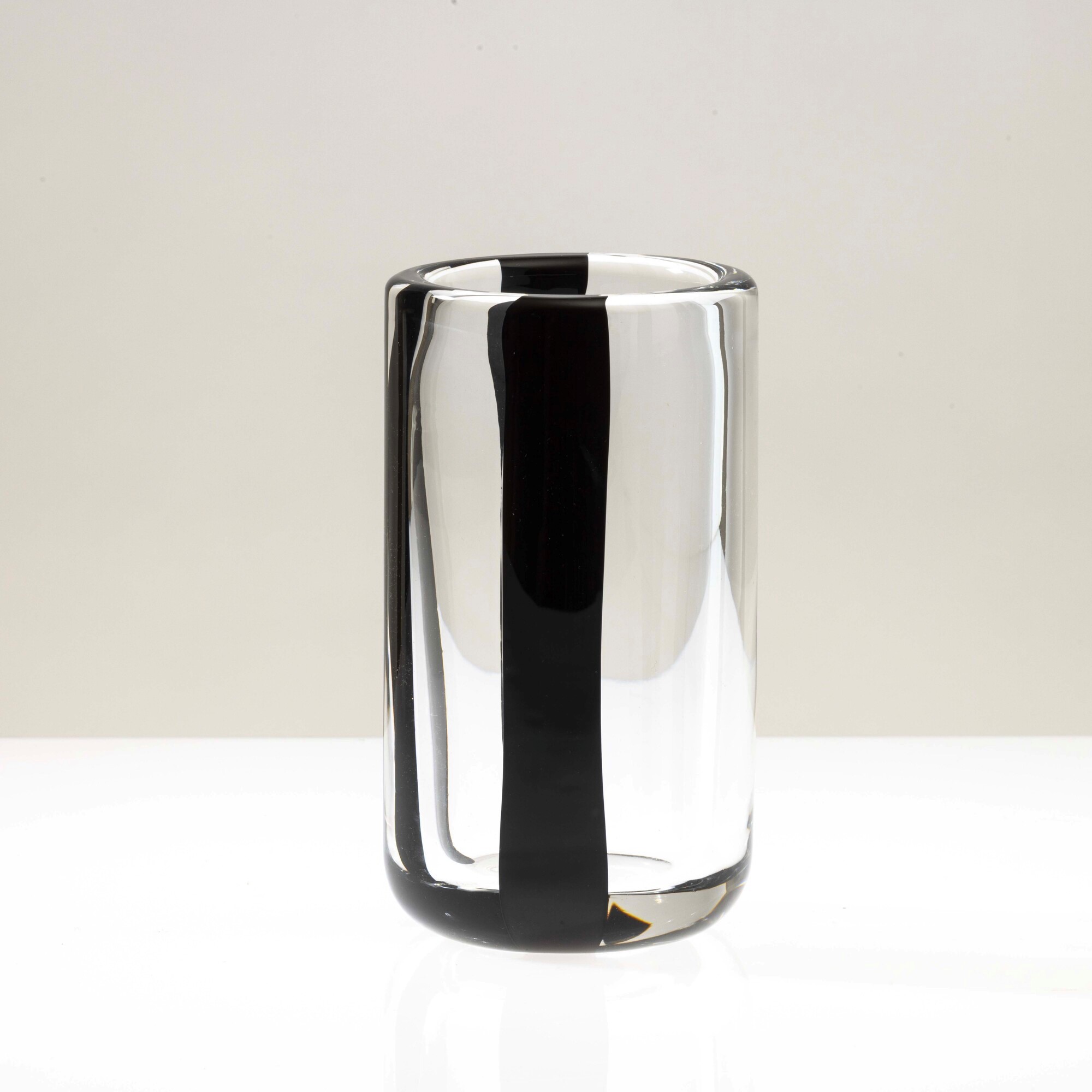 Vaso cilindrico serie Black Belt in vetro cristallo pesante con decoro di fasce verticali in pasta vitrea nera.
