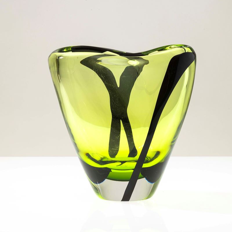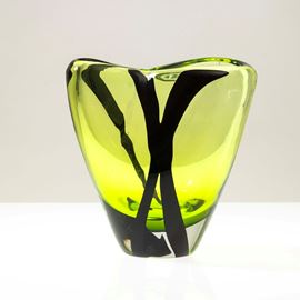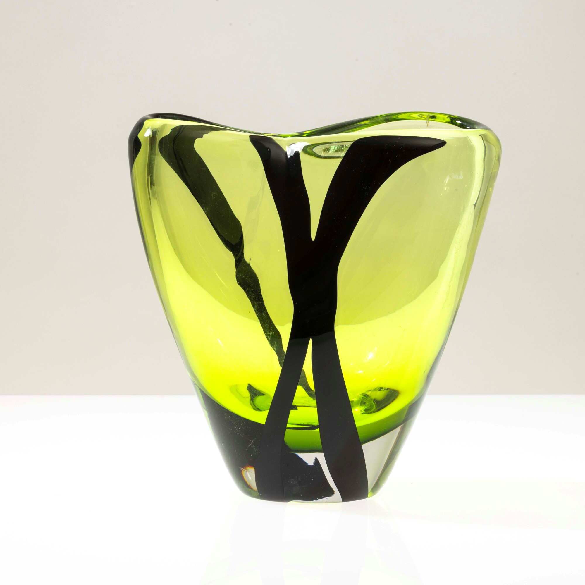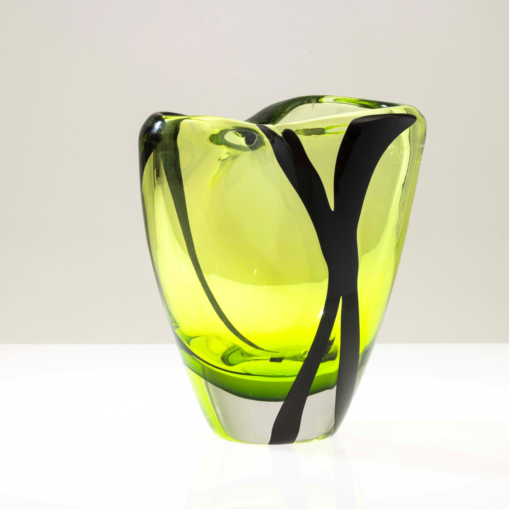 Vaso troncoconico a sezione ovale con bocca pinzata serie Black Belt in vetro sommerso verdino con decoro di fasce in pasta vitrea nera.