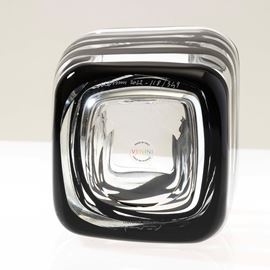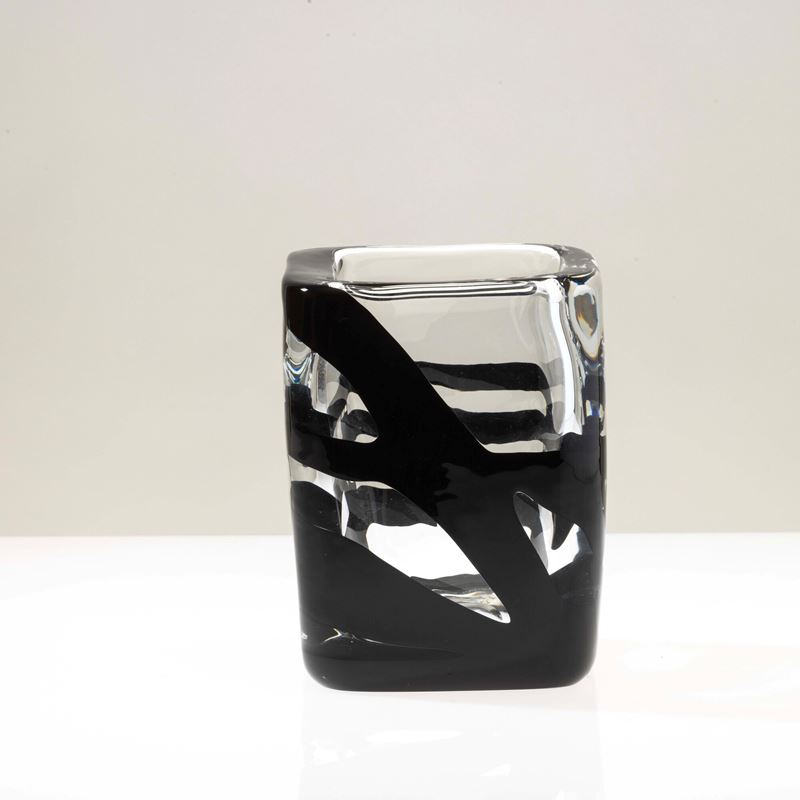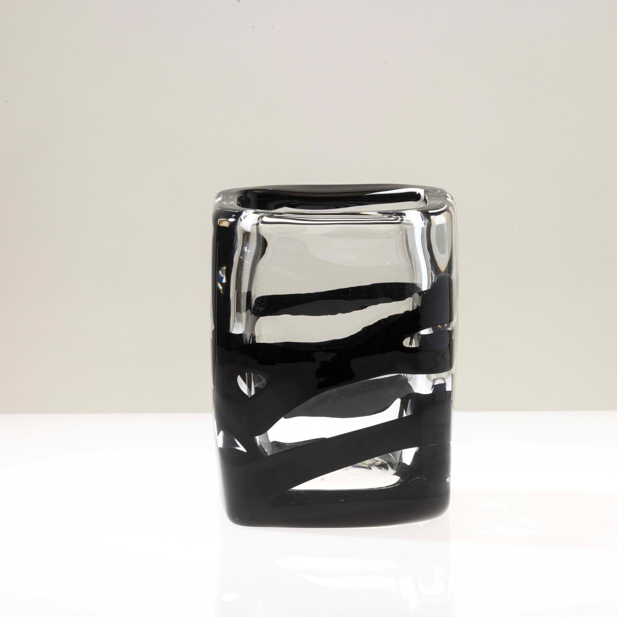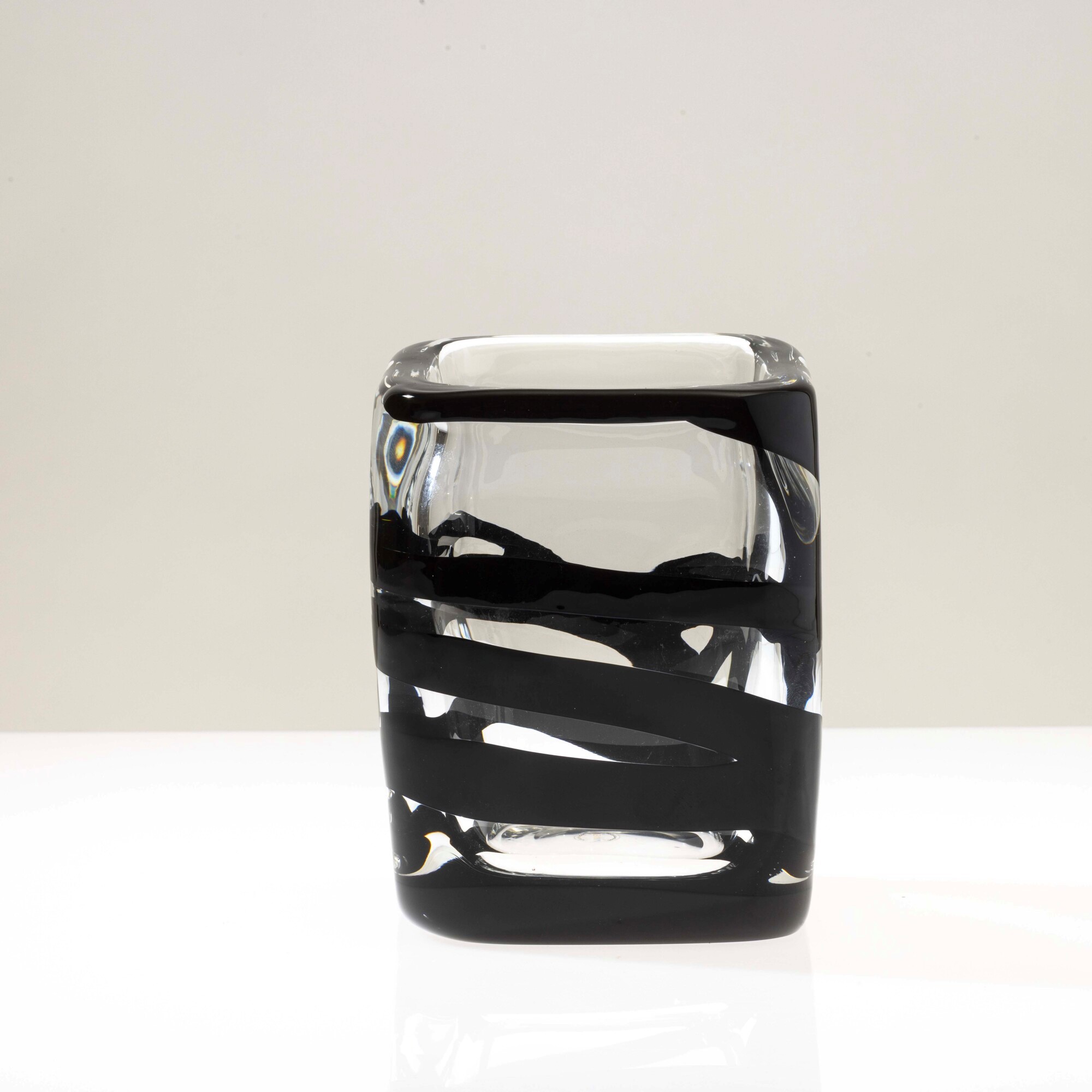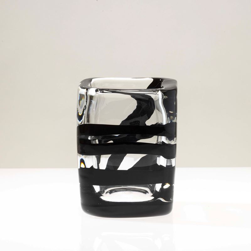 Vaso serie Black Belt a sezione quadrata in vetro pesante cristallo con decoro di fasce in pasta vitrea nera.