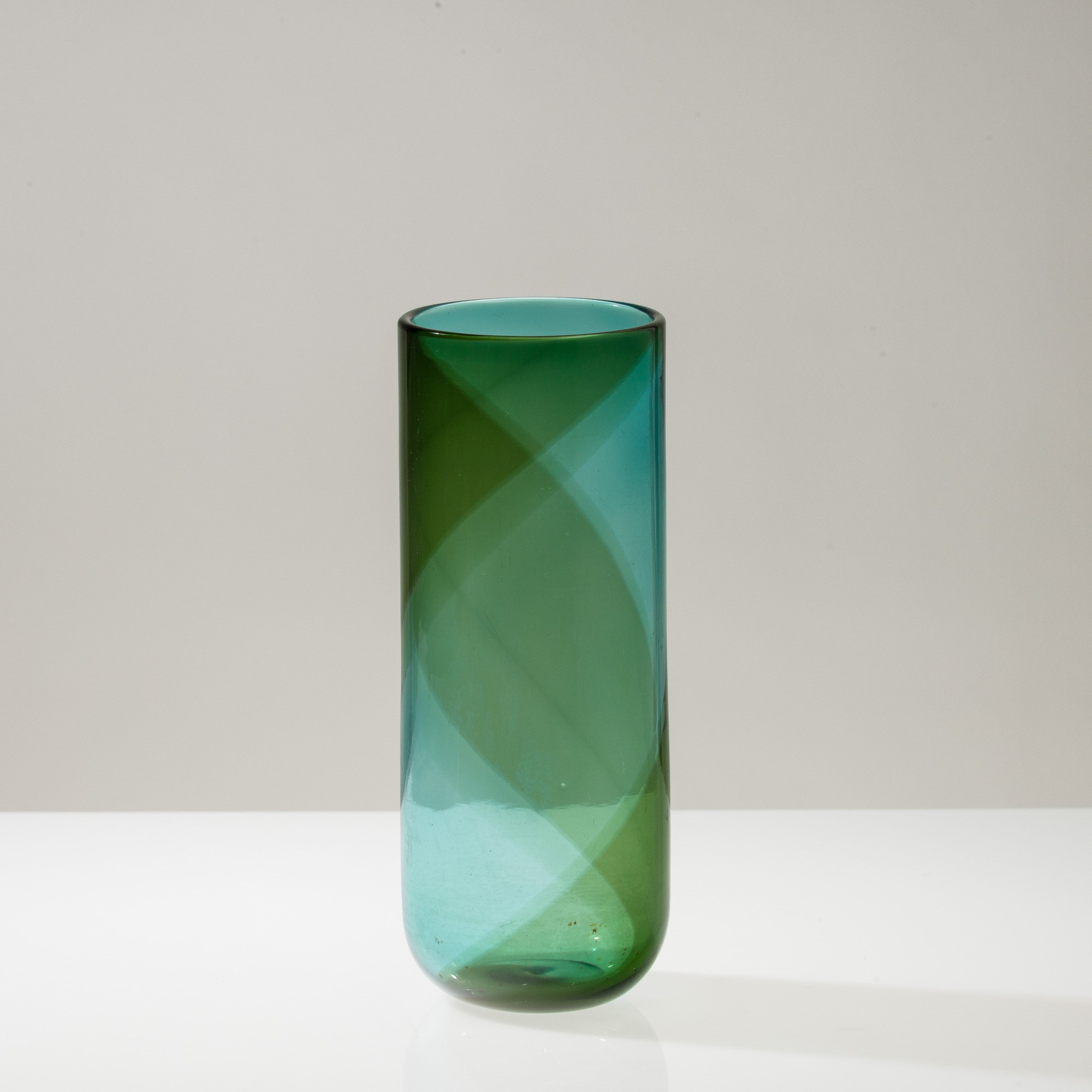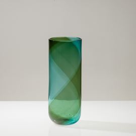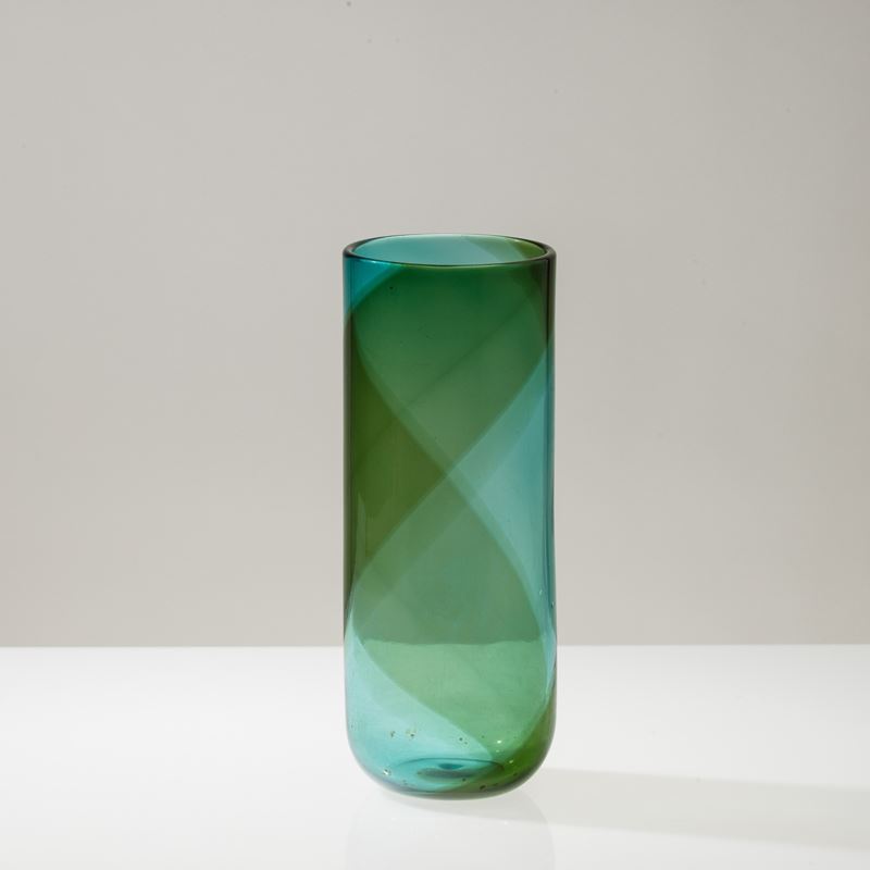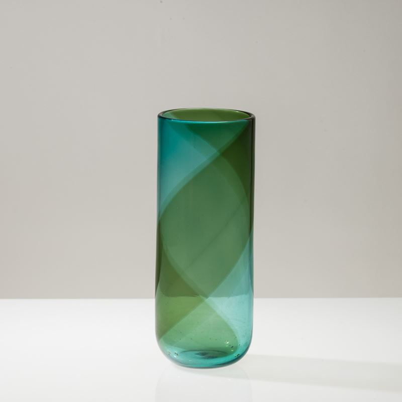 Vaso cilindrico serie Coreani in vetro soffiato con decoro di fasce a spirale adriatico verde mela.