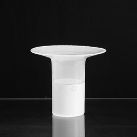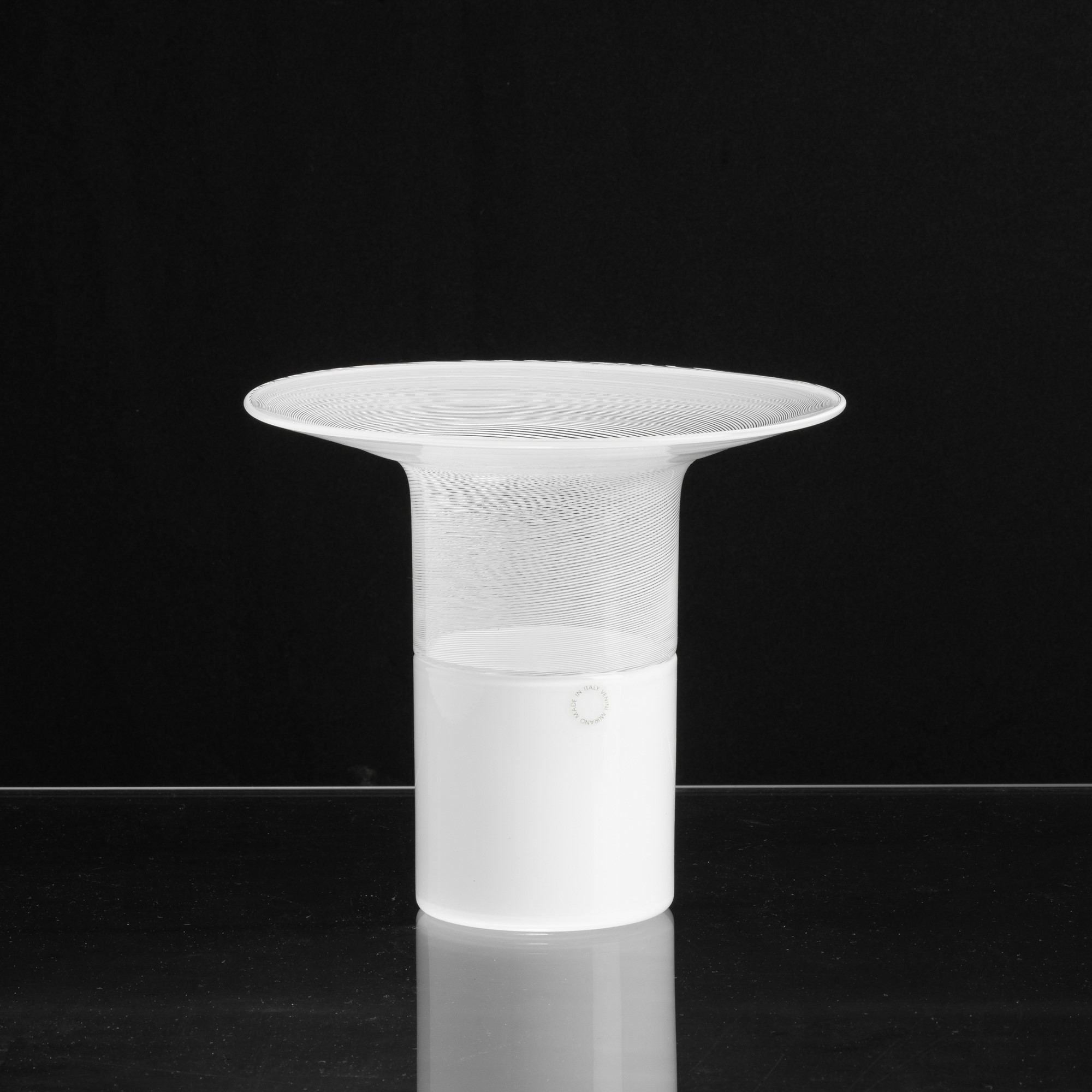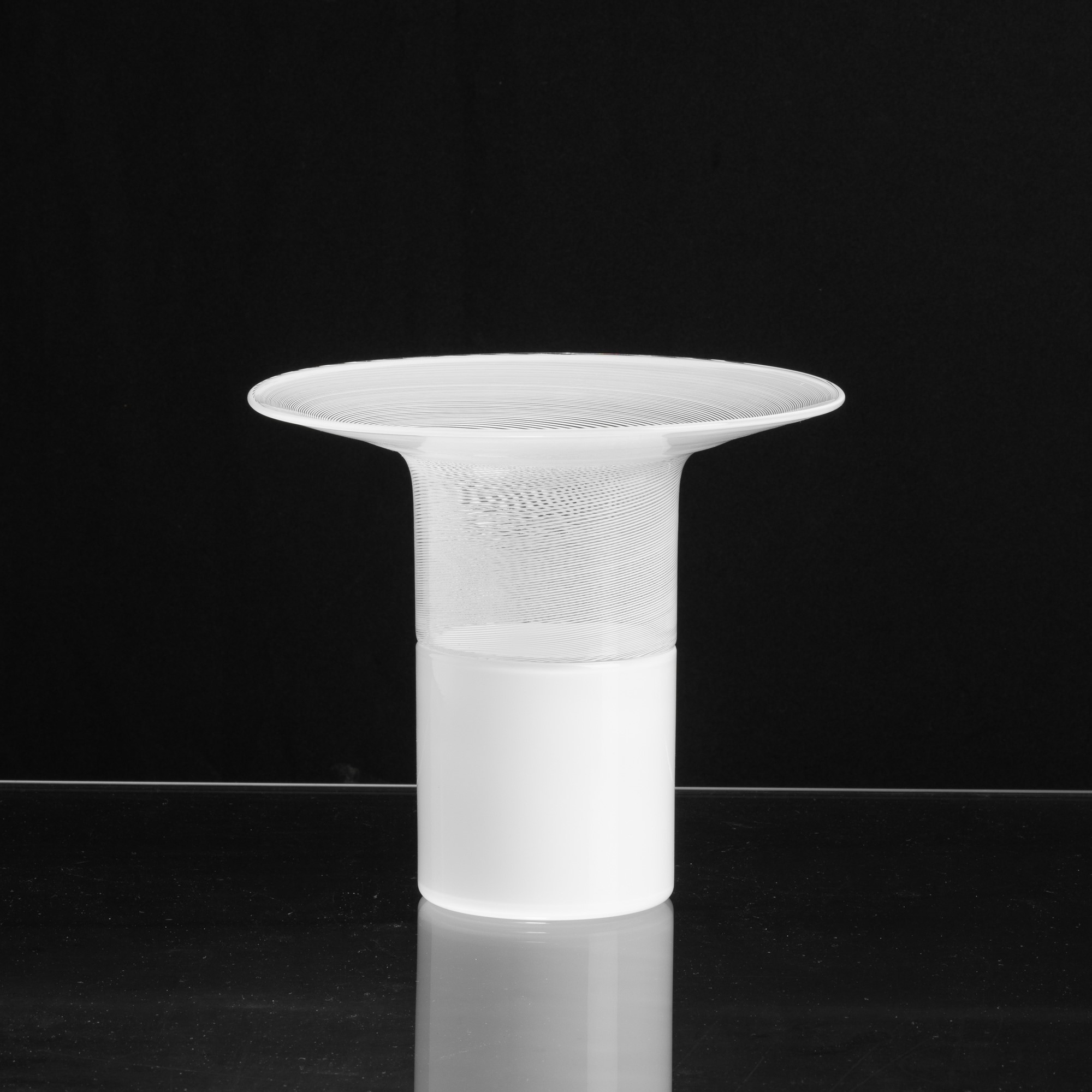 Vaso cilindrico serie Filigrane di Tapio in vetro soffiato a mezza filigrana con base a incalmo lattimo.