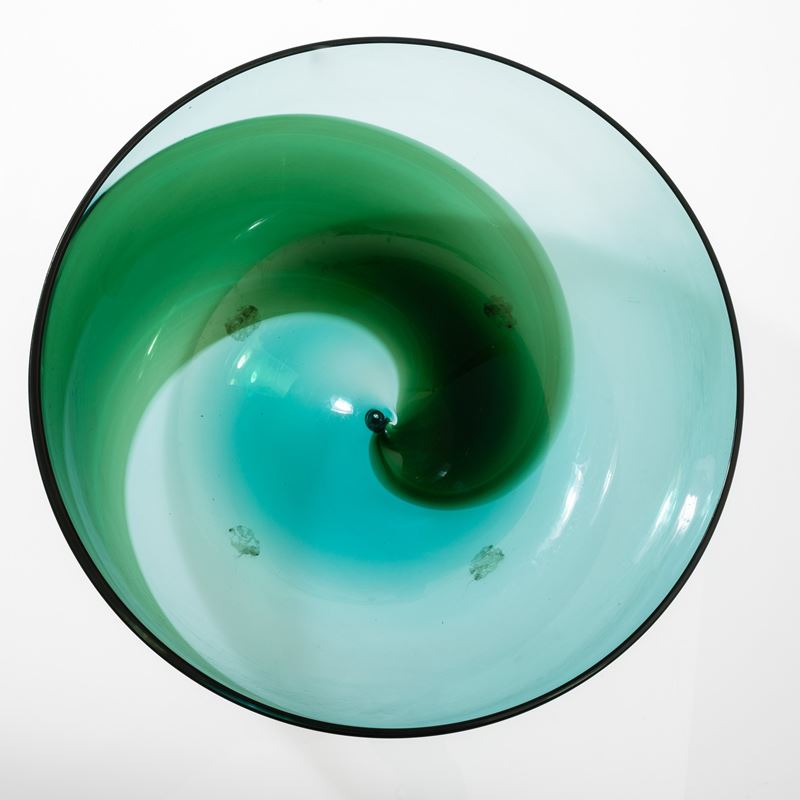 Coppa serie Coreani in vetro soffiato con decoro di fasce incrociate adriatico e verde mela.