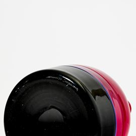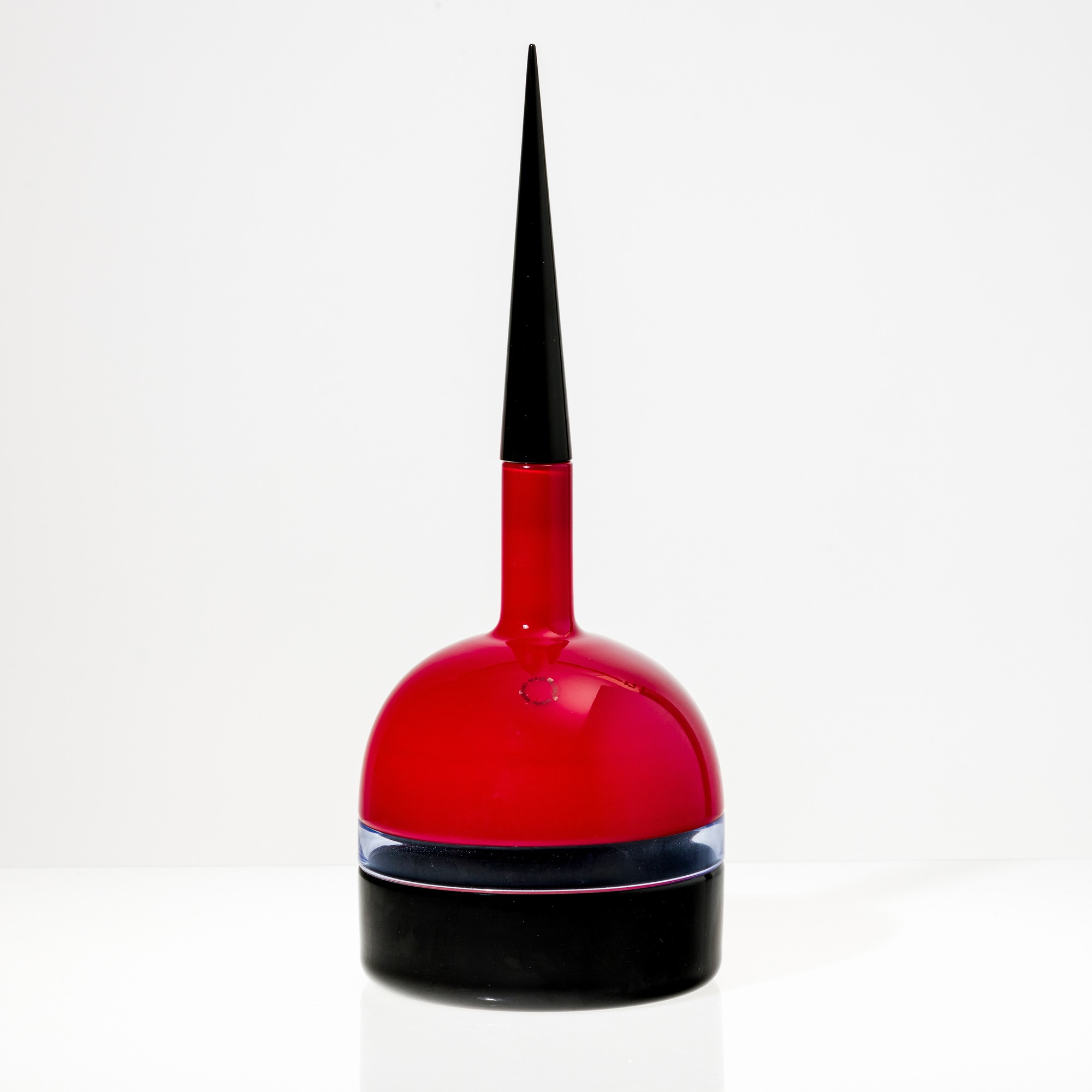 Bottiglia Aava in vetro soffiato a duplice incalmo nei colori rosso, bluino e nero con alto tappo conico.