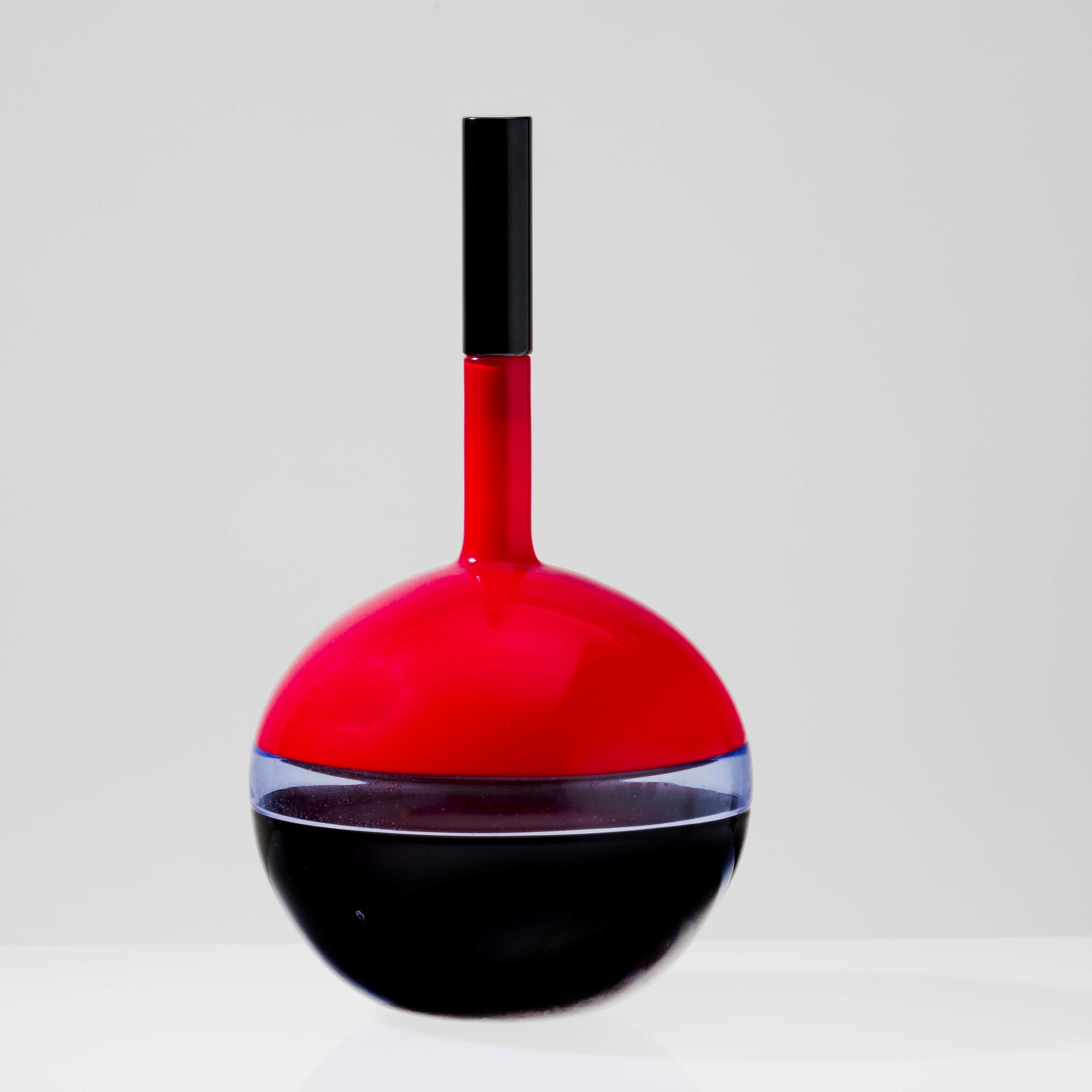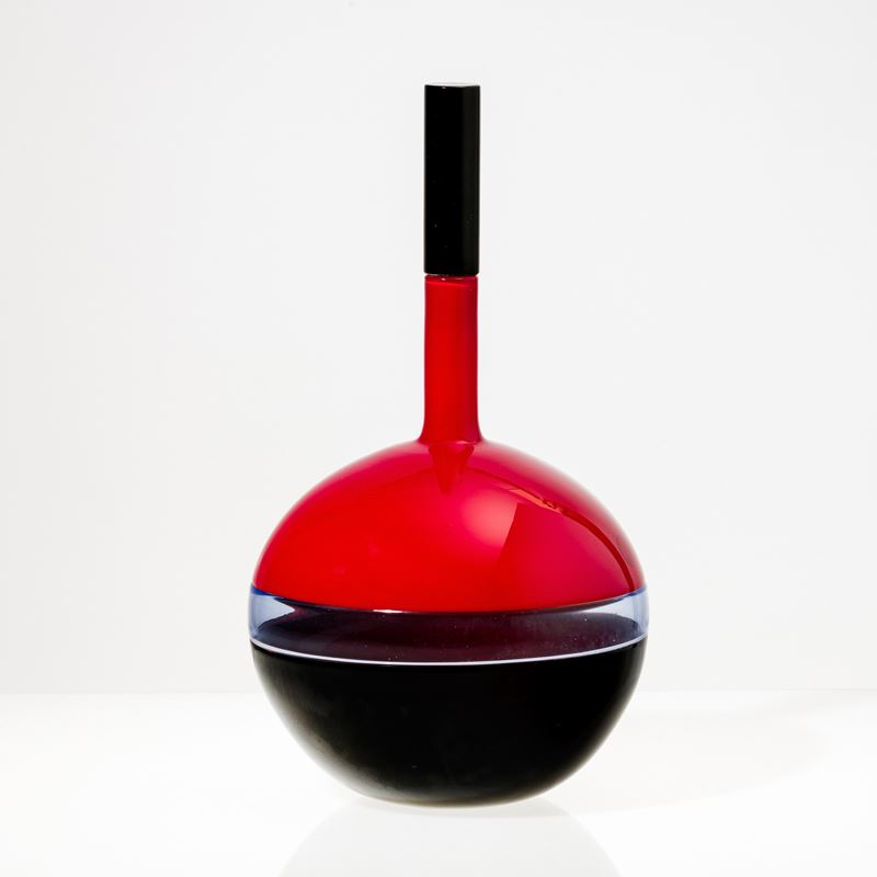 Bottiglia Vire in vetro soffiato a duplice incalmo nei colori rosso, bluino e nero con alto collo e tappo cilindrico nero.