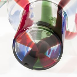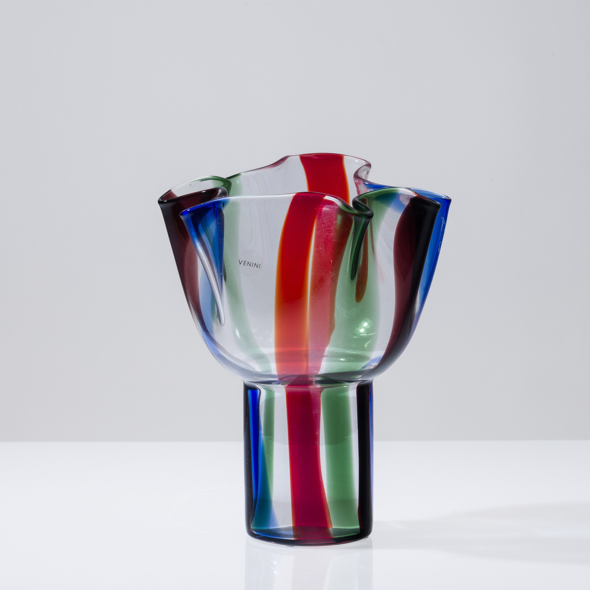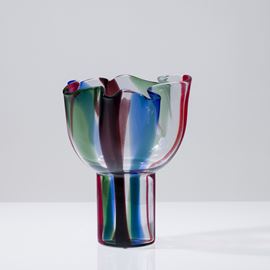 Vaso Kukinto in vetro soffiato a fazzoletto su alto piede con decoro di fasce policrome.