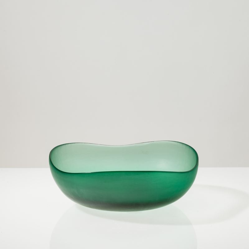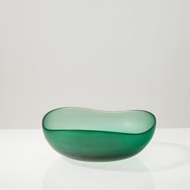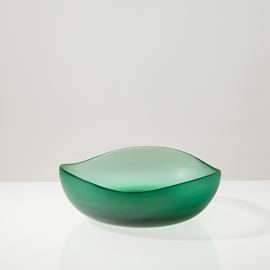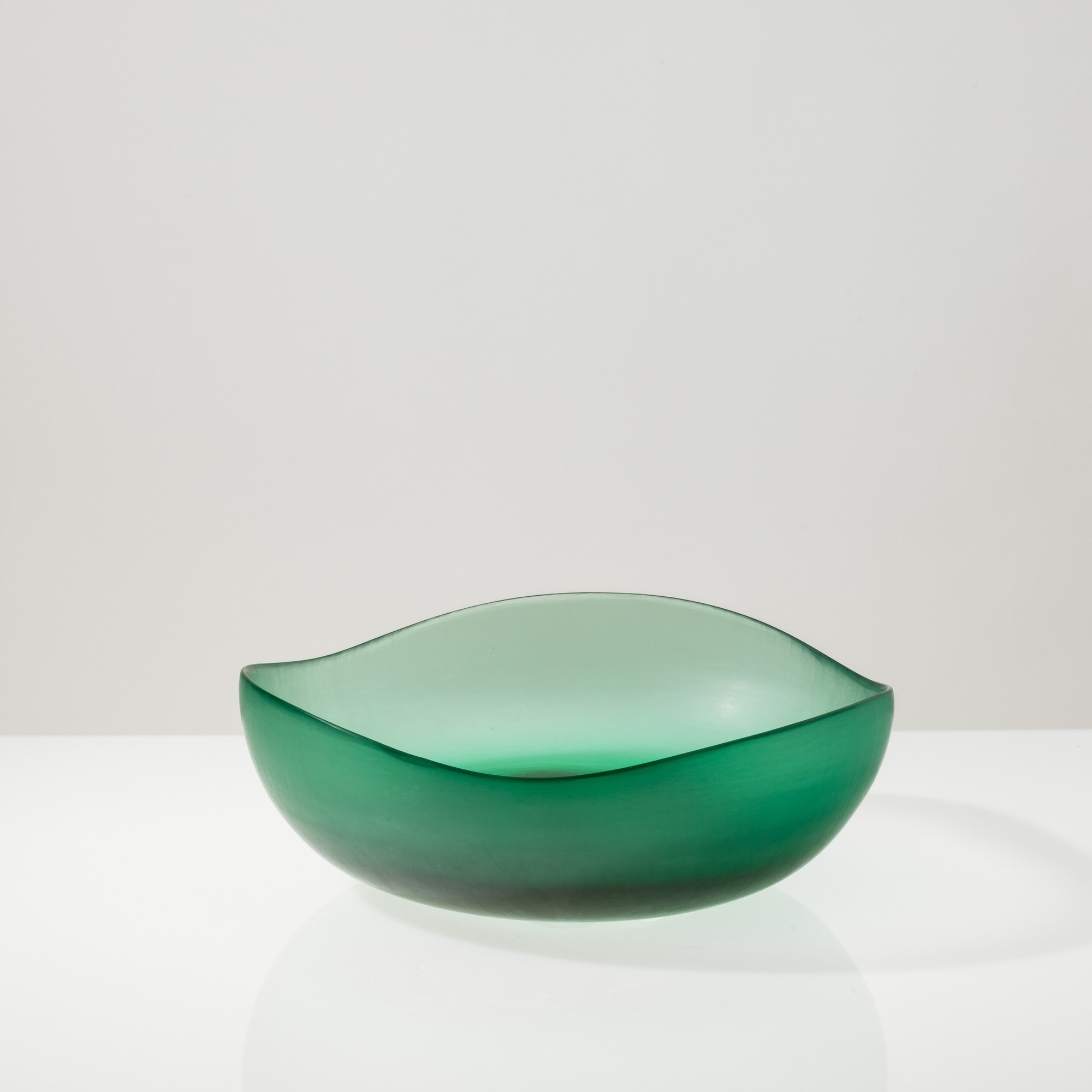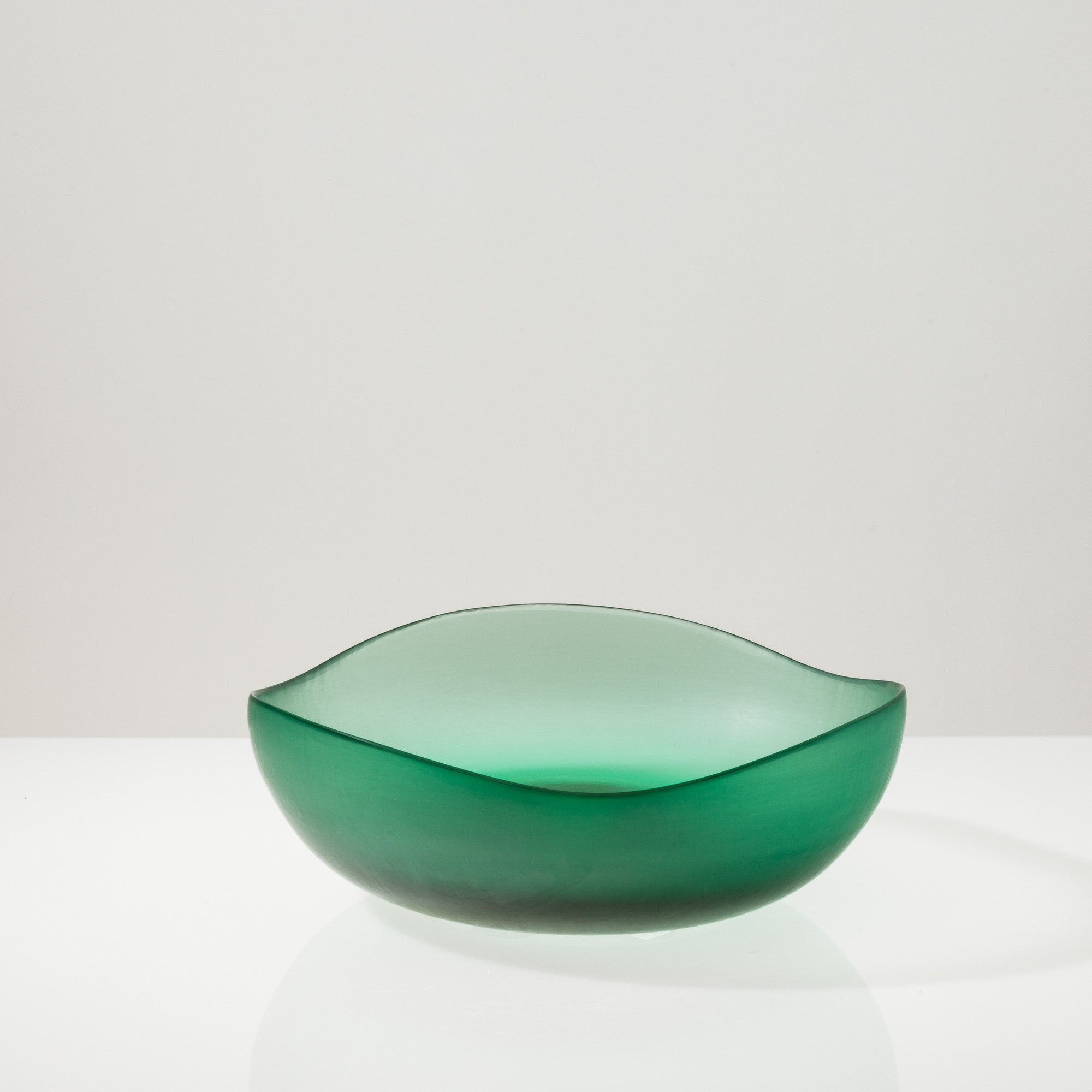Coppa serie Battuti con bordo ondulato in vetro pesante verdognolo. Superficie interamente lavorata alla mola.