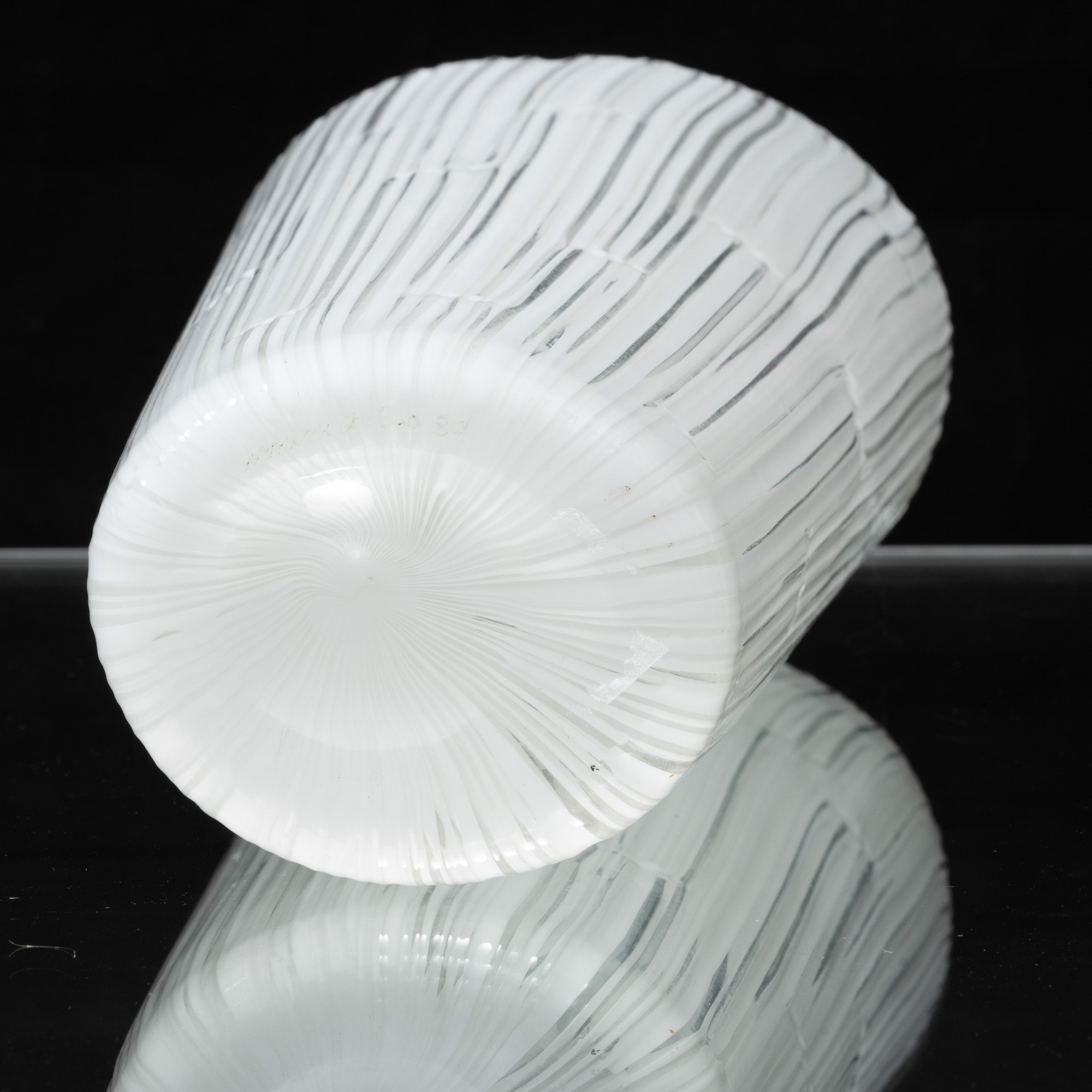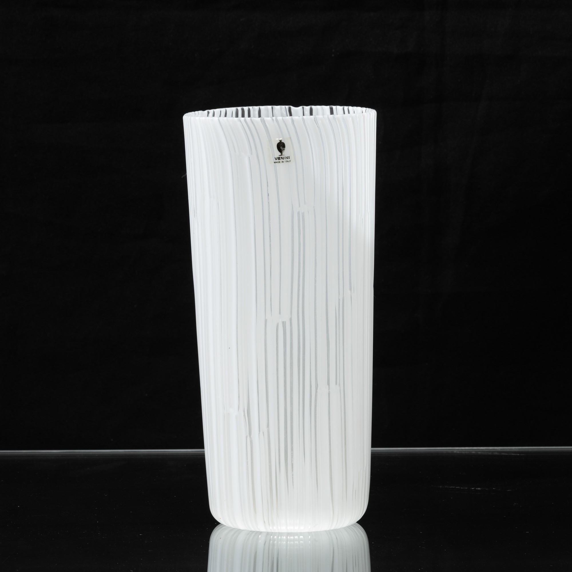 Vaso troncoconico a sezione ovale serie Pioggia in vetro soffiato con decoro di canne cristallo e lattimo.