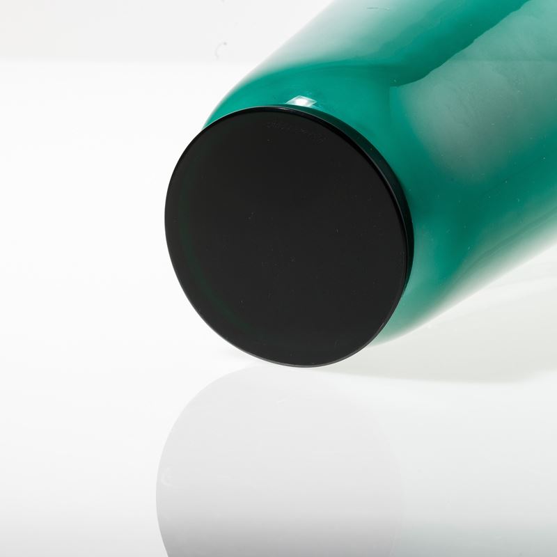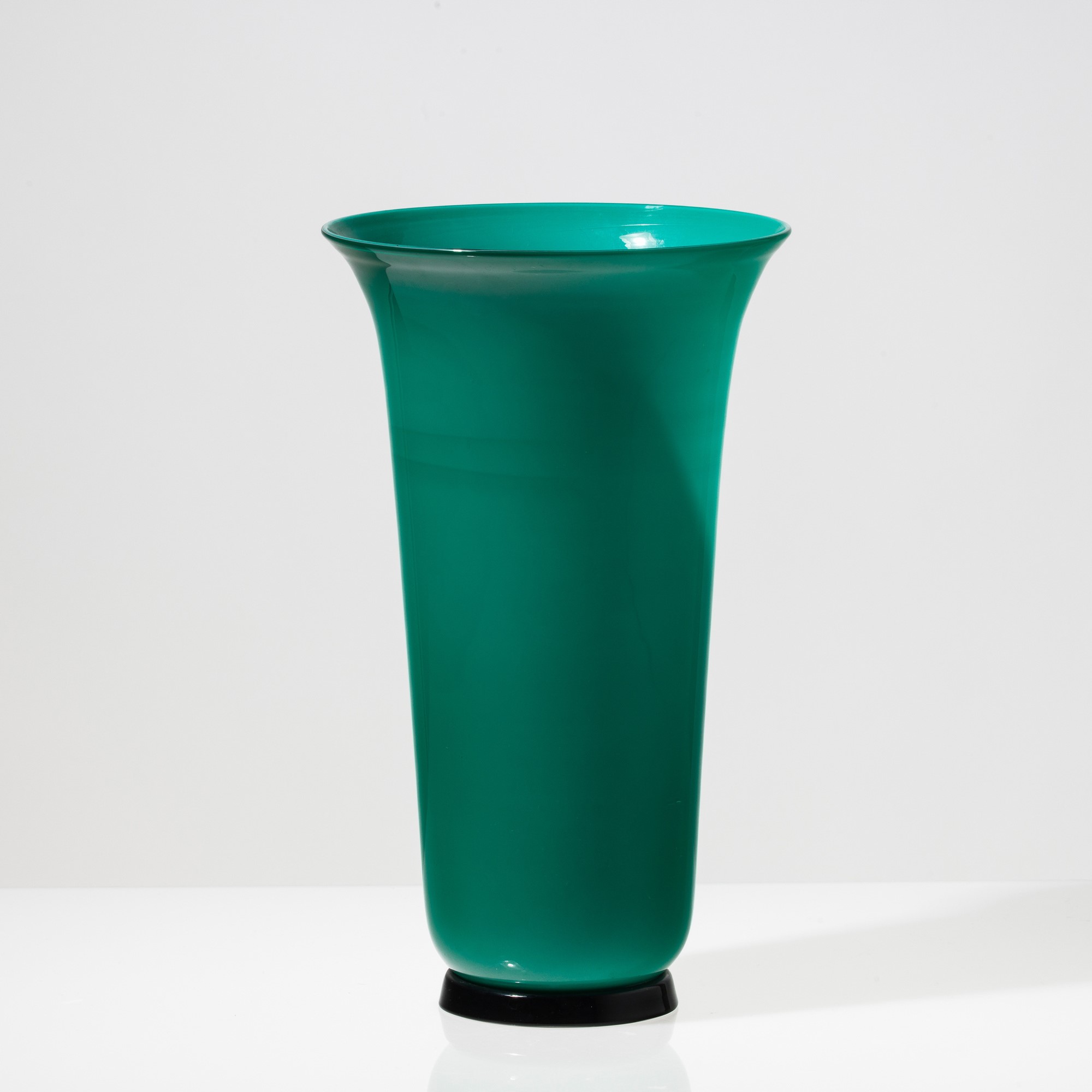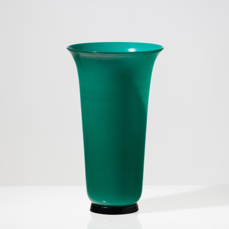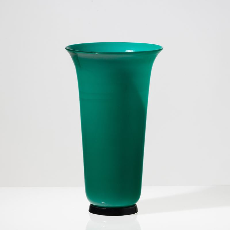 Vaso serie Anni Trenta in vetro soffiato opalino verde su piede troncoconico nero. Firma a punta Venini 91.