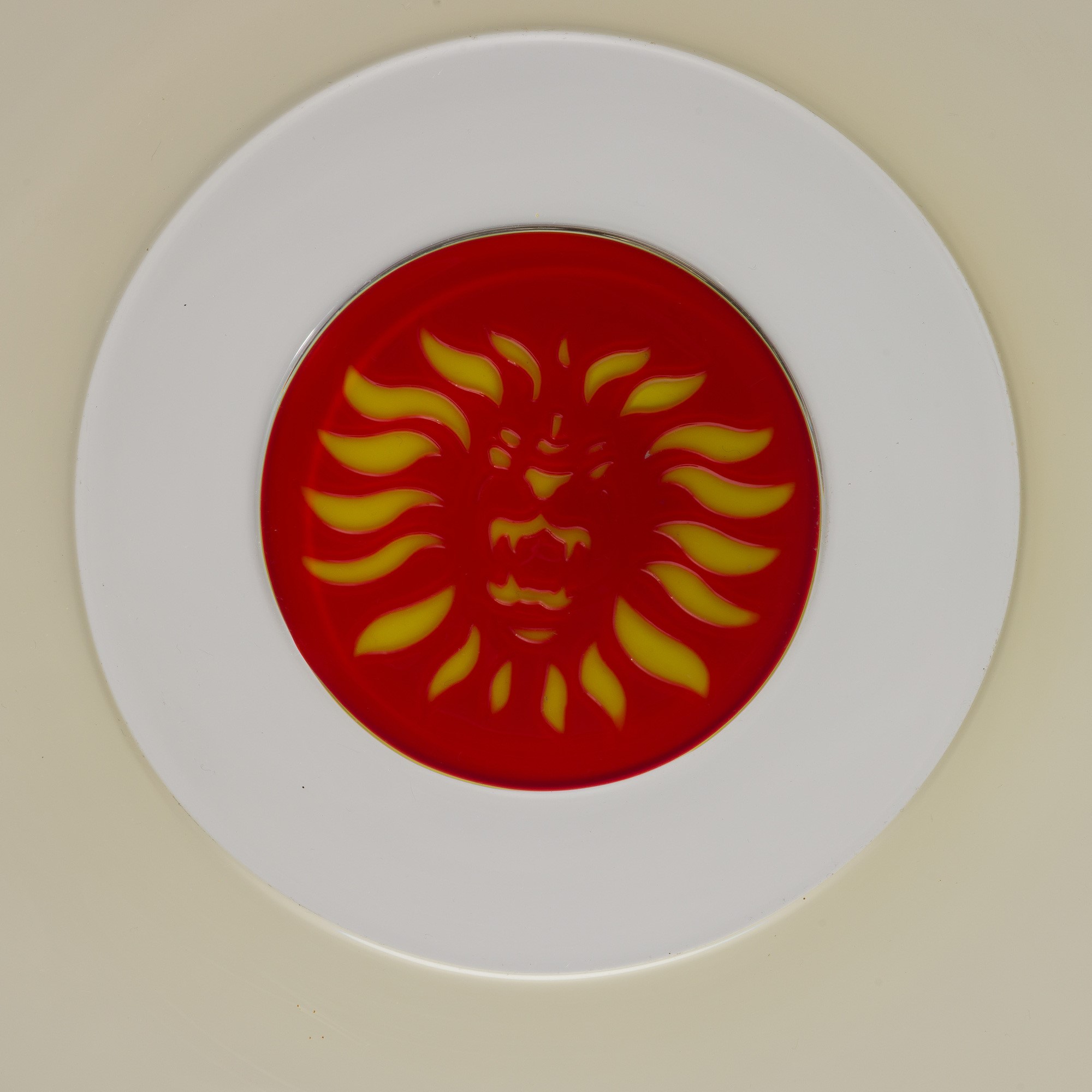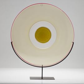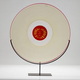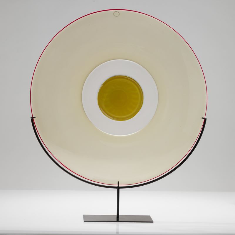 Piatto commemorativo per il Moro di Venezia in vetro soffiato con decoro di murrina centrale e filo rosso sul bordo. Firma a punta Venini 1992 Il Moro di Venezia 115/300 e vecchia etichetta.